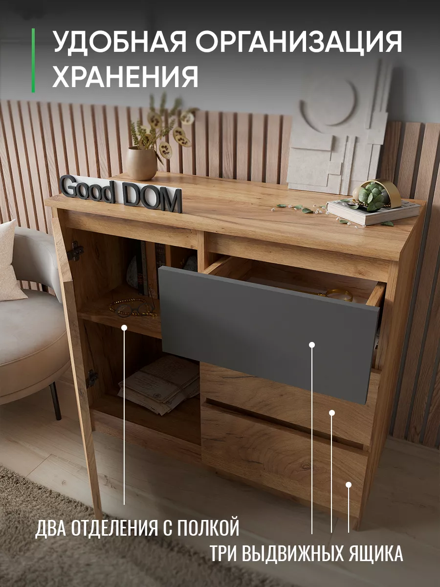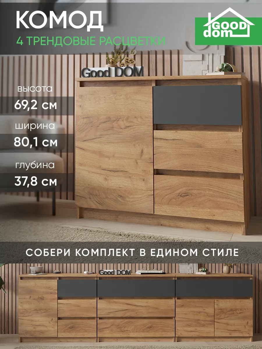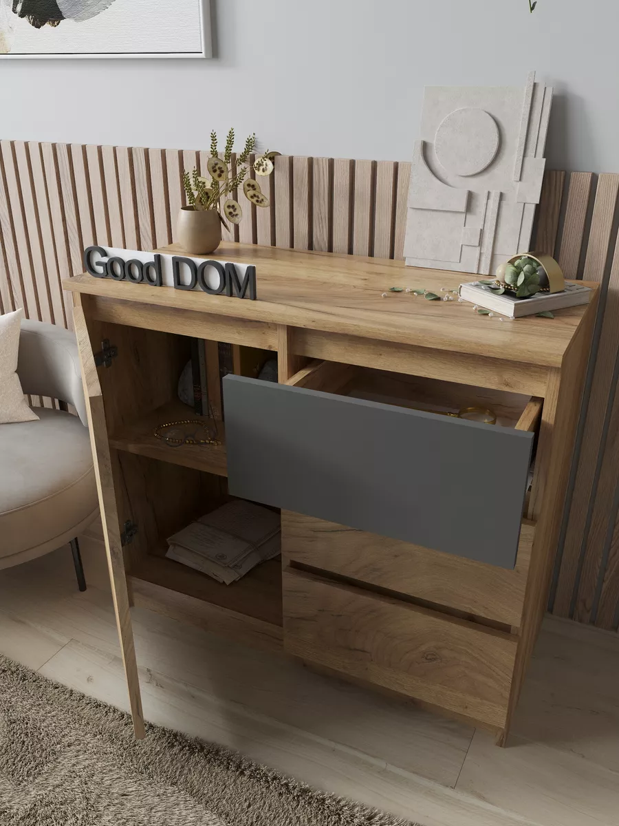 Комод с тремя выдвижными ящиками и отделением с полкой. Специально разработанная современная модель в трендовых цветах от надежного производителя мебели Good Дом. Комод - удобная и функциональная вещь в любом помещении.