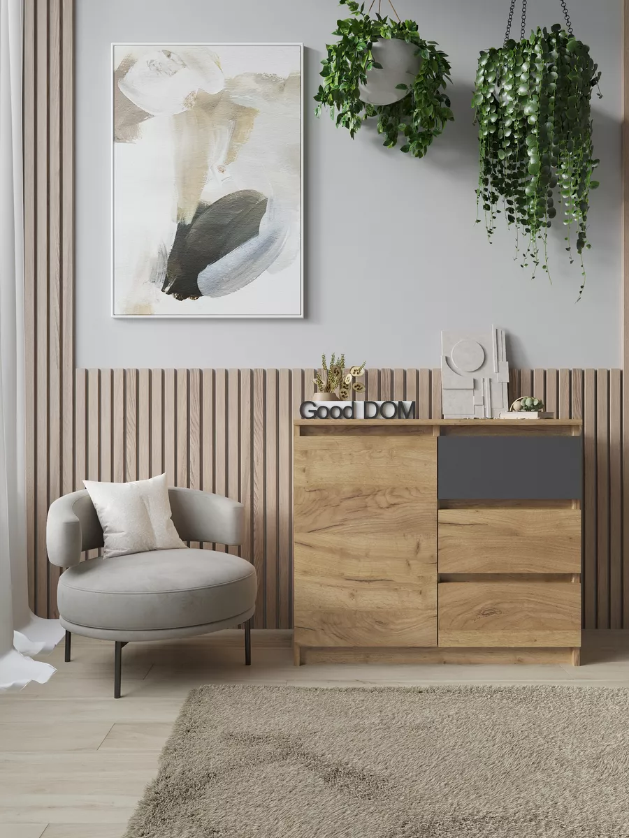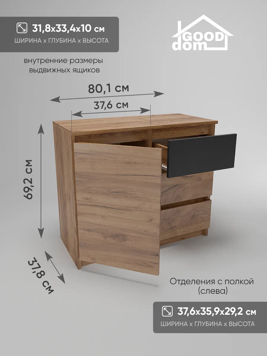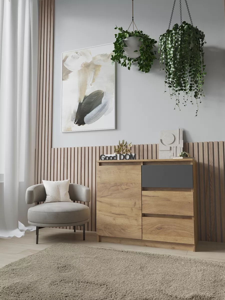 Комод с тремя выдвижными ящиками и отделением с полкой. Специально разработанная современная модель в трендовых цветах от надежного производителя мебели Good Дом. Комод - удобная и функциональная вещь в любом помещении.