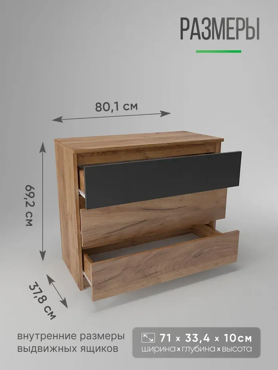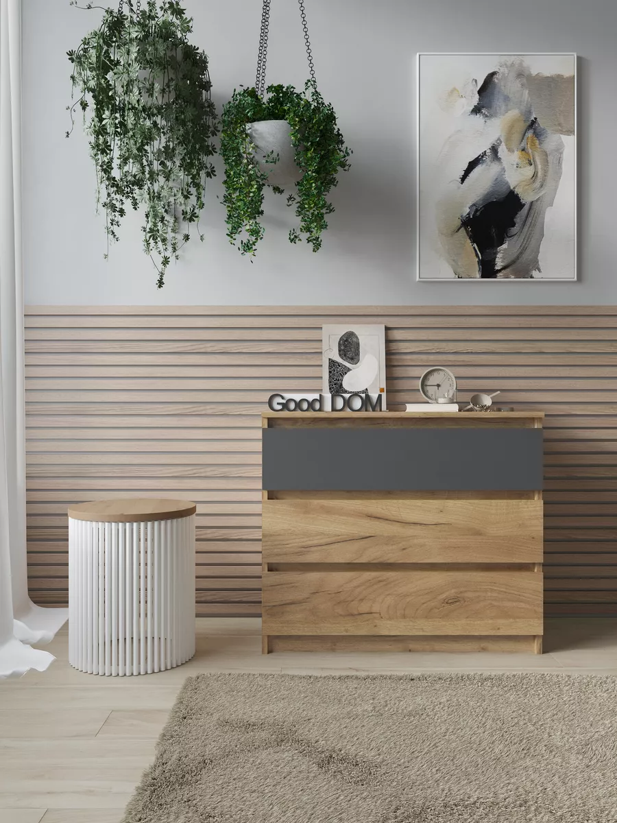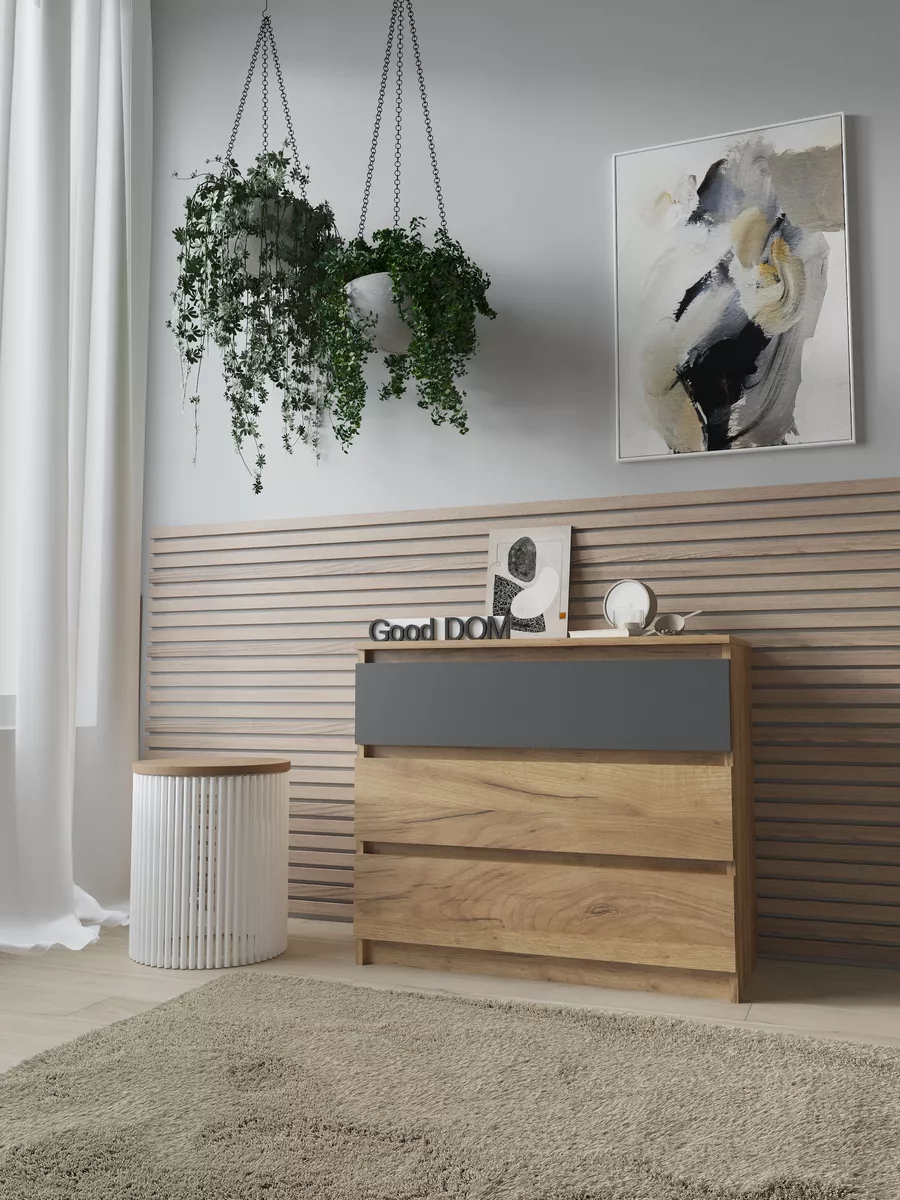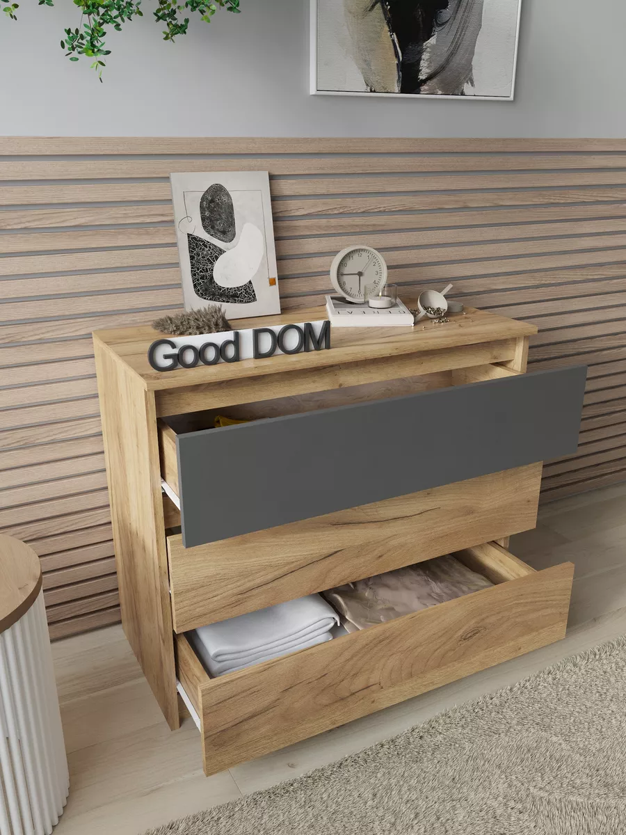Столешница выдержана в универсальном стиле, что позволяет использовать комод не только как тумбу, но и как дополнительный настольный стол для размещения документов, декоративных вещей или косметики. Его глубокие ящики дают простор для хранения как кухонной посуды, так и косметического набора, маникюрных принадлежностей или детских игрушек.