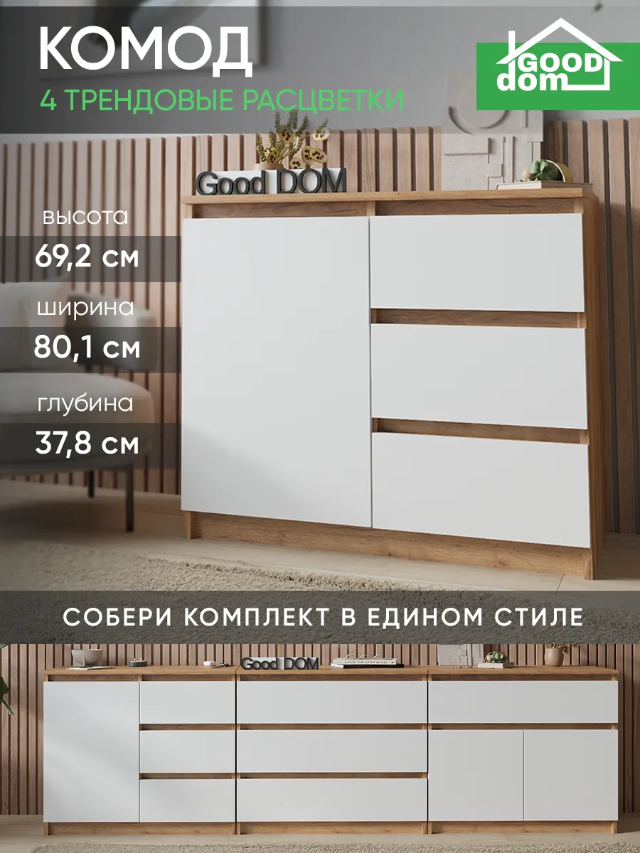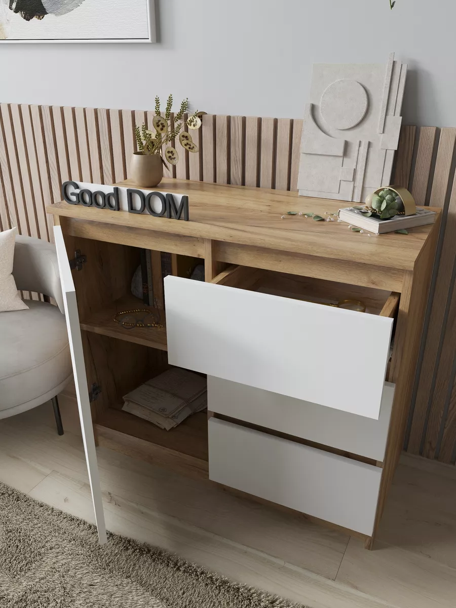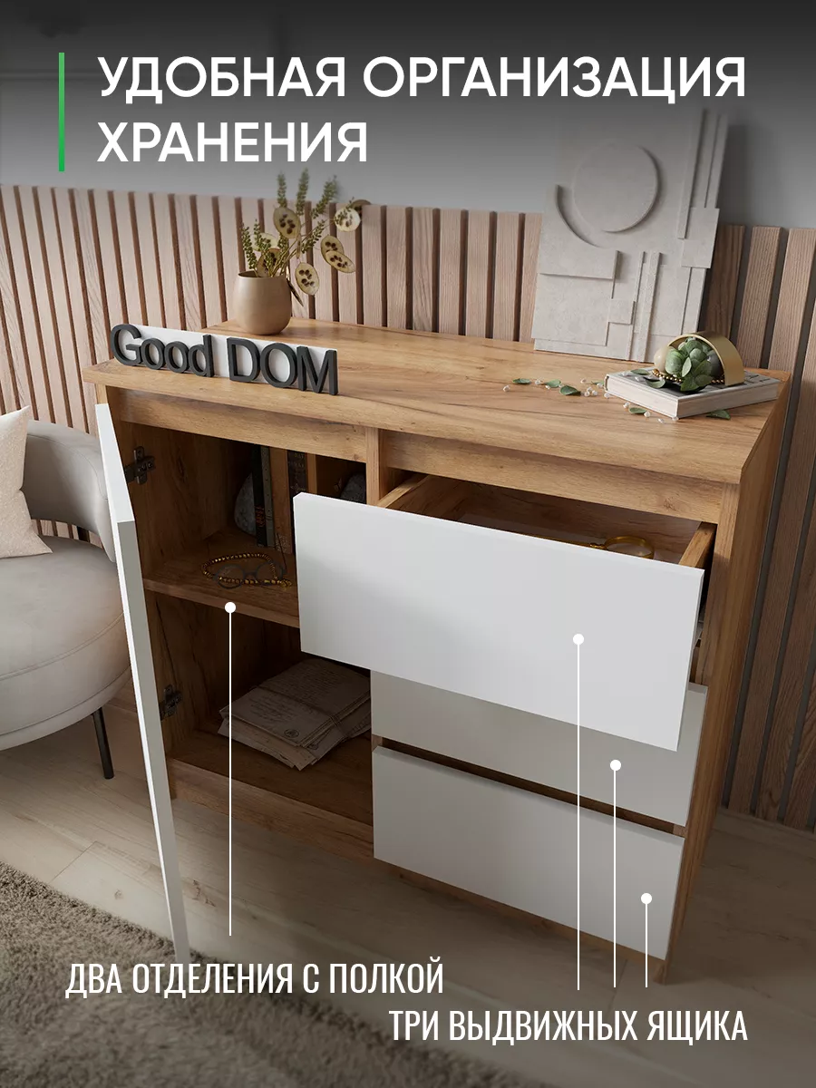 Комод с тремя выдвижными ящиками и отделением с полкой. Специально разработанная современная модель в трендовых цветах от надежного производителя мебели Good Дом. Комод - удобная и функциональная вещь в любом помещении.