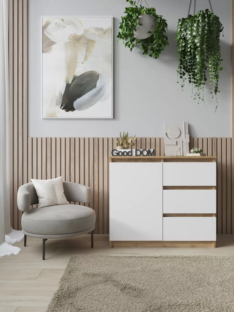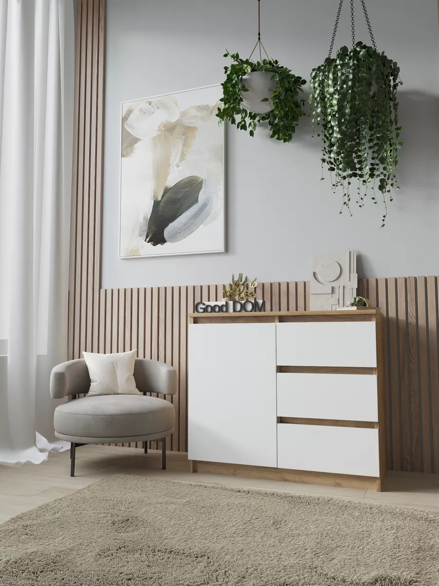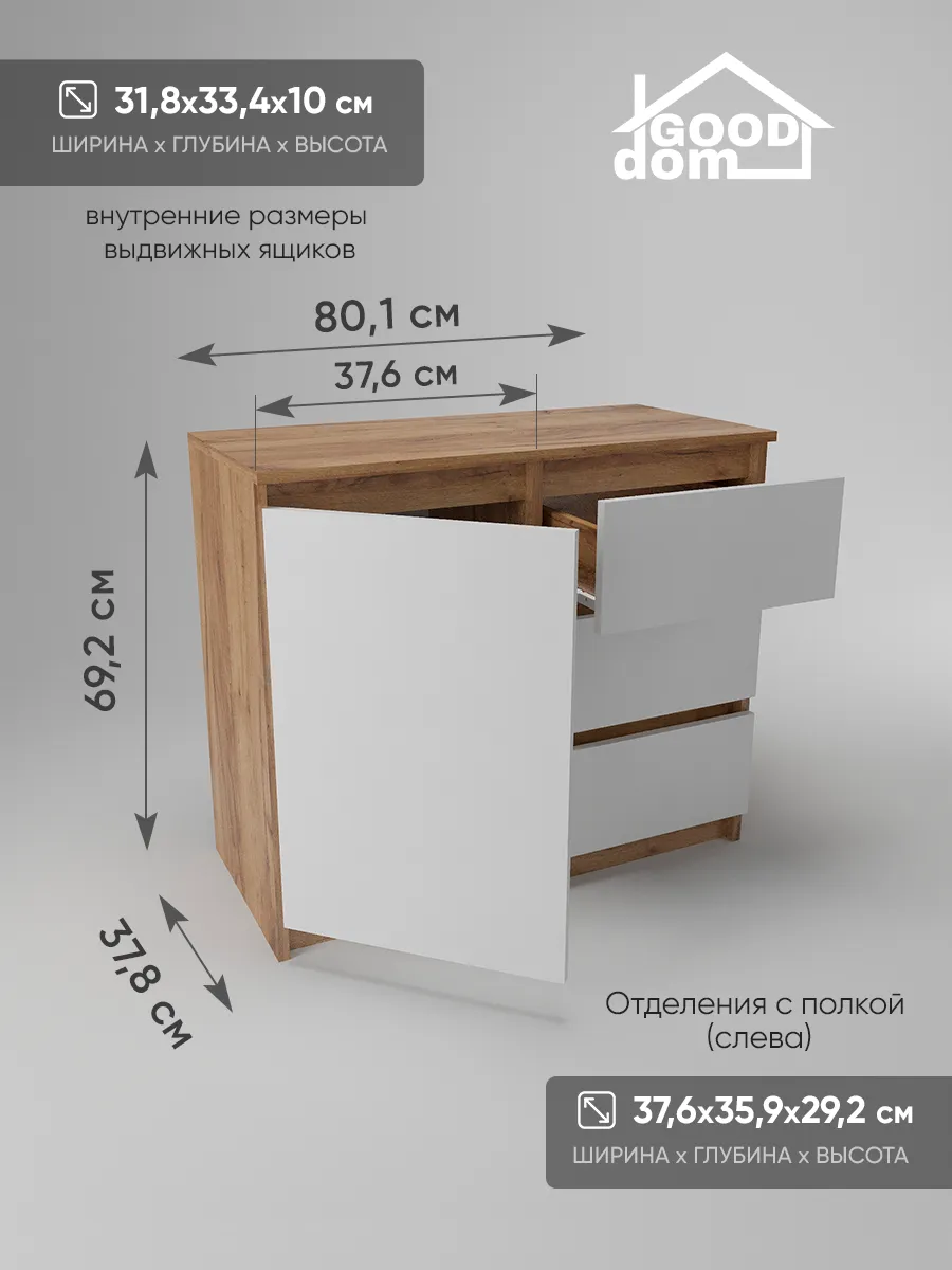 Комод с тремя выдвижными ящиками и отделением с полкой. Специально разработанная современная модель в трендовых цветах от надежного производителя мебели Good Дом. Комод - удобная и функциональная вещь в любом помещении.
