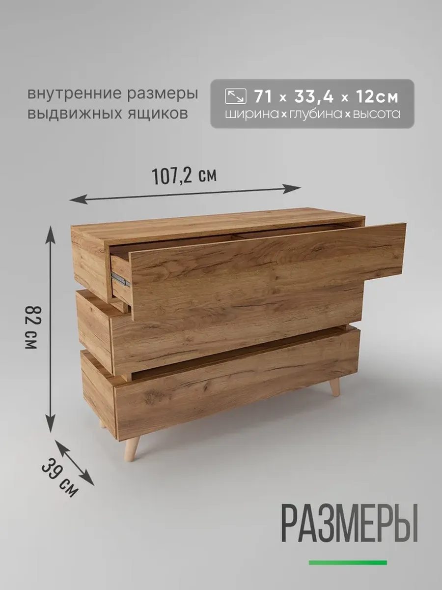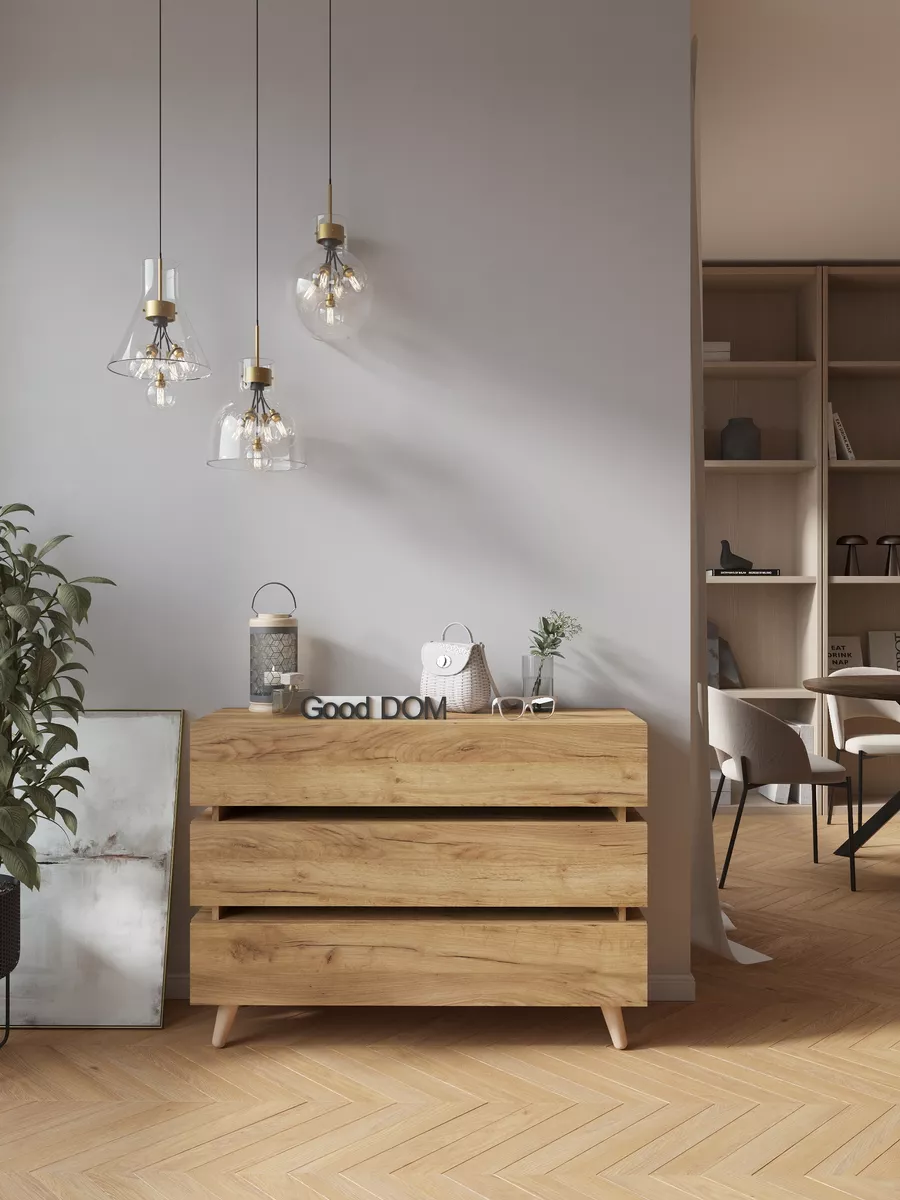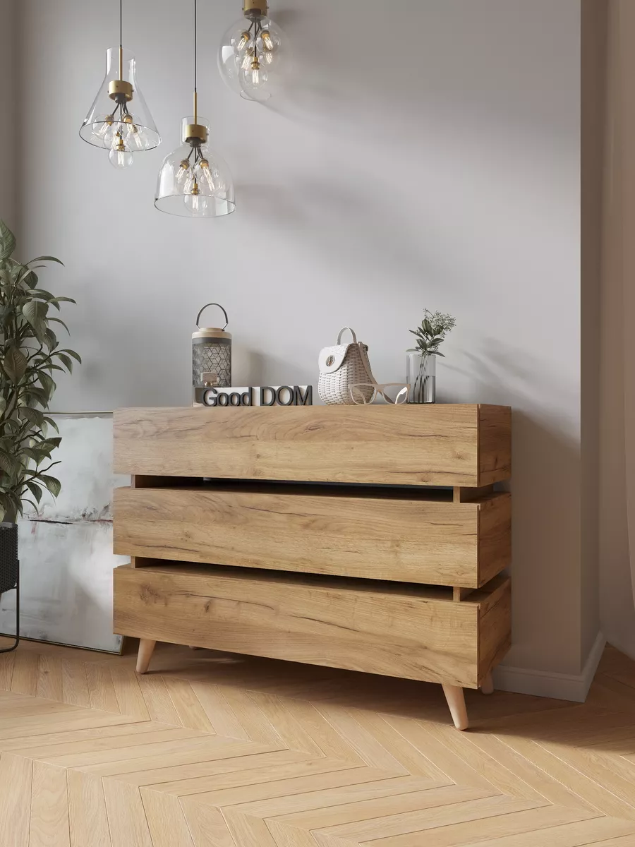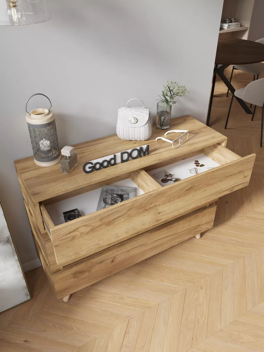 Комод - удобная и функциональная вещь в любом помещении. Три выдвижных ящика позволяют аккуратно разместить все необходимые вещи, обеспечивая их удобное хранение и быстрый доступ. Отсутствие ручек не только делает его современным и модным, но и обеспечивает безопасность, особенно если в доме есть маленькие дети. Использовать комодик можно практически в любых помещениях дома и квартиры: в гостиной, для зала и гардеробной, для детских комнат, в коридор, для балкона, и лождии. Необычный дизайн и деревянные ножки помогут с помощью комода добавить вашему интерьеру индивидуальность и современный вид.