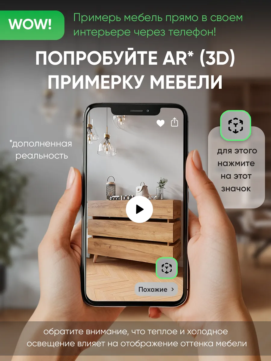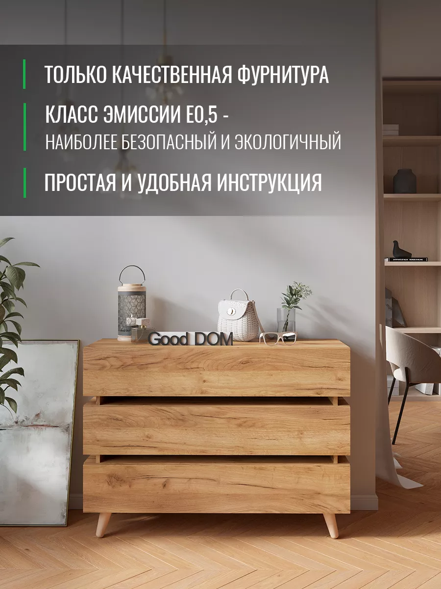 Наш комод изготовлен на новом оборудовании из высококачественных материалов ЛДСП. Мы дорожим качеством и внешним видом нашей продукции, поэтому вся продукция проверяется перед отправкой отделом контроля и упаковывается в коробки с дополнительной твердой защитой. В нашем ассортименте есть много интересных моделей мебели, что позволяет собрать комплект мебели от бренда Good дом, все в Дом, которая сочетается между собой. Чтобы посмотреть всё - просто нажмите на иконку логотипа.