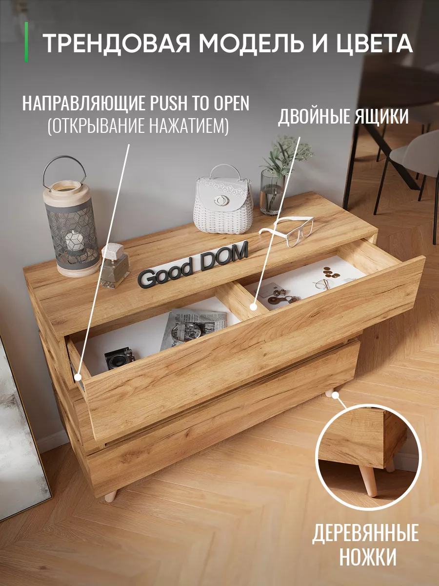 Стильный комод с тремя выдвижными ящиками, открывающимися по нажатию (система открывания Push To Open). Специально разработанная современная модель в трендовых цветах от надежного производителя мебели Good Дом.