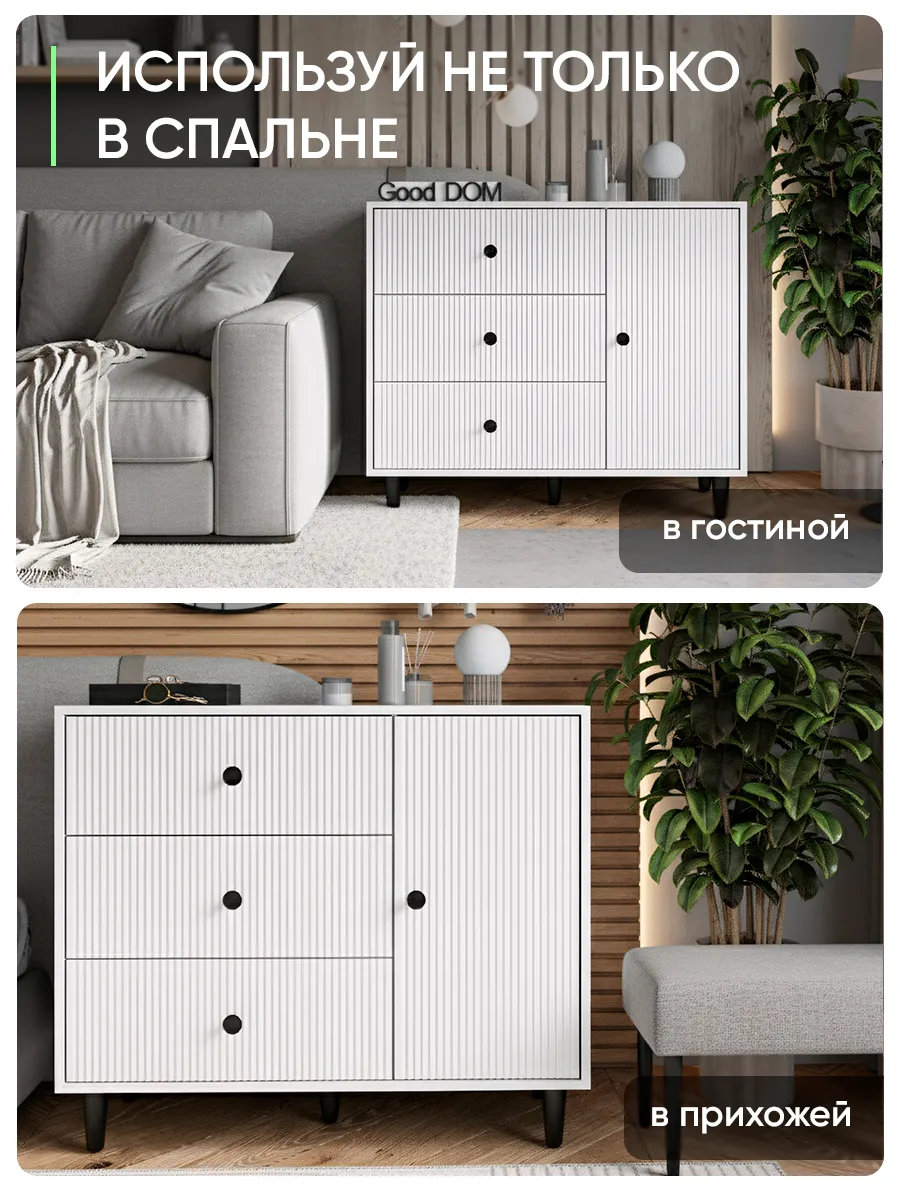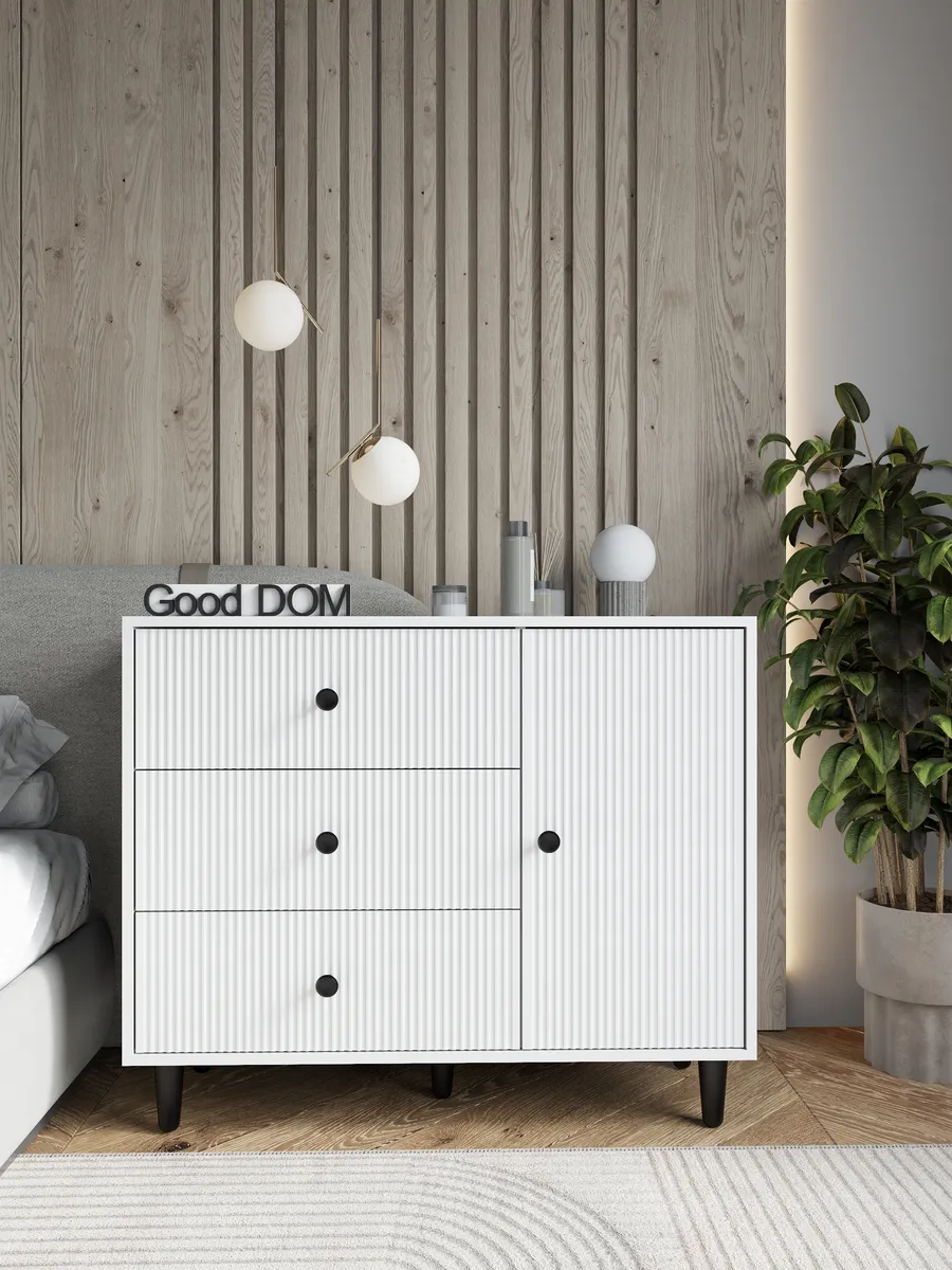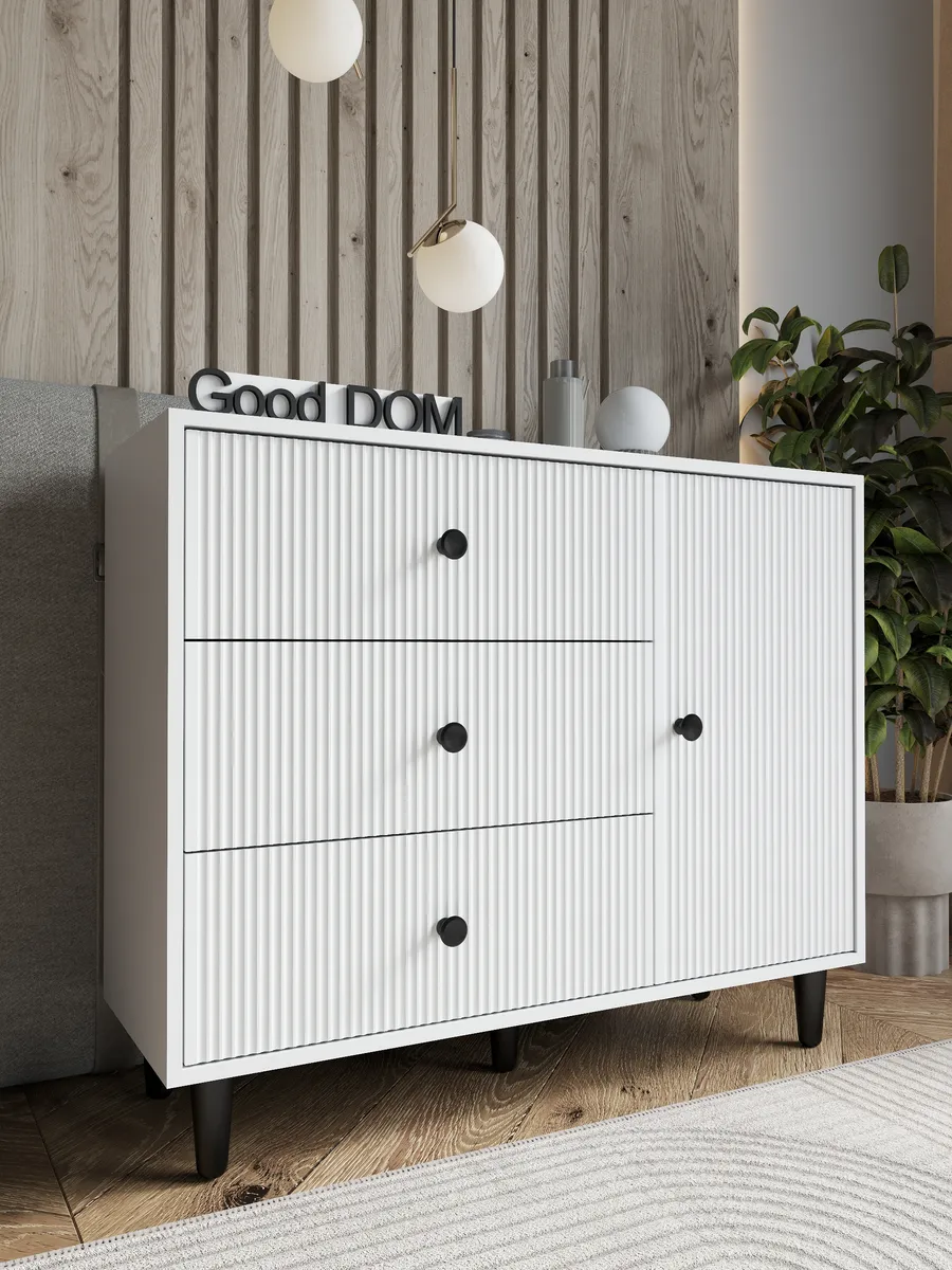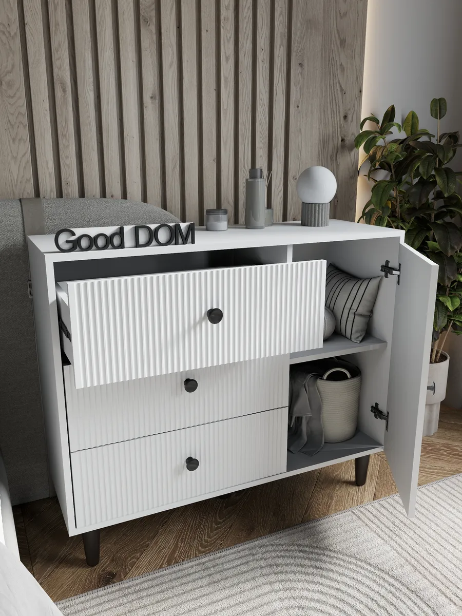 Комод – это современная и стильная мебель для хранения вещей в доме, отлично подходящая для гостиной, спальни, коридора, офисного пространства, детской или гардеробной. Благодаря продуманной конструкции с выдвижными ящиками он удобен для хранения одежды, посуды, косметики, документов, а также позволяет разместить полочка или предметы декора. Белый цвет и дизайнерский внешний вид позволяют гармонично вписать комодик в интерьер любой комнаты — будь то зал, кухня, балкон, мини гардероб, детский уголок или даже уютная дача. Сканди или лофт стиль станет заметен благодаря лаконичным ручка, ножка и необычным деталям оформления, которые акцентируют современный подход к оформлению пространства.