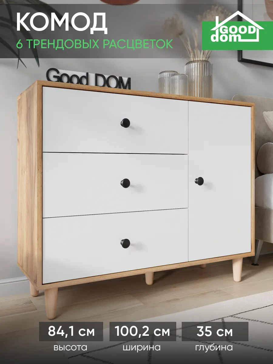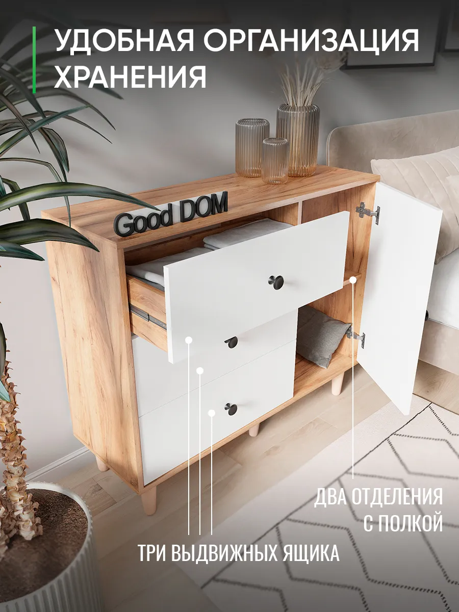 Комод с тремя выдвижными ящиками и отделением с полкой на ножках. Специально разработанная современная модель в трендовых цветах от надежного производителя мебели Good Дом. Комод - удобная и функциональная вещь в любом помещении.