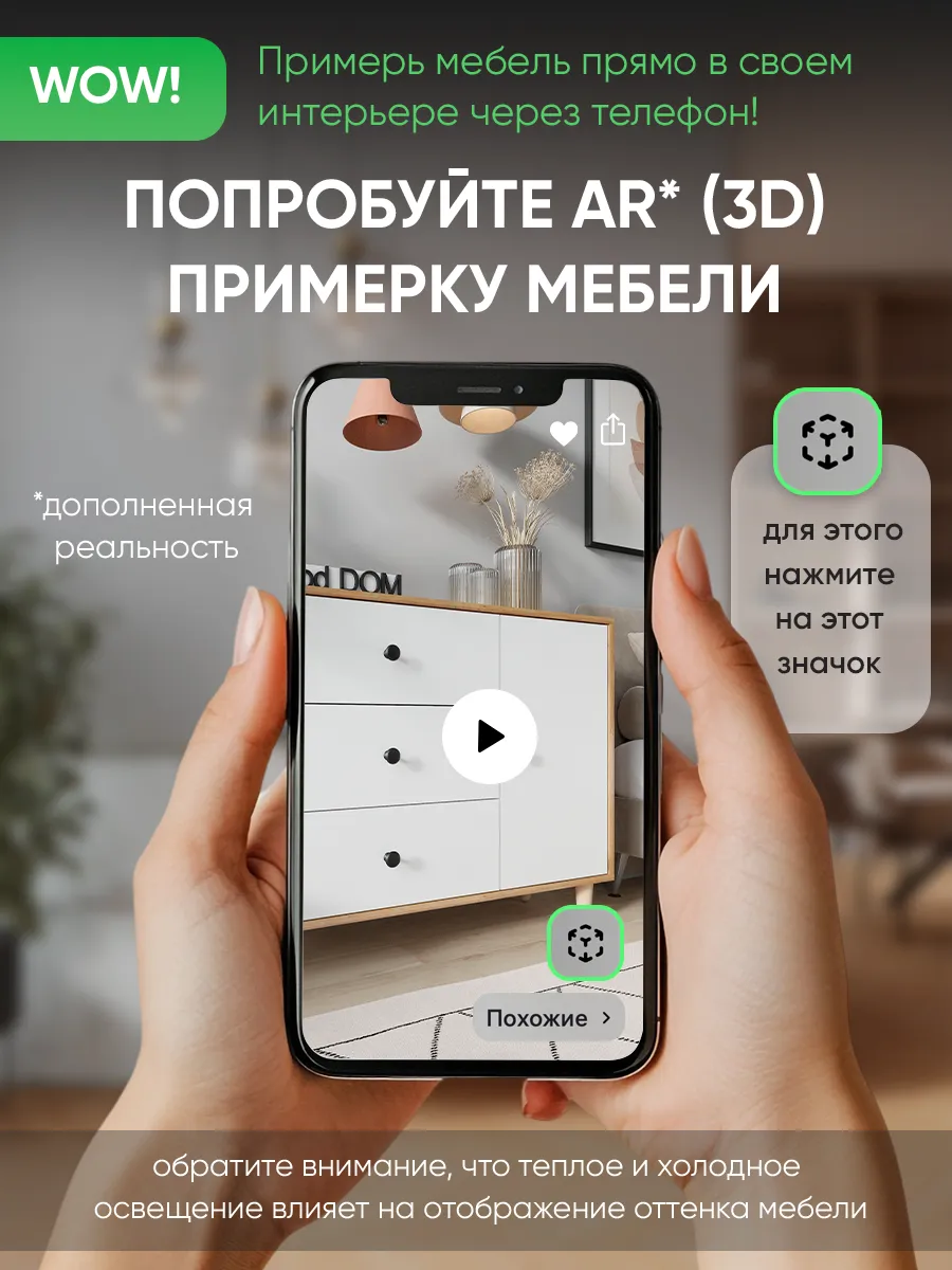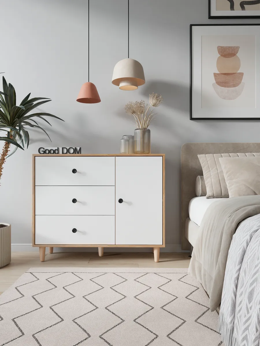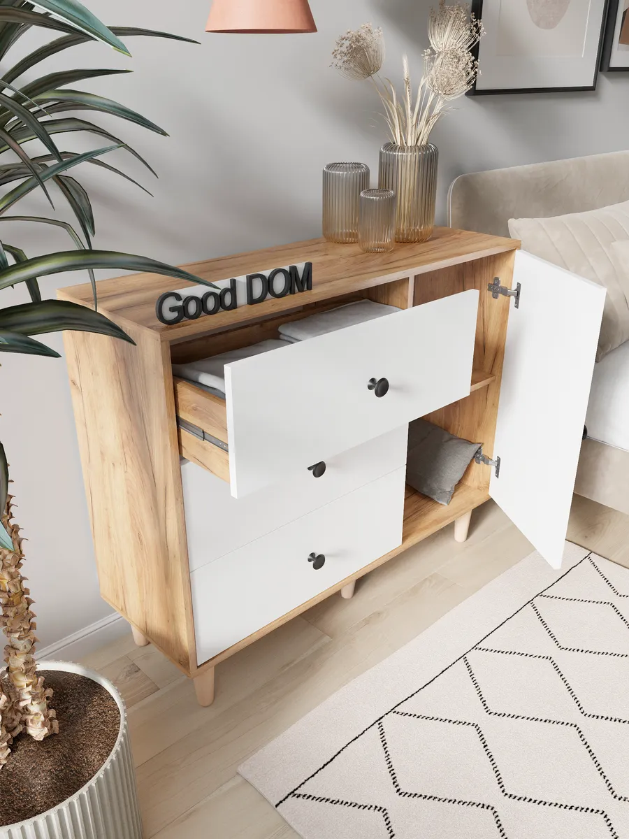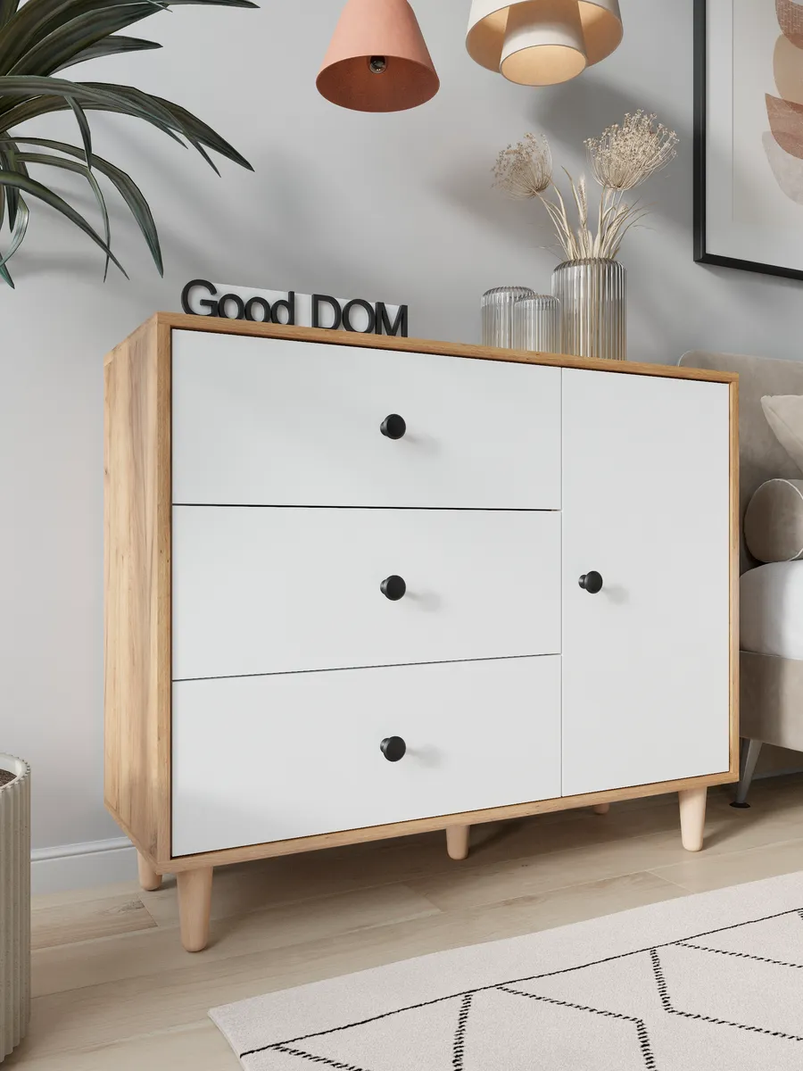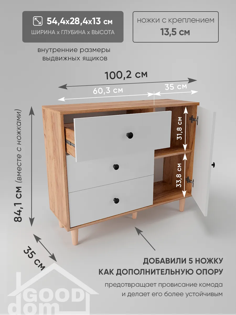 Два отделения с полкой и три выдвижных ящика позволяют аккуратно разместить все необходимые вещи, обеспечивая их удобное хранение и быстрый доступ. Ручки-кнопки придают комоду необычный вид и добавлют стиль в ваш интерьер. Деревянные ножки широко используются в стиле сканди. Использовать комодик можно практически в любых помещениях дома и квартиры: в гостиной, для зала и гардеробной, для детских комнат, в коридор, для балкона, и лождии.