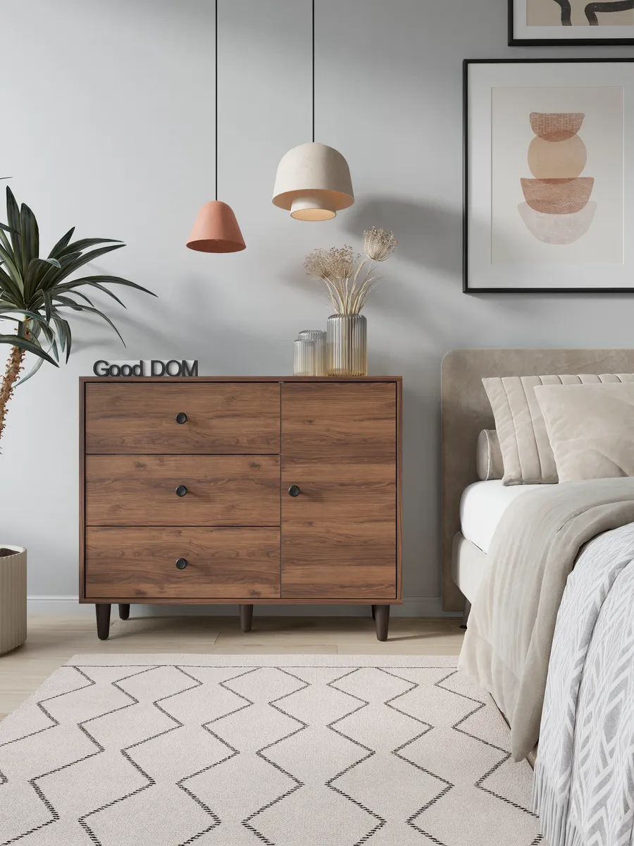 Два отделения с полкой и три выдвижных ящика позволяют аккуратно разместить все необходимые вещи, обеспечивая их удобное хранение и быстрый доступ. Ручки-кнопки придают комоду необычный вид и добавлют стиль в ваш интерьер. Деревянные ножки широко используются в стиле сканди. Использовать комодик можно практически в любых помещениях дома и квартиры: в гостиной, для зала и гардеробной, для детских комнат, в коридор, для балкона, и лождии.