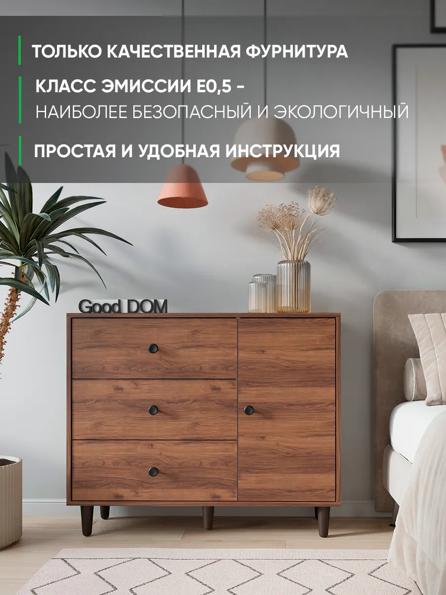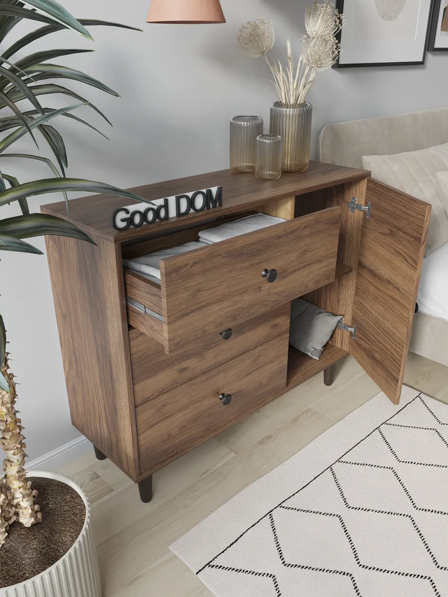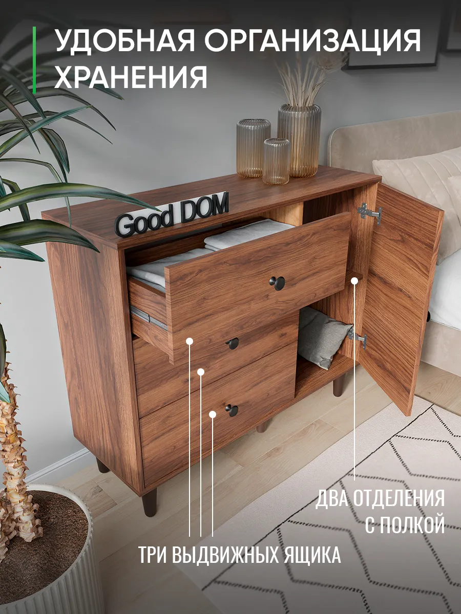 Комод с тремя выдвижными ящиками и отделением с полкой на ножках. Специально разработанная современная модель в трендовых цветах от надежного производителя мебели Good Дом. Комод - удобная и функциональная вещь в любом помещении.