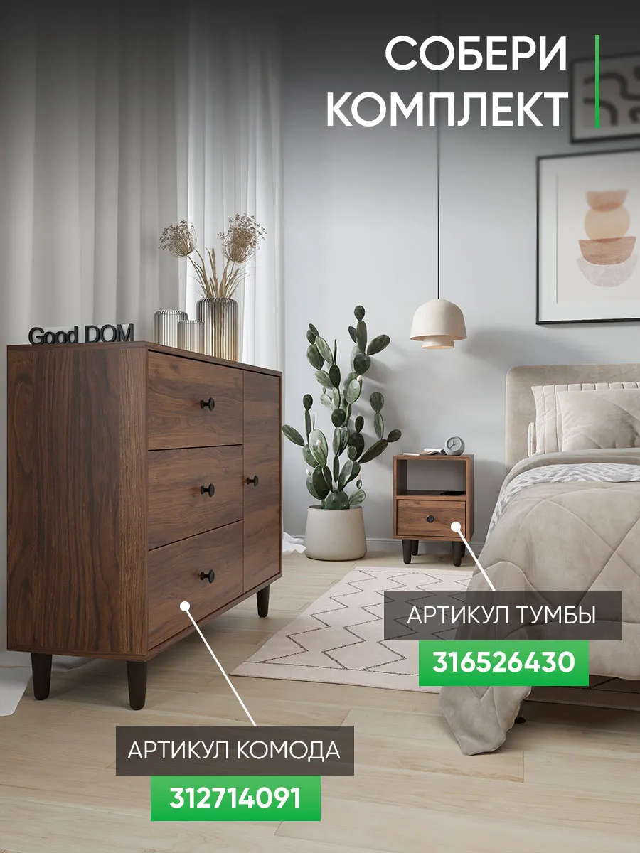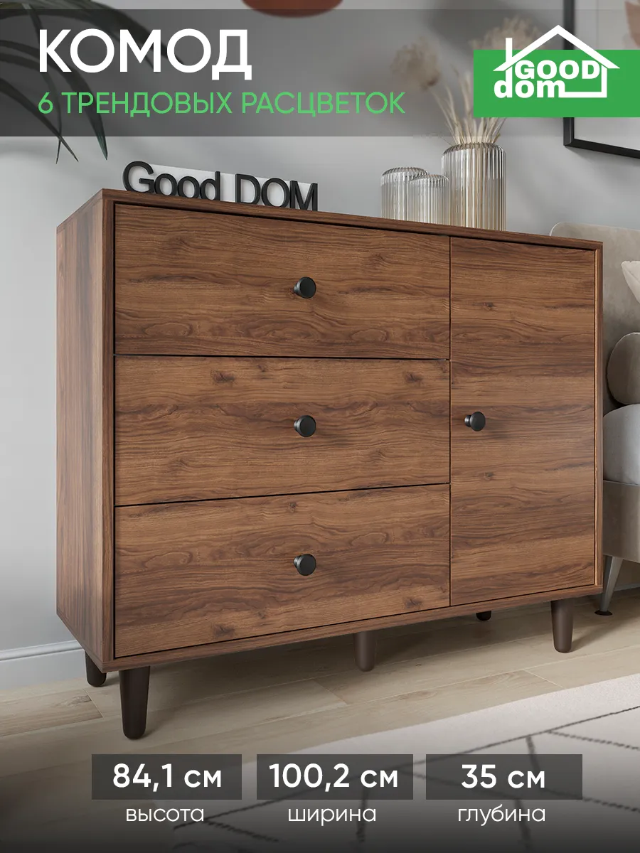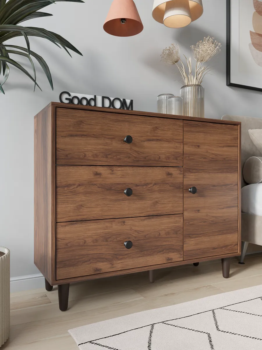 Комод с тремя выдвижными ящиками и отделением с полкой на ножках. Специально разработанная современная модель в трендовых цветах от надежного производителя мебели Good Дом. Комод - удобная и функциональная вещь в любом помещении.