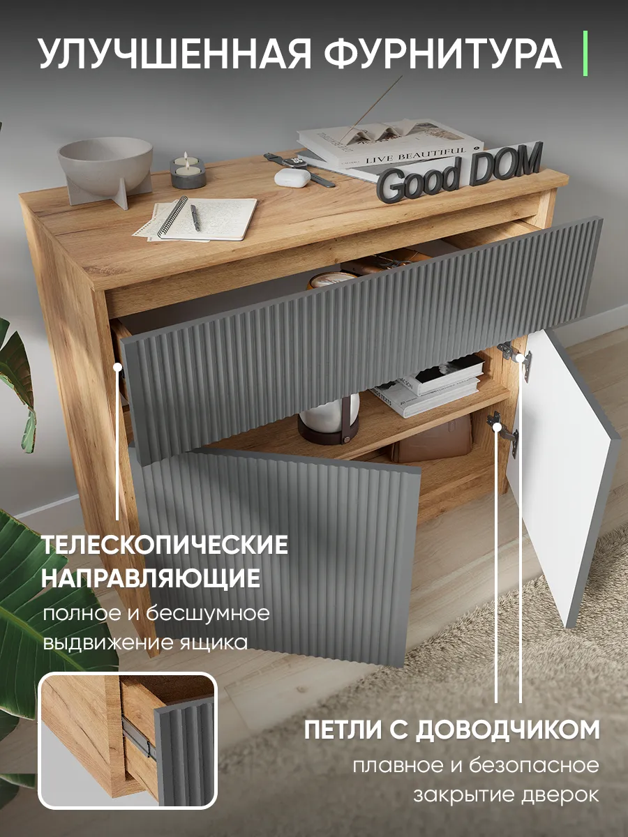 Выдвижной ящик и две секции, разделенные полкой, позволяют аккуратно разместить все необходимые вещи, обеспечивая их удобное хранение и быстрый доступ. Отсутствие ручек не только делает его современным и модным, но и обеспечивает безопасность, особенно если в доме есть маленькие дети. Использовать комодик можно практически в любых помещениях дома и квартиры: в гостиной, для зала и гардеробной, для детских комнат, в коридор, для балкона, и лождии.