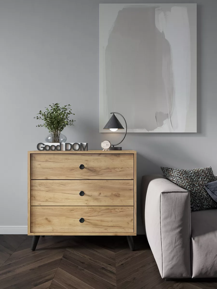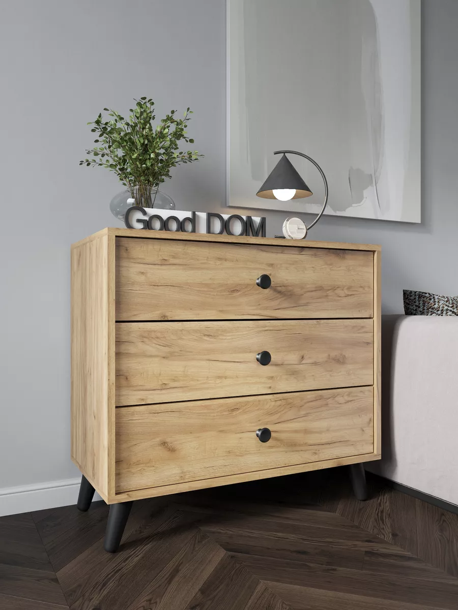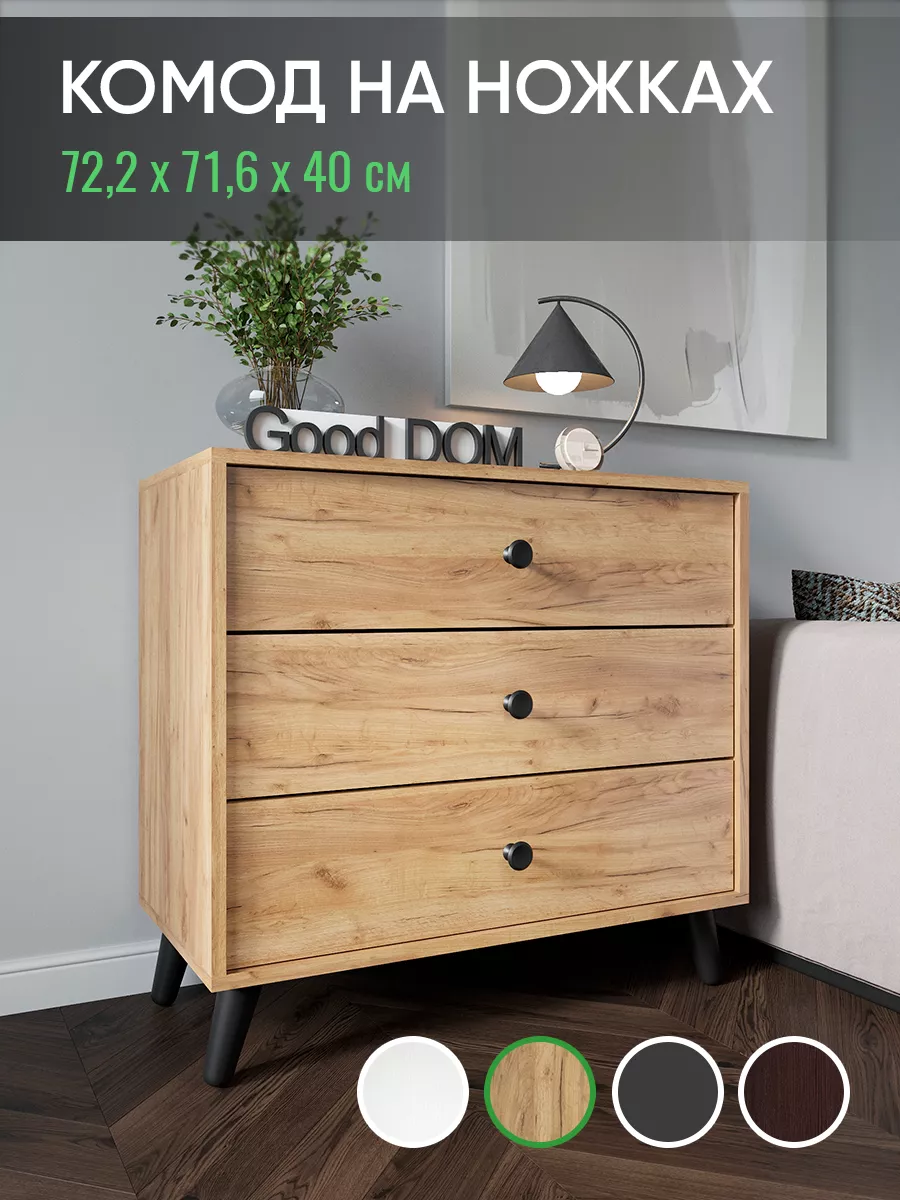 Комод с тремя выдвижными ящиками на деревянных ножках. Специально разработанная современная модель в трендовых цветах от надежного производителя мебели Good Дом. Комод - удобная и функциональная вещь в любом помещении. Три выдвижных ящика позволяют аккуратно разместить все необходимые вещи, обеспечивая их удобное хранение и быстрый доступ. Ручки-кнопки придают комоду необычный вид и добавлют стиль в ваш интерьер. Деревянные ножки широко используются в стиле сканди. Использовать комодик можно практически в любых помещениях дома и квартиры: в гостиной, для зала и гардеробной, для детских комнат, в коридор, для балкона, и лождии.