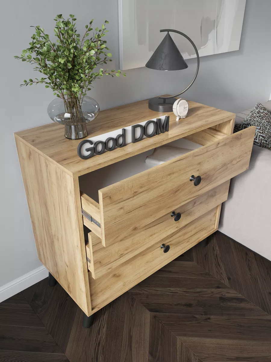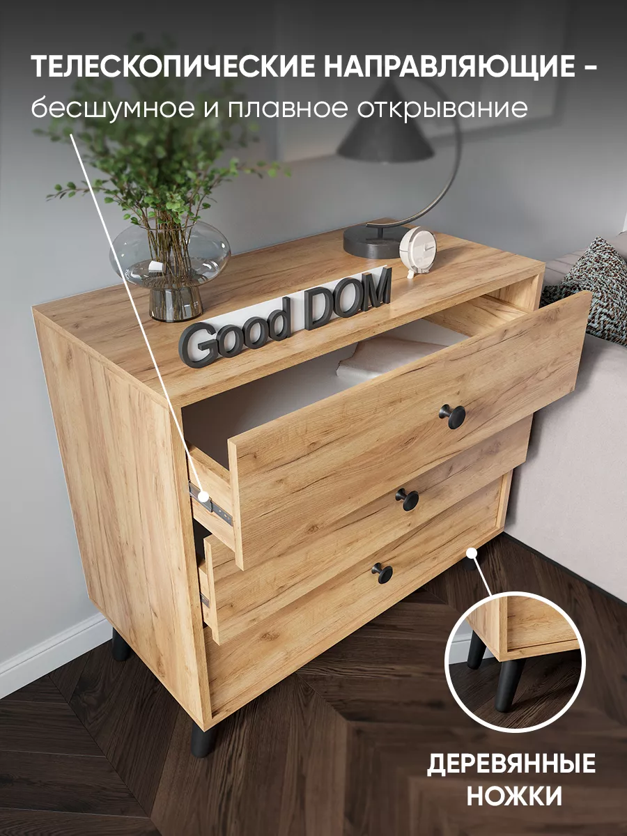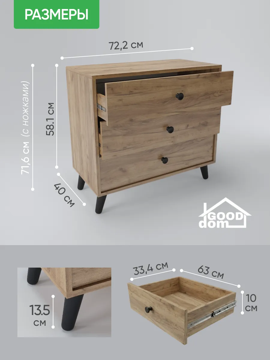 Комод с тремя выдвижными ящиками на деревянных ножках. Специально разработанная современная модель в трендовых цветах от надежного производителя мебели Good Дом. Комод - удобная и функциональная вещь в любом помещении. Три выдвижных ящика позволяют аккуратно разместить все необходимые вещи, обеспечивая их удобное хранение и быстрый доступ. Ручки-кнопки придают комоду необычный вид и добавлют стиль в ваш интерьер. Деревянные ножки широко используются в стиле сканди. Использовать комодик можно практически в любых помещениях дома и квартиры: в гостиной, для зала и гардеробной, для детских комнат, в коридор, для балкона, и лождии.
