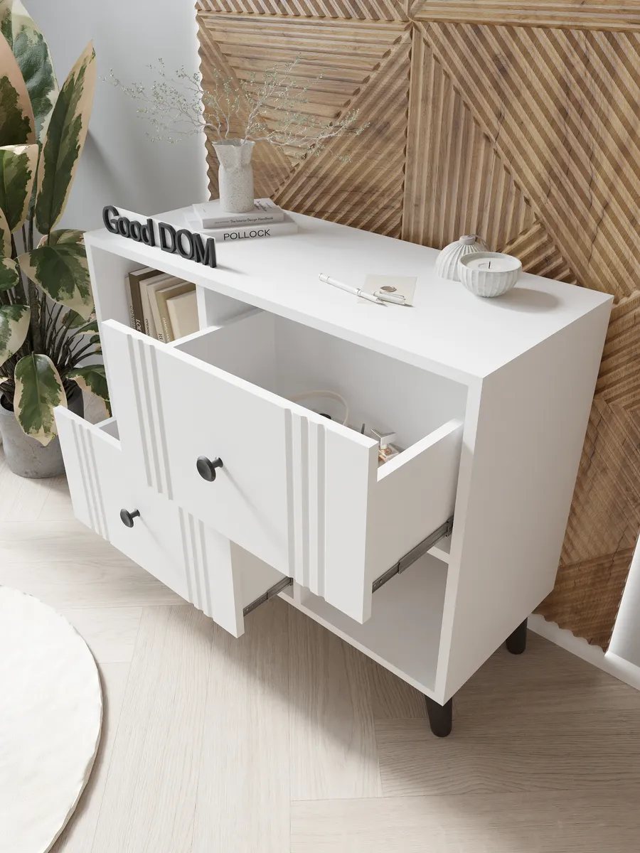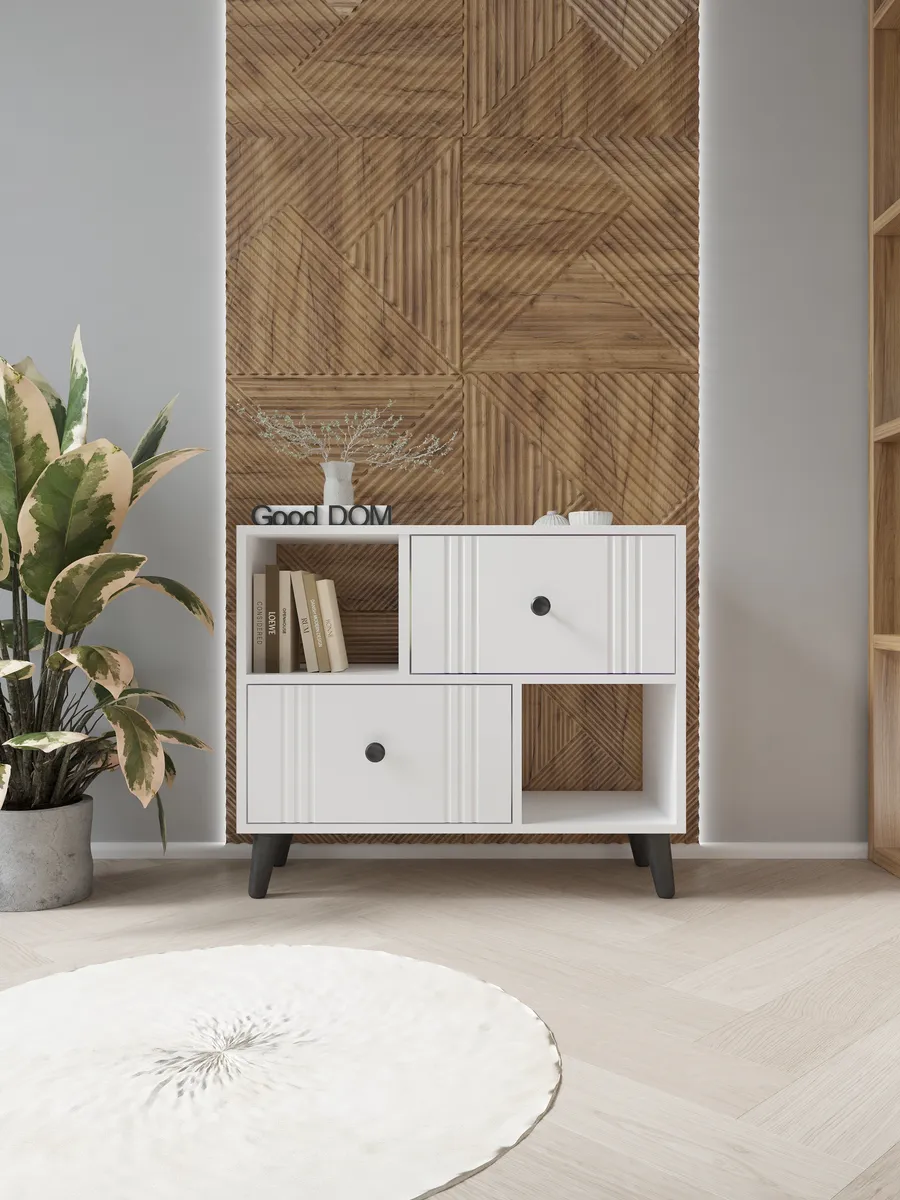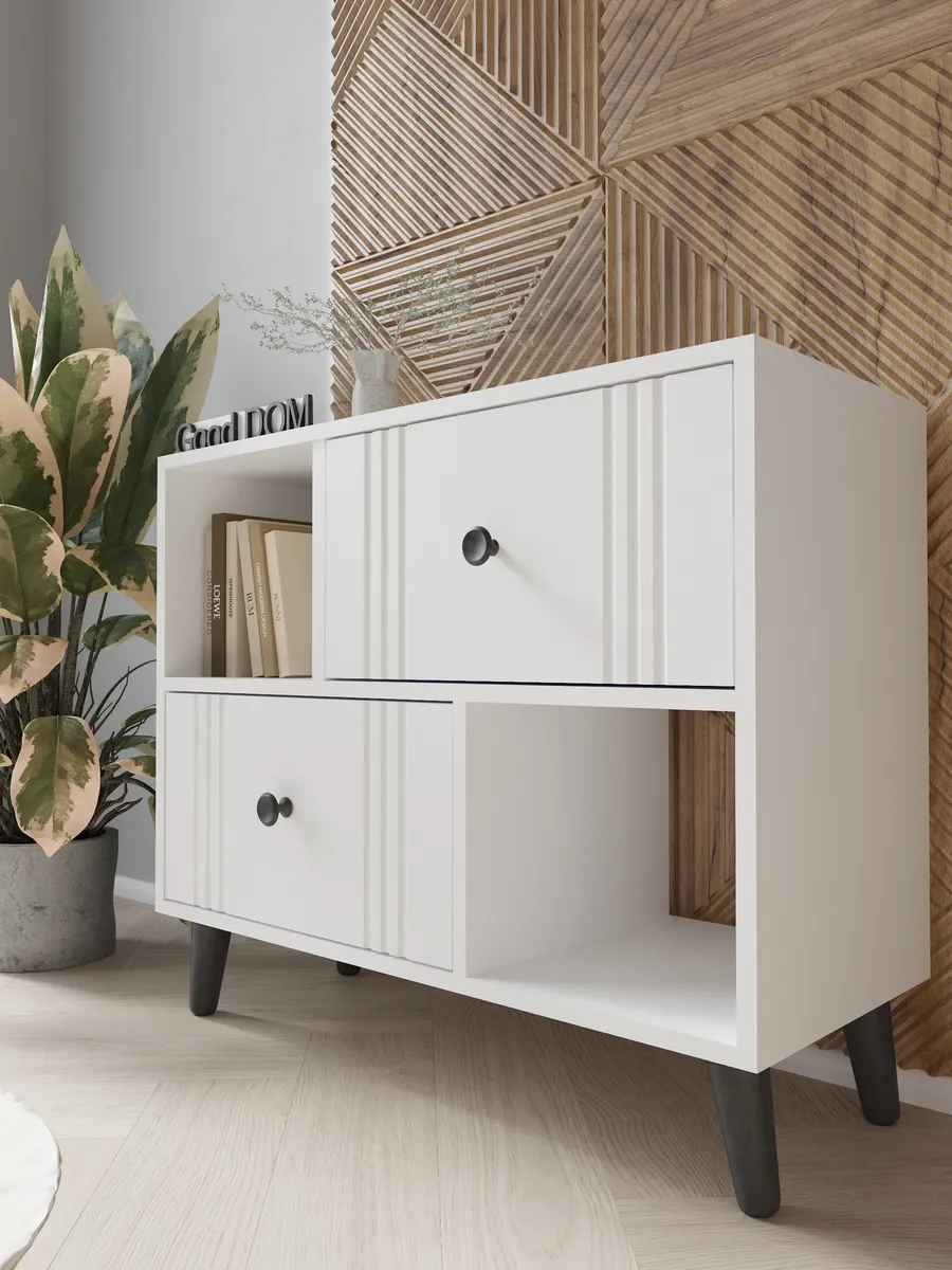 Тумба оснащена двумя вместительными выдвижными ящиками на шариковых направляющих и двумя открытми отделениями. Такой полузакрытый фасад создает легкий образ, но при этом дает возможность скрыть некоторые вещи с глаз в ящики, а на открытых секциях оставить декор или книги. Лаконичный дизайн гармонично впишется в любой интерьер в стиле лофт, классика или минимализм. Тумба выполнена в трех трендовых цветовых решениях - белый, дуб золотой с белым и антрацит и дуб золотой.