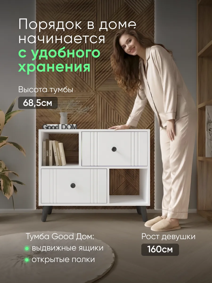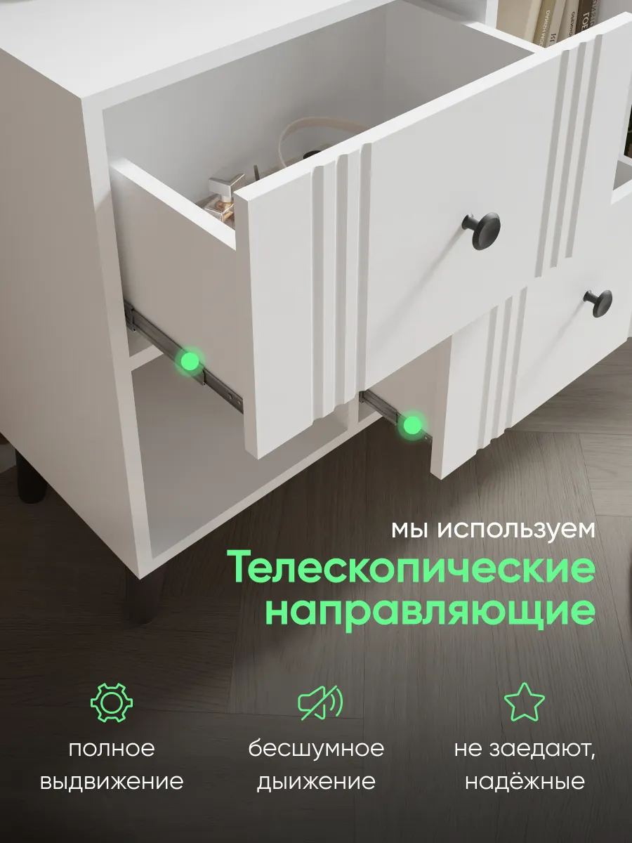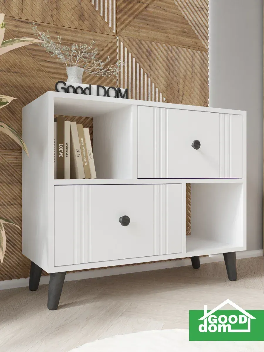 Напольная тумба в гостиную на деревянных ножках – стильное и функциональное решение для организации пространства в гостиной, спальне или прихожей. Преимущества данной тумбы - фасады МДФ в пленке soft touch - долговечные, приятные на ощупь и не оставляют следов отпечатков пальцев. Шариковые направляющие полного выдвижения обеспечивают бесшумность открывания ящиков, выдерживают гораздо больший вес, чем роликовые. Помимо этого, деревянные ножки тумбы придают ей стильный и современный вид. Тумба на ножках позволяет с легкостью поддерживать чистоту под ней. Данная тумба с ящиками вполне может стать аналогом классической стенки в гостиную, но менее грамоздкой и современной. Такая тумба может служить еще и прикроватной тумбочкой или комодом для белья в спальне. Так же комодик вполне может использоваться как тумба под документы в кабинете или офисе. Комод для гостиной может стать стильной и компактной тумбой под телевизор, игровую консоль, которая может разместиться на горизонтальной поверхности сверху. В таком случае удобные ящики с бесшумными шариковыми направляющими подойдут для хранения роутера, проводов, зарядок и других приспособлений, жестких дисков и дисков DVD, а открытые полки для журналов и книг. Тумба под телевизор напольная может разместиться под ним, если вы не хотите нагромождать пространство. Использование тумбы не ограничевается гостиной, она так же отлично впишется в прихожую для хранения аксессуаров, документов. А в детской найдет свое место как тумба для игрушек, для книг, как прикроватная тумба.