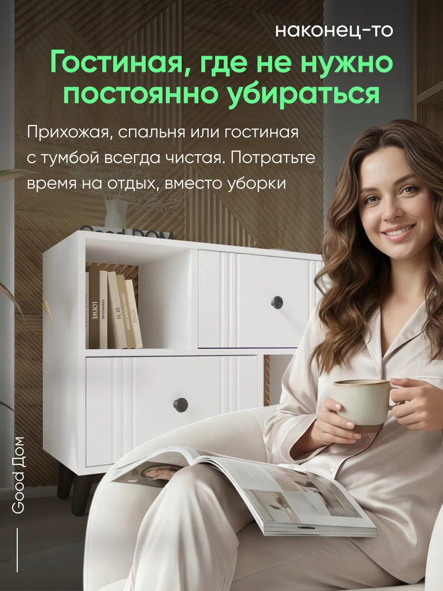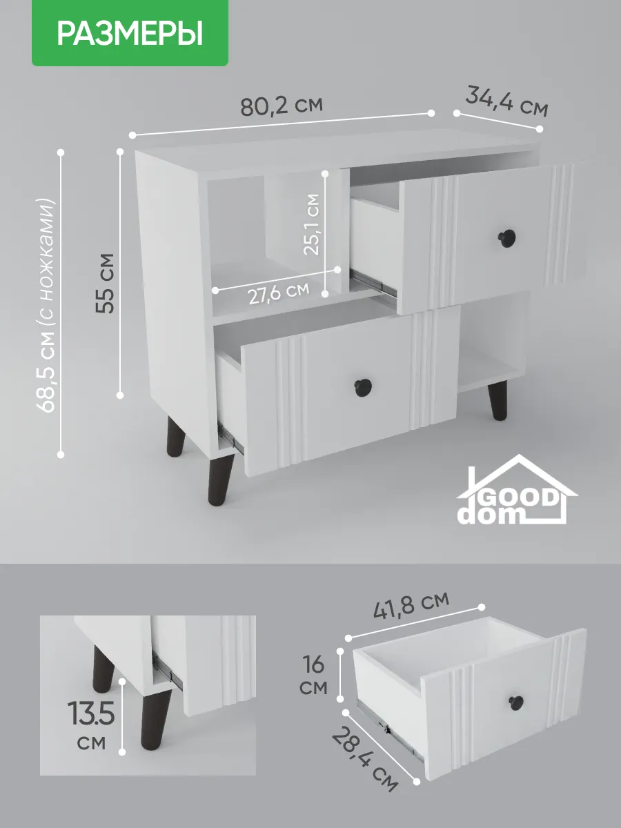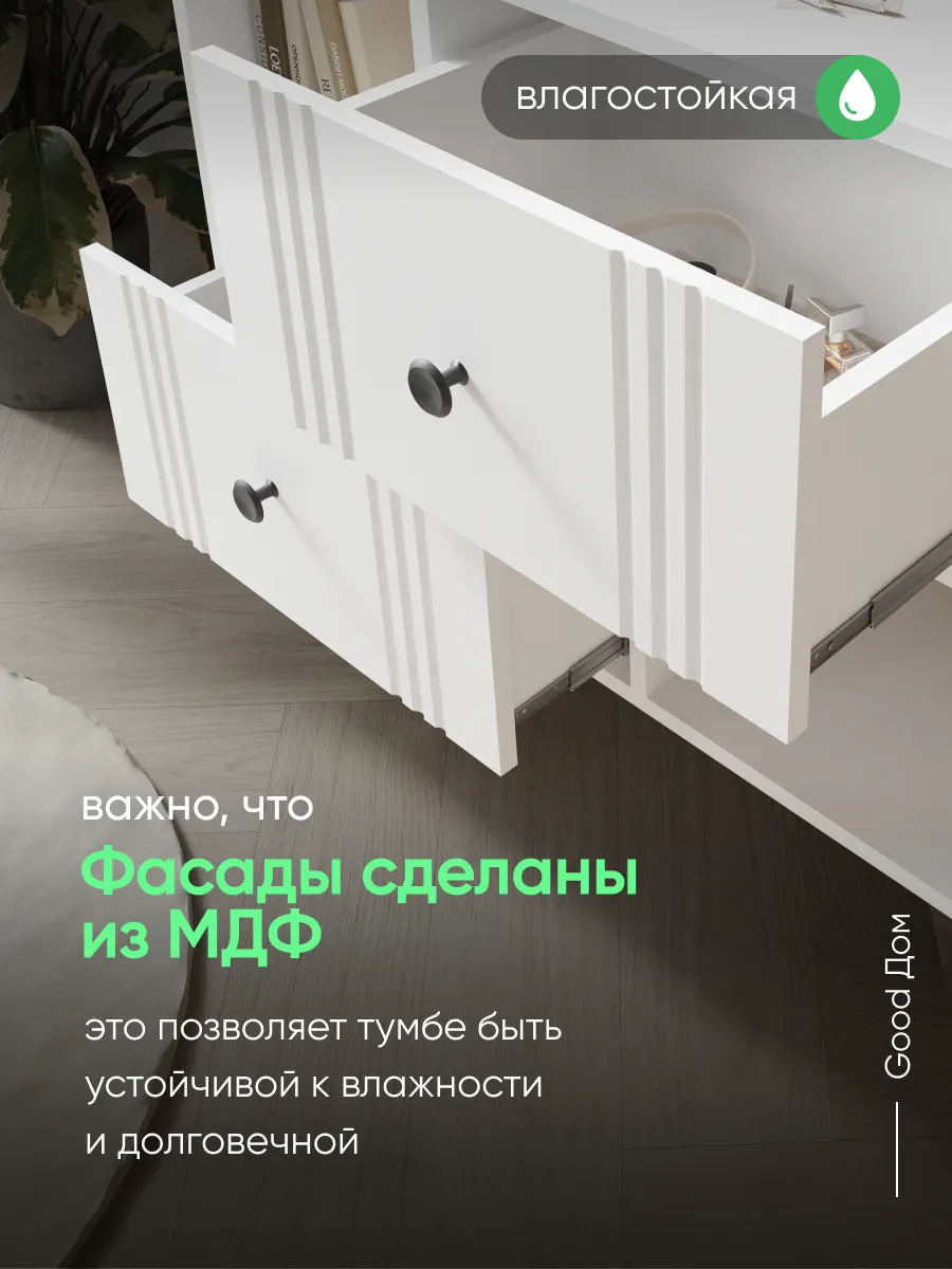 Напольная тумба в гостиную на деревянных ножках – стильное и функциональное решение для организации пространства в гостиной, спальне или прихожей. Преимущества данной тумбы - фасады МДФ в пленке soft touch - долговечные, приятные на ощупь и не оставляют следов отпечатков пальцев. Шариковые направляющие полного выдвижения обеспечивают бесшумность открывания ящиков, выдерживают гораздо больший вес, чем роликовые. Помимо этого, деревянные ножки тумбы придают ей стильный и современный вид. Тумба на ножках позволяет с легкостью поддерживать чистоту под ней. Данная тумба с ящиками вполне может стать аналогом классической стенки в гостиную, но менее грамоздкой и современной. Такая тумба может служить еще и прикроватной тумбочкой или комодом для белья в спальне. Так же комодик вполне может использоваться как тумба под документы в кабинете или офисе. Комод для гостиной может стать стильной и компактной тумбой под телевизор, игровую консоль, которая может разместиться на горизонтальной поверхности сверху. В таком случае удобные ящики с бесшумными шариковыми направляющими подойдут для хранения роутера, проводов, зарядок и других приспособлений, жестких дисков и дисков DVD, а открытые полки для журналов и книг. Тумба под телевизор напольная может разместиться под ним, если вы не хотите нагромождать пространство. Использование тумбы не ограничевается гостиной, она так же отлично впишется в прихожую для хранения аксессуаров, документов. А в детской найдет свое место как тумба для игрушек, для книг, как прикроватная тумба.
