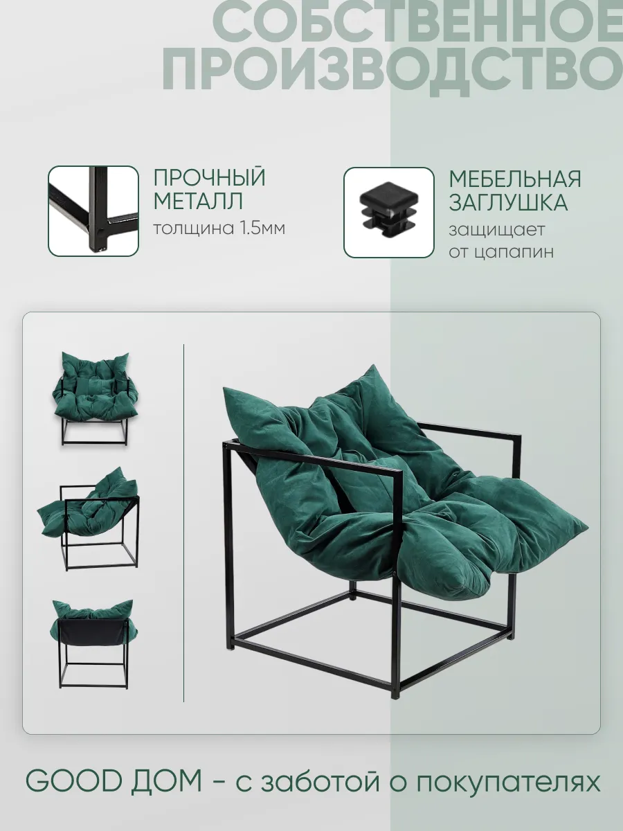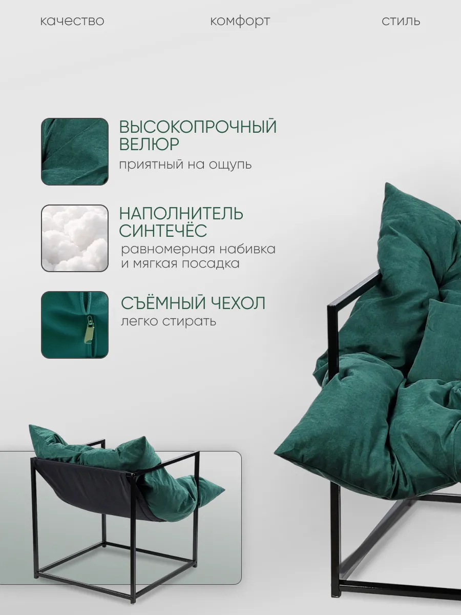 Каркас кресла состоит из прочного металла, что обеспечивает долговечное использование, а лёгкая и простая инструкция по сборке в комплекте поможет без затруднений за короткое время собрать кресло самостоятельно. Чехол подушки выполнен из прочного и приятного на ощупь велюра, устойчивого к истиранию и легкого в уходе. Эргономичная и обволакивающая форма сиденья с подлокотниками поддерживает тело в естественном положении, позволяя расслабиться после насыщенного дня. Благодаря своей универсальной расцветке и лаконичным формам кресло сочетается с интерьером в стиле лофт, минимализм, скандинавский, модерн и современная классика.