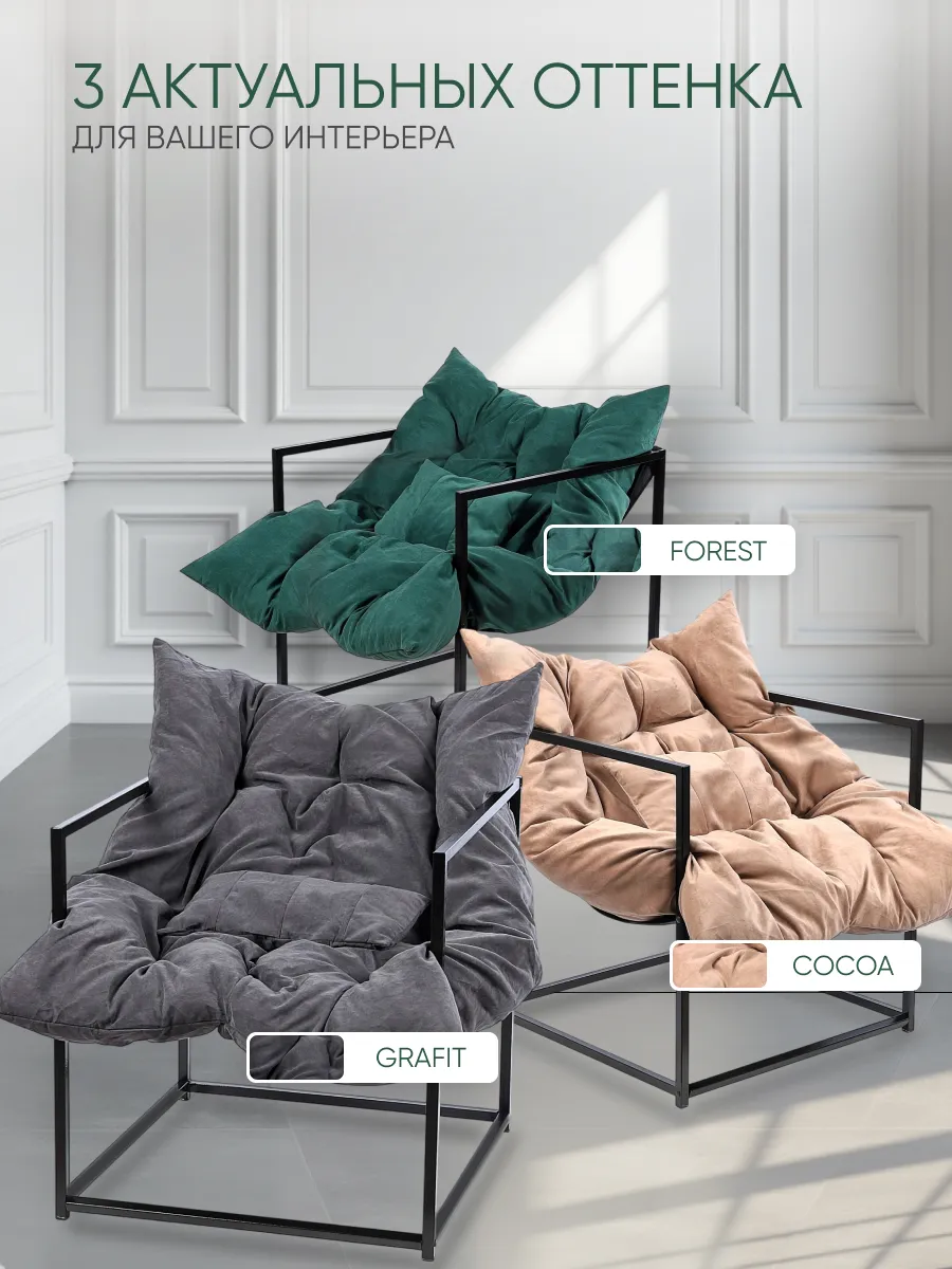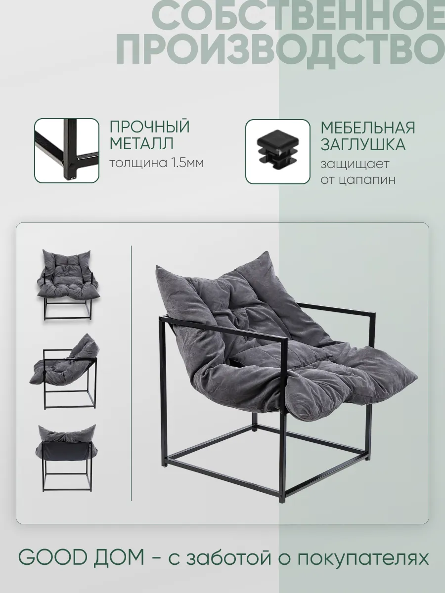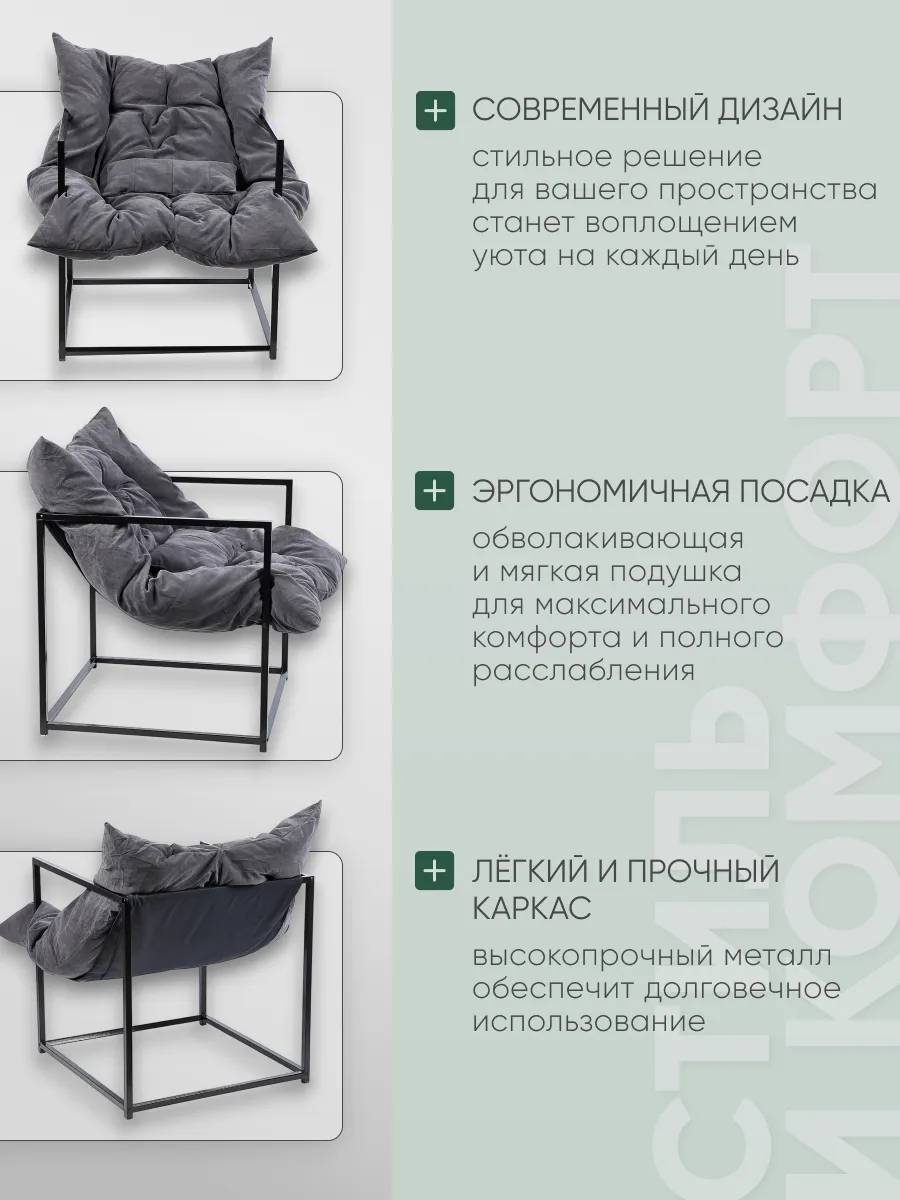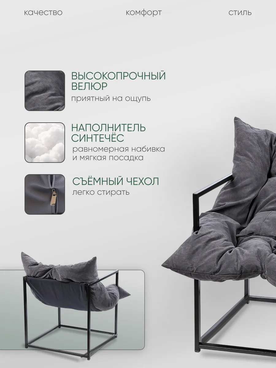 Каркас кресла состоит из прочного металла, что обеспечивает долговечное использование, а лёгкая и простая инструкция по сборке в комплекте поможет без затруднений за короткое время собрать кресло самостоятельно. Чехол подушки выполнен из прочного и приятного на ощупь велюра, устойчивого к истиранию и легкого в уходе. Эргономичная и обволакивающая форма сиденья с подлокотниками поддерживает тело в естественном положении, позволяя расслабиться после насыщенного дня. Благодаря своей универсальной расцветке и лаконичным формам кресло сочетается с интерьером в стиле лофт, минимализм, скандинавский, модерн и современная классика.