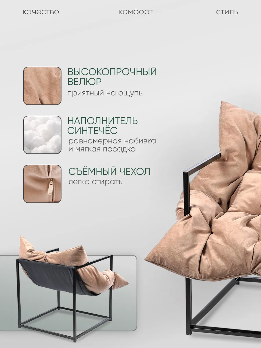 Каркас кресла состоит из прочного металла, что обеспечивает долговечное использование, а лёгкая и простая инструкция по сборке в комплекте поможет без затруднений за короткое время собрать кресло самостоятельно. Чехол подушки выполнен из прочного и приятного на ощупь велюра, устойчивого к истиранию и легкого в уходе. Эргономичная и обволакивающая форма сиденья с подлокотниками поддерживает тело в естественном положении, позволяя расслабиться после насыщенного дня. Благодаря своей универсальной расцветке и лаконичным формам кресло сочетается с интерьером в стиле лофт, минимализм, скандинавский, модерн и современная классика.