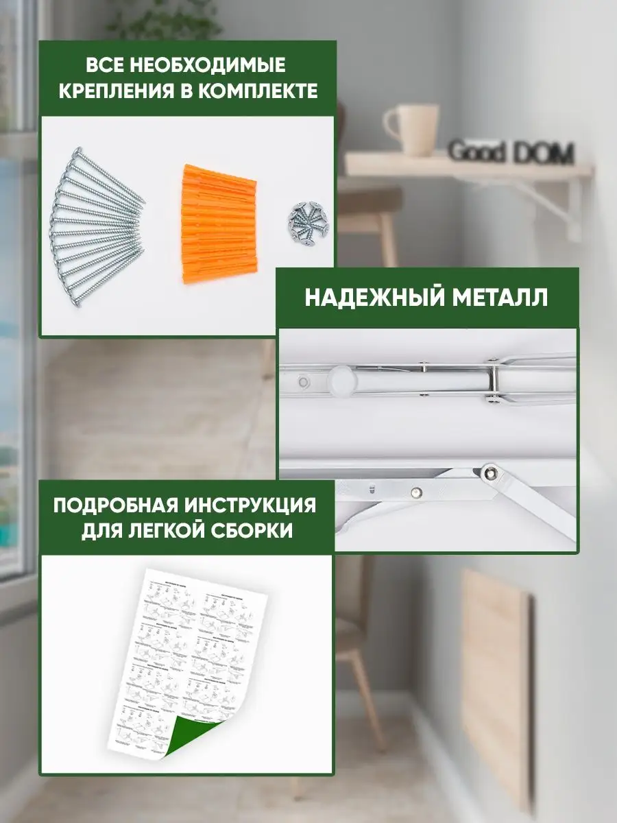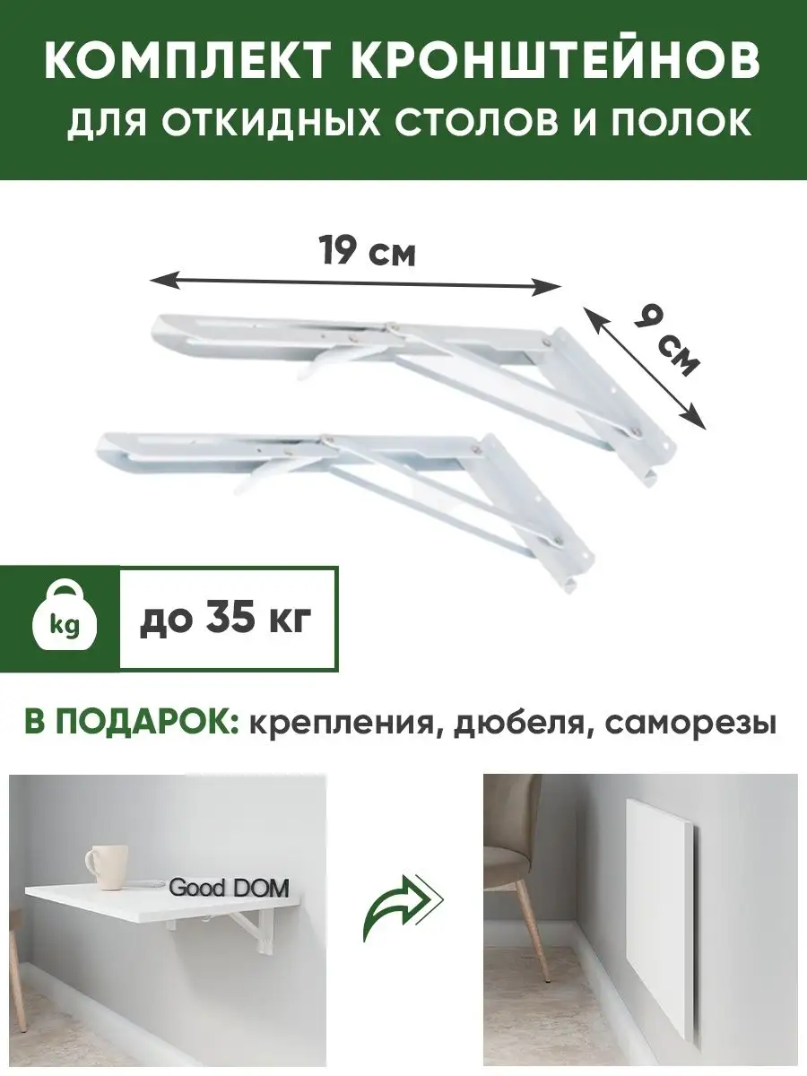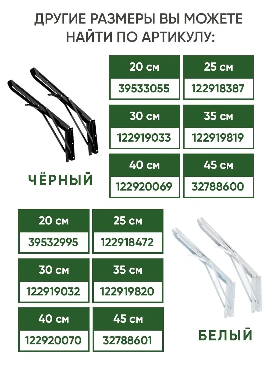 Быстро установить откидную полку или стол дома, на балконе, на даче или в мастерской помогут компактные кронштейны "Сатурн". Они надежно крепятся на любую вертикальную поверхность и способны выдержать распределенную нагрузку на столешницу от 35 кг до 50 кг. в зависимости от размера кронштейна. Столешница и пара кронштейнов и это все что вам нужно для установки стола или полки!Чтобы опустить столешницу нажмите на клавиши механизмов, расположенные под столешницей, и опустите столешницу вниз. Чтобы перевести столешницу в горизонтальное положение - просто поднимите столешницу, никаких особых усилий при этом прикладывать не нужно. Материал изготовления - сталь, поэтому товар прослужит вам несколько десятков лет. Артикулы других размеров кронштейнов: 20 см (черный - 39533055, белый - 39532995), 25 см (черный - 122918387, белый - 122918472), 30 см (черный - 122919033, белый - 122919032), 35 см (черный - 122919819, белый - 122919820), 40 см (черный - 122920069, белый - 122920070), 45 см (черный - 32788601, белый - 32788600)
