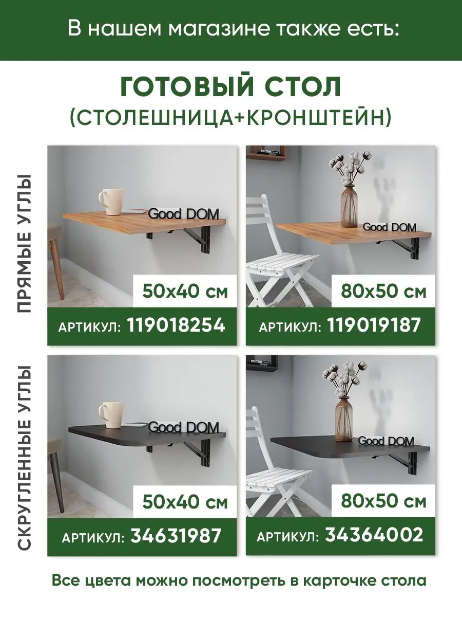 Быстро установить откидную полку или стол дома, на балконе, на даче или в мастерской помогут компактные кронштейны "Сатурн". Они надежно крепятся на любую вертикальную поверхность и способны выдержать распределенную нагрузку на столешницу от 35 кг до 50 кг. в зависимости от размера кронштейна. Столешница и пара кронштейнов и это все что вам нужно для установки стола или полки!Чтобы опустить столешницу нажмите на клавиши механизмов, расположенные под столешницей, и опустите столешницу вниз. Чтобы перевести столешницу в горизонтальное положение - просто поднимите столешницу, никаких особых усилий при этом прикладывать не нужно. Материал изготовления - сталь, поэтому товар прослужит вам несколько десятков лет. Артикулы других размеров кронштейнов: 20 см (черный - 39533055, белый - 39532995), 25 см (черный - 122918387, белый - 122918472), 30 см (черный - 122919033, белый - 122919032), 35 см (черный - 122919819, белый - 122919820), 40 см (черный - 122920069, белый - 122920070), 45 см (черный - 32788601, белый - 32788600)
