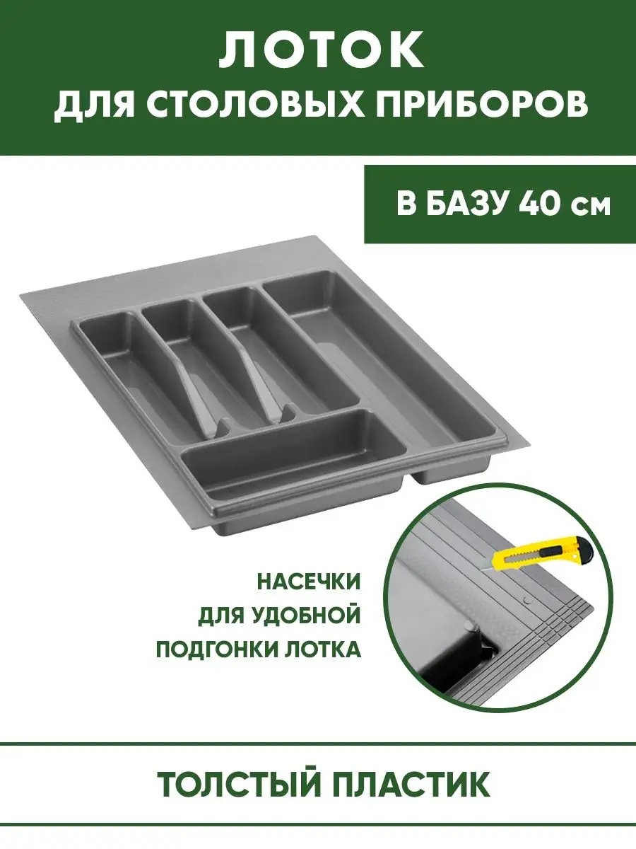 Порядок на кухне поможет поддержать наш органайзер для столовых приборов. Лоток для столовых приборов выполнен из прочного пластика высокого качества, предназначен для хранения столовых приборов, кухонных ножей и кухонных инструментов в ящике для столовых приборов. Контейнер для столовых принадлежностей поможет вам организовать удобное хранение столовых приборов. Деление на отсеки позволит удобно расположить кухонные приборы, отделив их друг от друга. Органайзер для столовых приборов имеет удобную конструкцию с 6 отделениями для размещения полного набора столовых приборов, таких как вилки, ножи, ложки, палочки для еды, штопоры для вина и т. д. Органайзер для посуды не впитывает запахи, лоток пластиковый выполнен из прочного толстого пластика – прослужит вам долгие годы. Подставка под приборы легко моется, что очень удобно для поддержания порядка на кухне и дома. При необходимости емкость для ложек и вилок можно самостоятельно уменьшить, подрезав ее по специально предназначенным рискам. Размеры: Ширина 46,5 см может быть уменьшена до 39,5 см. Длина 48,5 см может быть уменьшена до 38,5 см. Кухонный органайзер легко моется, не впитывает запахи, устойчив к царапинам. Обратите внимание размер ящика для кухни указан в базу, размер самого лотка меньше. Что такое в базу подробно и понятно расписано в инфографике. Если есть сомнения в размерах – задавайте вопрос под товаром, мы всегда рады подсказать и помочь с выбором. Другие размеры лотков, можно найти по артикулам: в базу 40 см (серый - 123669252, белый - 123669253), в базу 50 см (серый - 44728751, белый - 78506018), в базу 60 см (серый - 138555437, белый - 134275093), в базу 80 см (серый - 134279311, белый - 134279310)
