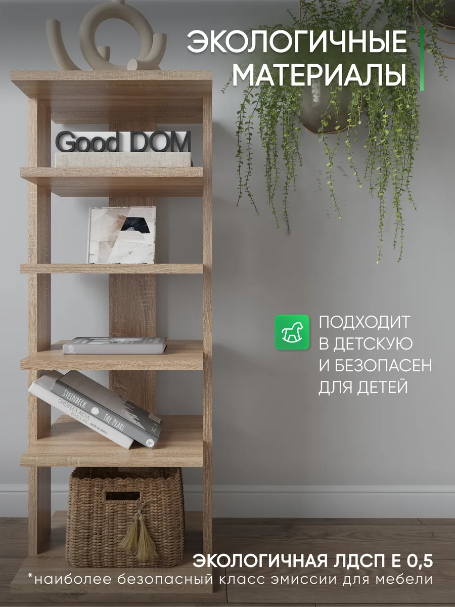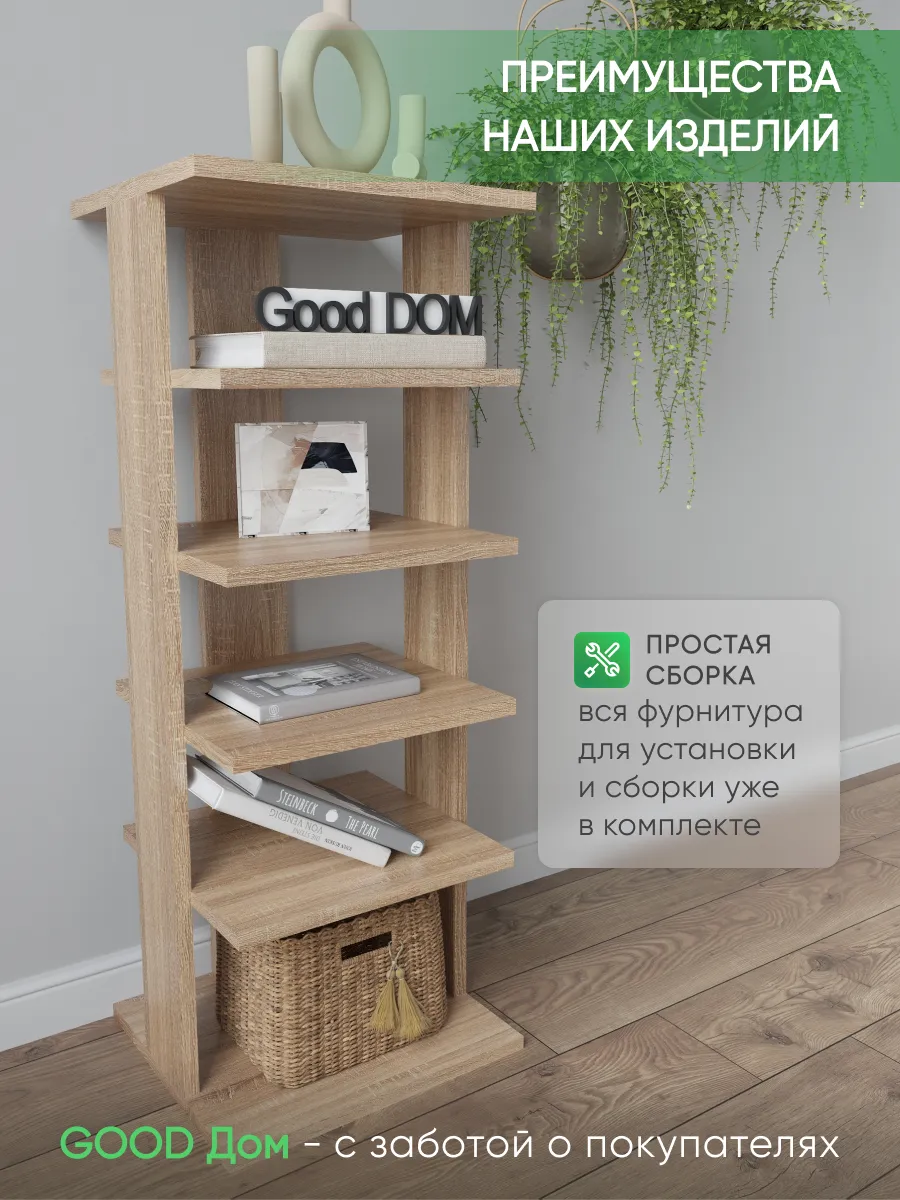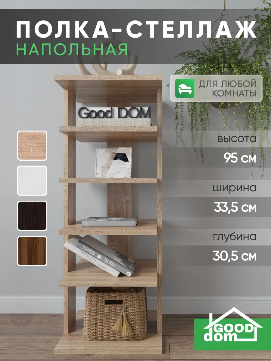 Многофункциональная мебель от бренда Good дом, все в Дом отличается своей универсальностью как и напольная полка. Многообразие цветов позволяет подобрать полку именно под Ваш интерьер, а открытые полки позволяют сделать любой цветовой акцент: разместить на полочках яркие детали, создать в помещении настроение. Полка для книг не только мебель, но и декор для любого помещения Вашего дома, квартиры, дачи, офиса. В прихожей можно хранить любую мелочь, небольшие сумочки, домашнюю обувь, а верхнюю полочку использовать для стационарного телефона, роутера. Хорошо впишется и в детскую комнату: для хранения книг со сказками или учебников, стелаж для игрушек, конструкторов, настольных игр. В гостиной используется как стеллаж для книг, фотографий, цветов. Универсальная полка позволяет экспериментировать с применением и назначением - ведь она выполняет действительно любую функцию: будь то стеллаж для книг, полка для косметики, для контейнеров с ватными дисками и ушными палочками, полка на кухню для специй, бумажных полотенец и прочего, полка для цветов или рассады. Легкий и прочный материал ЛДСП прост в уходе, размеры полки: высота - 95 см, ширина - 33,5 см, глубина - 30,5 см, вес - 9,2 кг, 5 отделений. Расстояние между полками: 16-21 см, толщина полок: 1,6 см. Имеется необходимый набор фурнитуры и подробная инструкция по сборке.