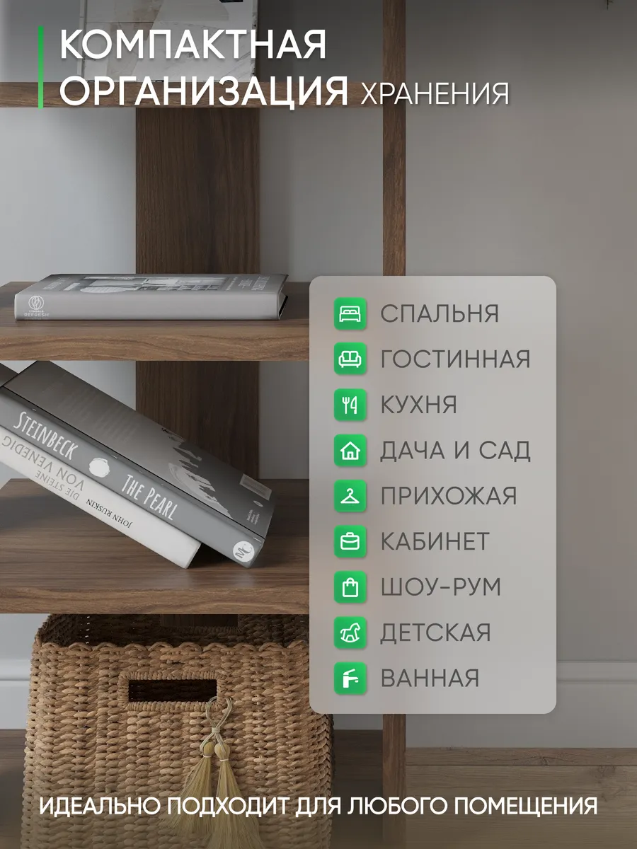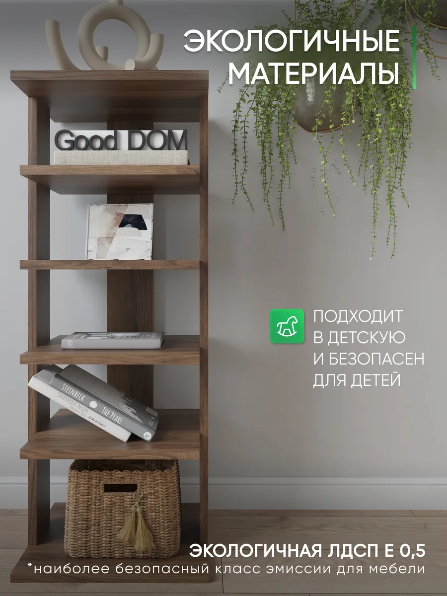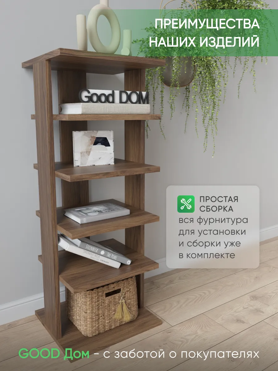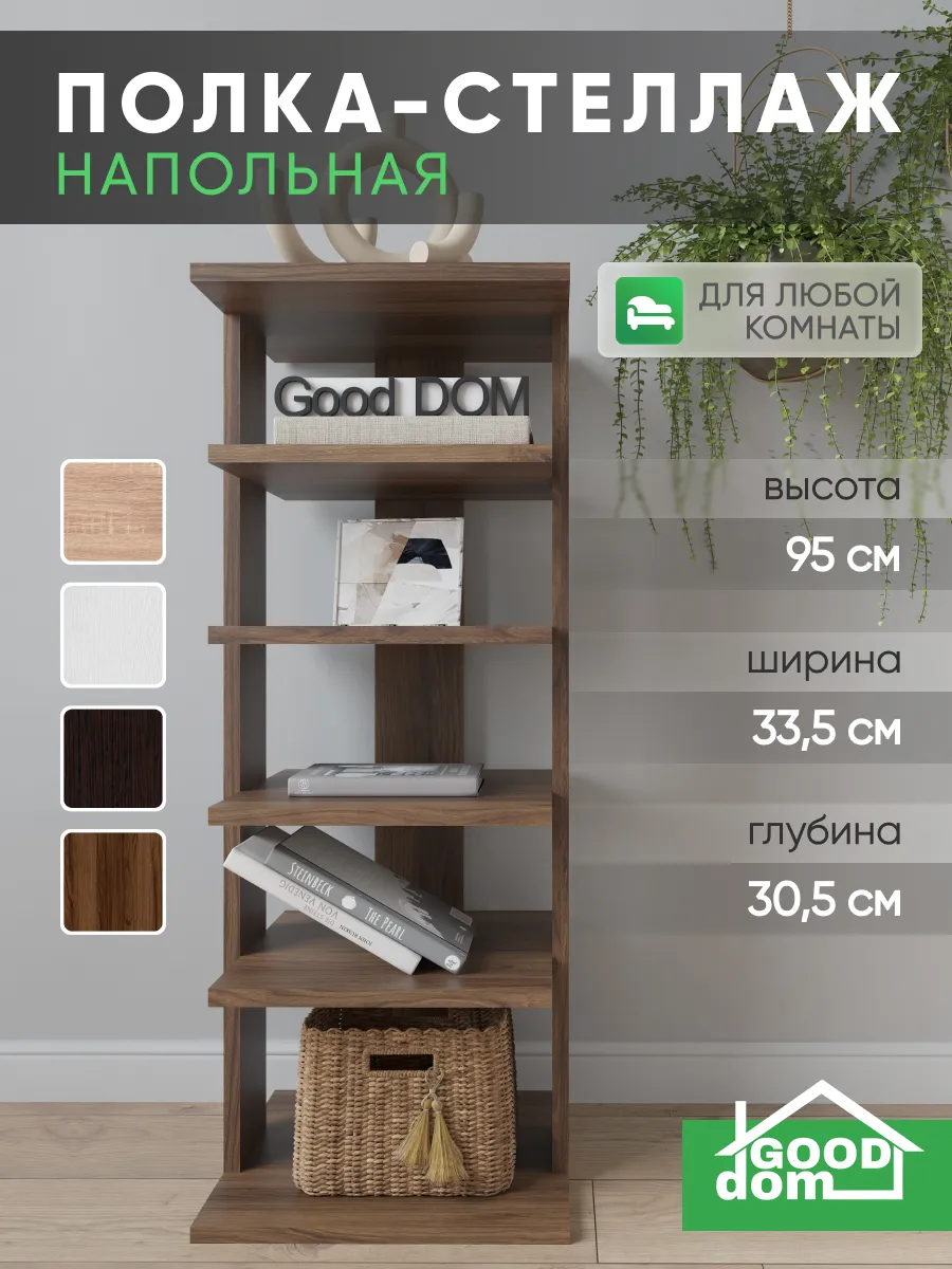 Многофункциональная мебель от бренда Good дом, все в Дом отличается своей универсальностью как и напольная полка. Многообразие цветов позволяет подобрать полку именно под Ваш интерьер, а открытые полки позволяют сделать любой цветовой акцент: разместить на полочках яркие детали, создать в помещении настроение. Полка для книг не только мебель, но и декор для любого помещения Вашего дома, квартиры, дачи, офиса. В прихожей можно хранить любую мелочь, небольшие сумочки, домашнюю обувь, а верхнюю полочку использовать для стационарного телефона, роутера. Хорошо впишется и в детскую комнату: для хранения книг со сказками или учебников, стелаж для игрушек, конструкторов, настольных игр. В гостиной используется как стеллаж для книг, фотографий, цветов. Универсальная полка позволяет экспериментировать с применением и назначением - ведь она выполняет действительно любую функцию: будь то стеллаж для книг, полка для косметики, для контейнеров с ватными дисками и ушными палочками, полка на кухню для специй, бумажных полотенец и прочего, полка для цветов или рассады. Легкий и прочный материал ЛДСП прост в уходе, размеры полки: высота - 95 см, ширина - 33,5 см, глубина - 30,5 см, вес - 9,2 кг, 5 отделений. Расстояние между полками: 16-21 см, толщина полок: 1,6 см. Имеется необходимый набор фурнитуры и подробная инструкция по сборке.