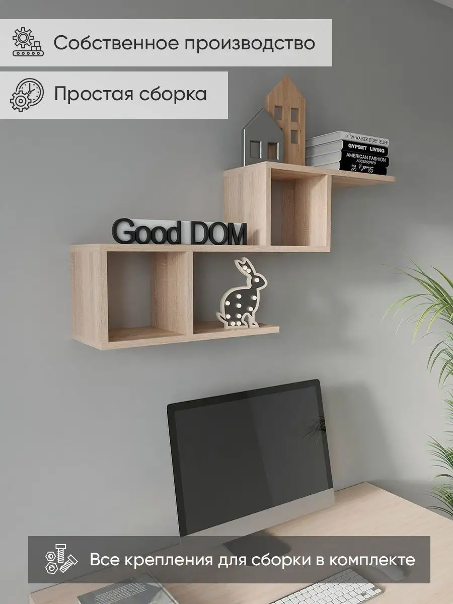 Полка настенная “Декор” – это мебель трансформер. Полка двухъярусная с секциями имеет 4 варианта сборки, что позволит выбрать вариант навесной полки, подходящий именно Вам. Полка универсальна, подходит в любое помещение: спальня, прихожая, коридор, гостиная, детская. Наша полка на стену с легкостью заменит громоздкую стенку в гостиной, стеллаж или комод. Полка белая отлично впишется в детскую комнату для игрушек, картин, фотографий, детских книжек, как полка для кухни подойдёт для хранения посуды, специй, банок, растений на кухне (кухонная полка), как полка для икон. Подвесная полка превосходно будет смотреться и в кабинете как полка настенная книжная или для цветов. На балкон - для инструментов или для рассады Полочка может стать полкой под цветы, стенкой в спальню, полкой для книг, уместит на себе вещи для декора комнаты – полочка декоративная. Полка в прихожую поможет разместить головные уборы, зонтики, сумки, письма, документы, для роутера. Полку можно использовать в салоне – полка для лаков, для косметики, как витринную полку для продажи товара. Мебельная полка украсит абсолютно любой интерьер, а палитра поможет выбрать шкаф навесной под Ваш существующий интерьер. Полка легко собирается, вес необходимый комплект фурнитуры для сборки идёт в комплекте. Полка-трансформер очень интересное решение, теперь чтобы освежить пространство не обязательно покупать новую мебель, достаточно поменять сборку и помещение заиграет по новому. Легкий материал полки ЛДСП практичен, долговечен и прост в уходе. В нашем ассортименте представлена другая мебель интересных и практичных моделей – вы можете легко посмотреть весь ассортимент, щелкнув на значок логотипа. Мы постоянно работаем над качеством нашей продукции, поэтому улучшили упаковку - наша УСИЛЕННАЯ УПАКОВКА ЗАЩИТИТ Вашу полку при доставке ОТ СЛОМАННЫХ УГЛОВ и СКОЛОВ!