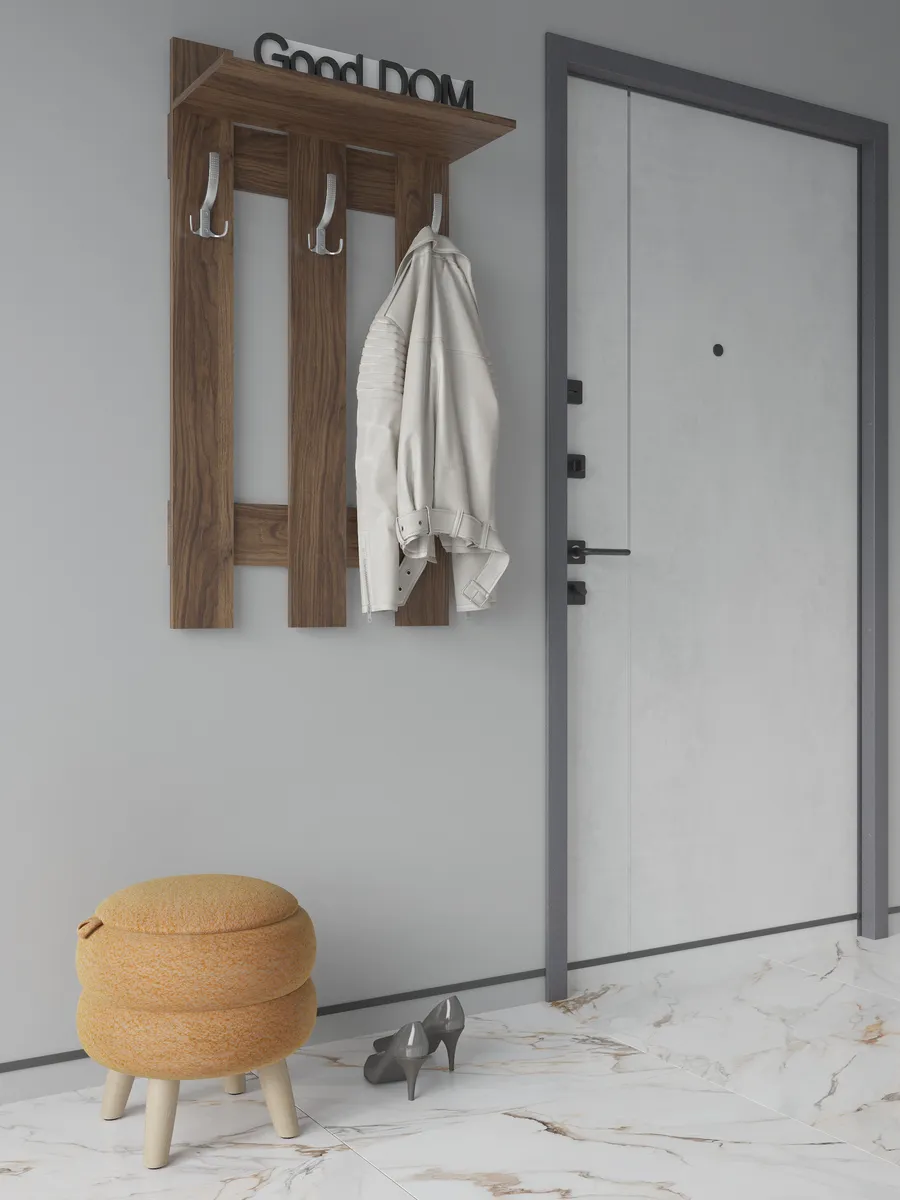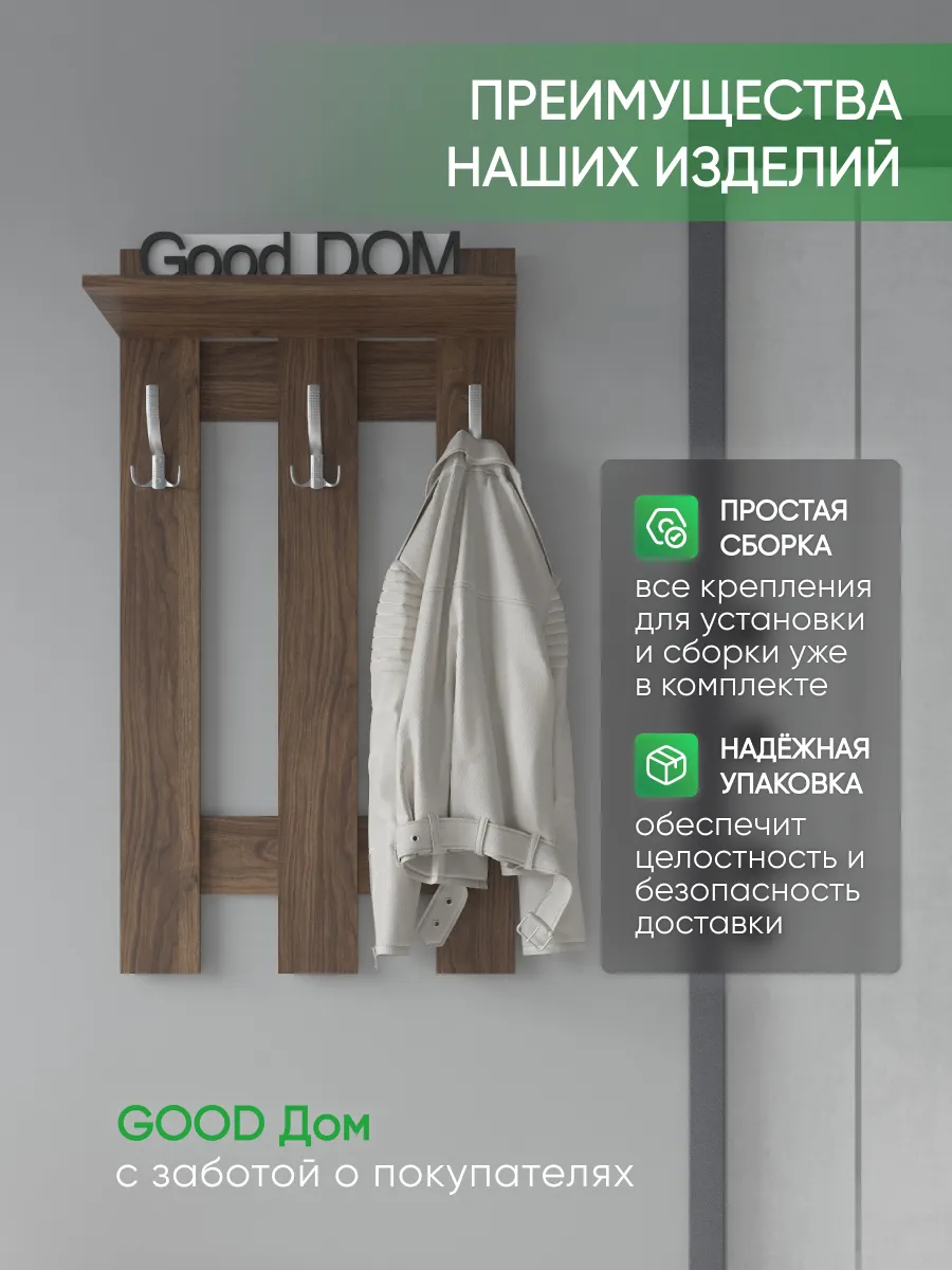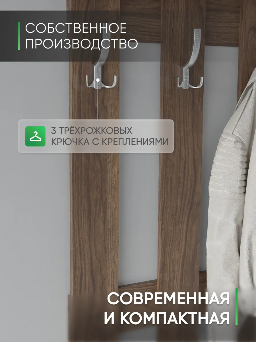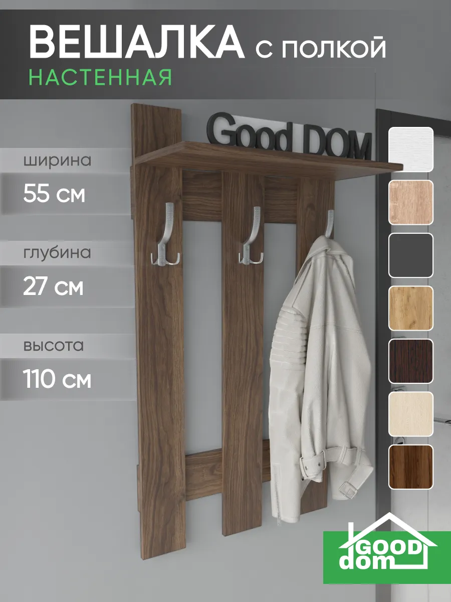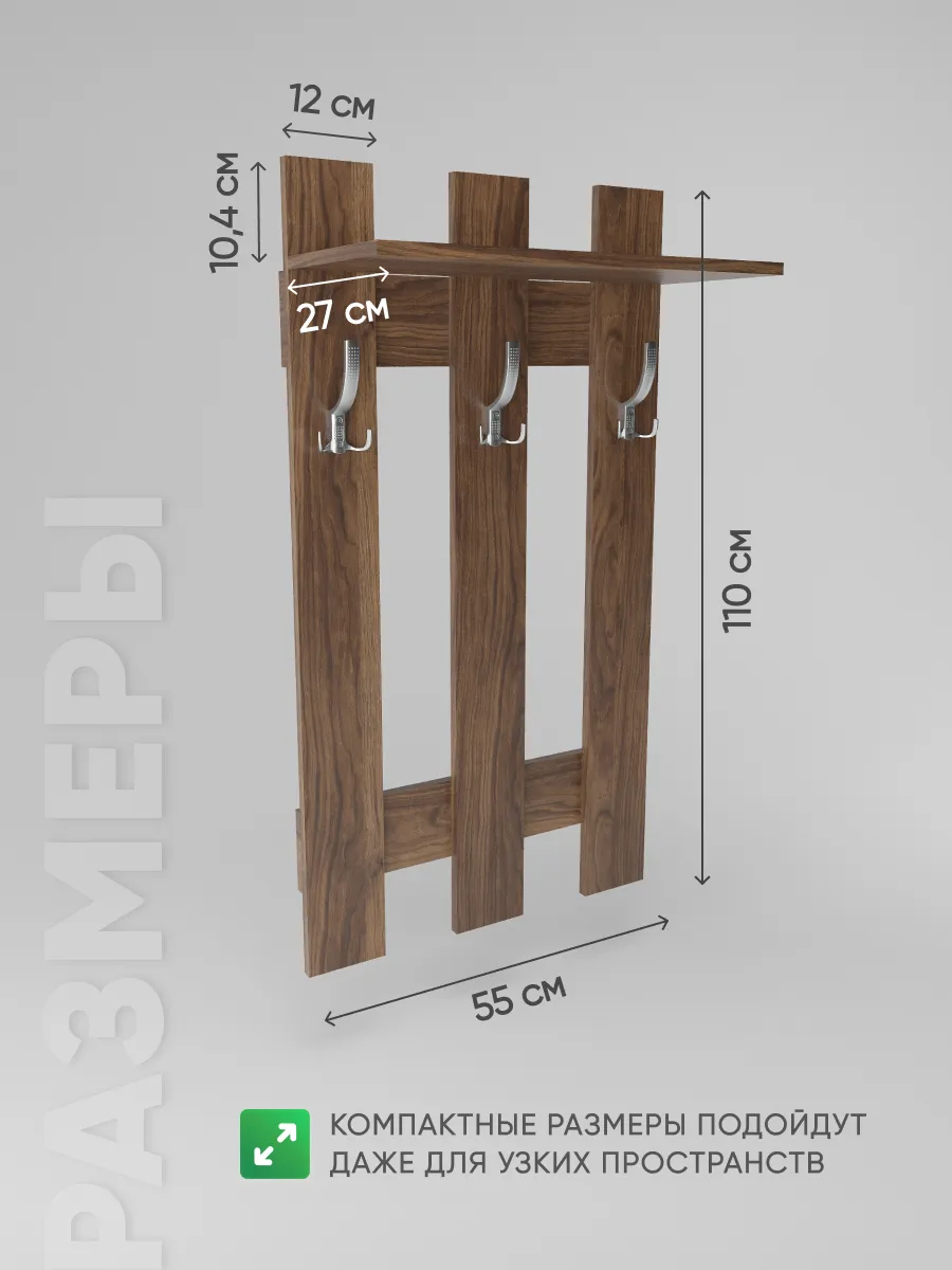 Эргономичная и практичная вешалка для одежды настенная в прихожую помогает решать сразу несколько задач. Прихожая мебель вешалка прекрасно вписывается в интерьер, не загромождает пространство и позволяет комфортно расположить верхнюю одежду и головные уборы. Компактный размер мебели в прихожую позволяет разместить вешалку даже в самой маленькой прихожей, при необходимости рядом можно повесить зеркало на стену. Вешалка в прихожую настенная идет в комплекте с необходимым комплектом фурнитуры. Крючки для одежды являются стильным дополнением вешалки на стену. На верхней навесной полке можно разместить головные уборы, шарфы, перчатки. Вешалка деревянная в коридор в летнее время становится вешалкой для сумок, рюкзаков, пляжных сумок. Вешалка с крючками на стену выполнена ЛДСП, цвета: белая, дуб сонома, орех, атланта, венге, дуб золотой, антрацит, дуб катания. Используемые материалы легки в уходе. Так же в нашем магазине Good дом, все в Дом вы можете подобрать другую мебель для прихожей этого же цвета и сохранить единый стиль.