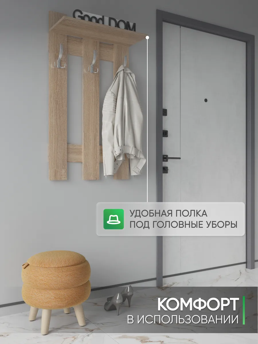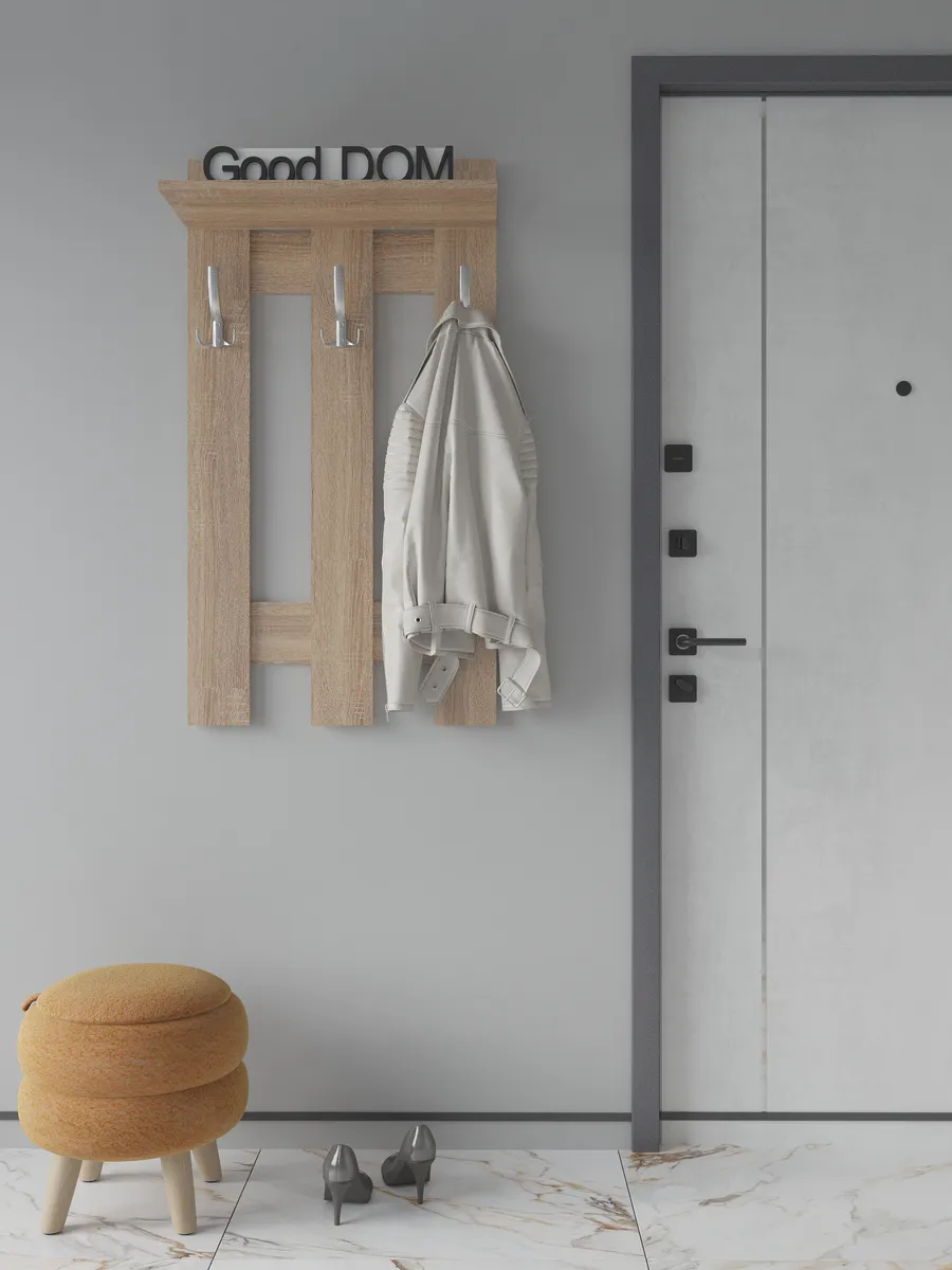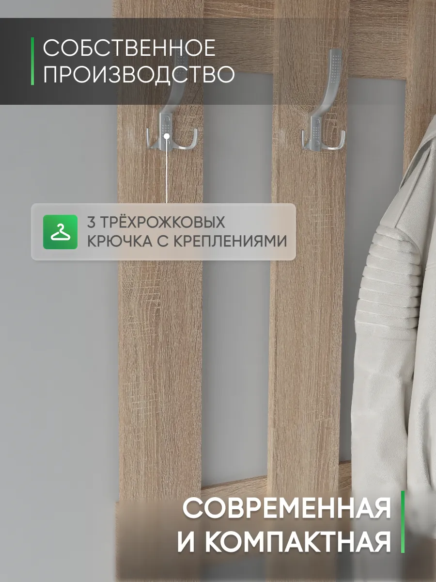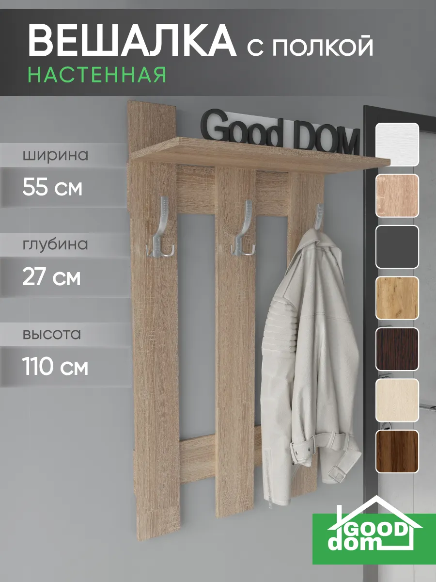 Эргономичная и практичная вешалка для одежды настенная в прихожую помогает решать сразу несколько задач. Прихожая мебель вешалка прекрасно вписывается в интерьер, не загромождает пространство и позволяет комфортно расположить верхнюю одежду и головные уборы. Компактный размер мебели в прихожую позволяет разместить вешалку даже в самой маленькой прихожей, при необходимости рядом можно повесить зеркало на стену. Вешалка в прихожую настенная идет в комплекте с необходимым комплектом фурнитуры. Крючки для одежды являются стильным дополнением вешалки на стену. На верхней навесной полке можно разместить головные уборы, шарфы, перчатки. Вешалка деревянная в коридор в летнее время становится вешалкой для сумок, рюкзаков, пляжных сумок. Вешалка с крючками на стену выполнена ЛДСП, цвета: белая, дуб сонома, орех, атланта, венге, дуб золотой, антрацит, дуб катания. Используемые материалы легки в уходе. Так же в нашем магазине Good дом, все в Дом вы можете подобрать другую мебель для прихожей этого же цвета и сохранить единый стиль.