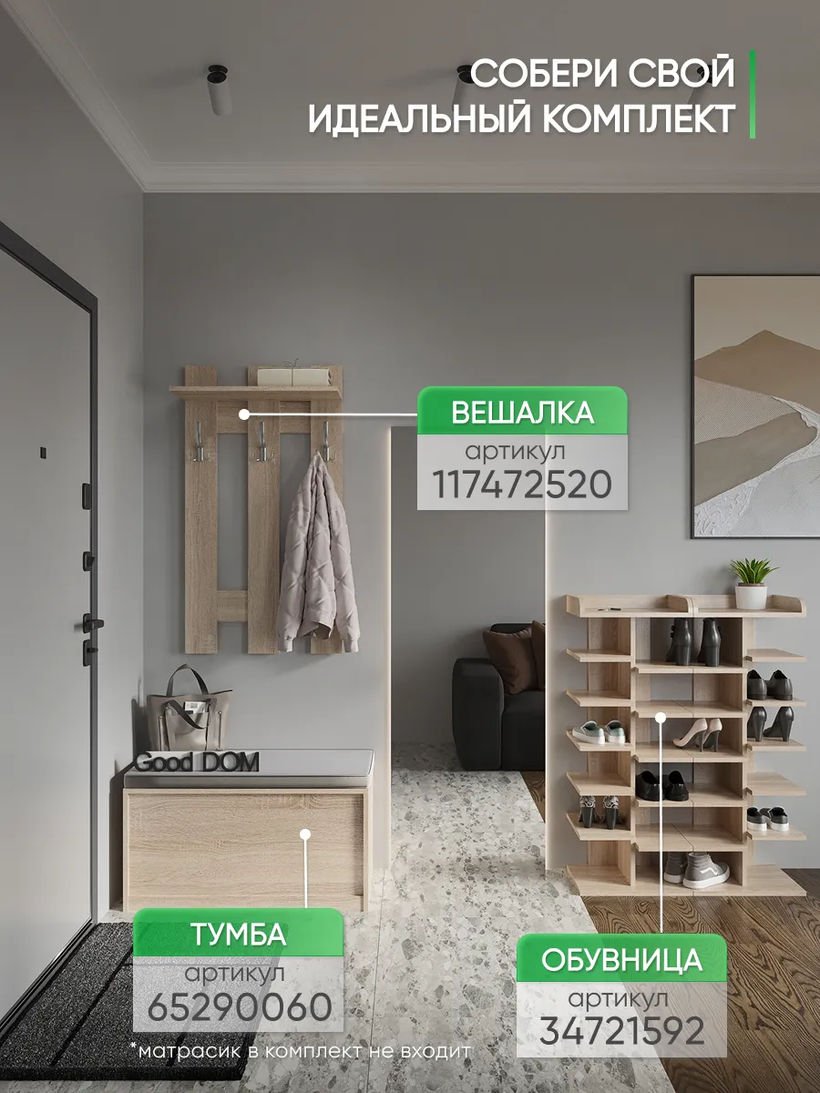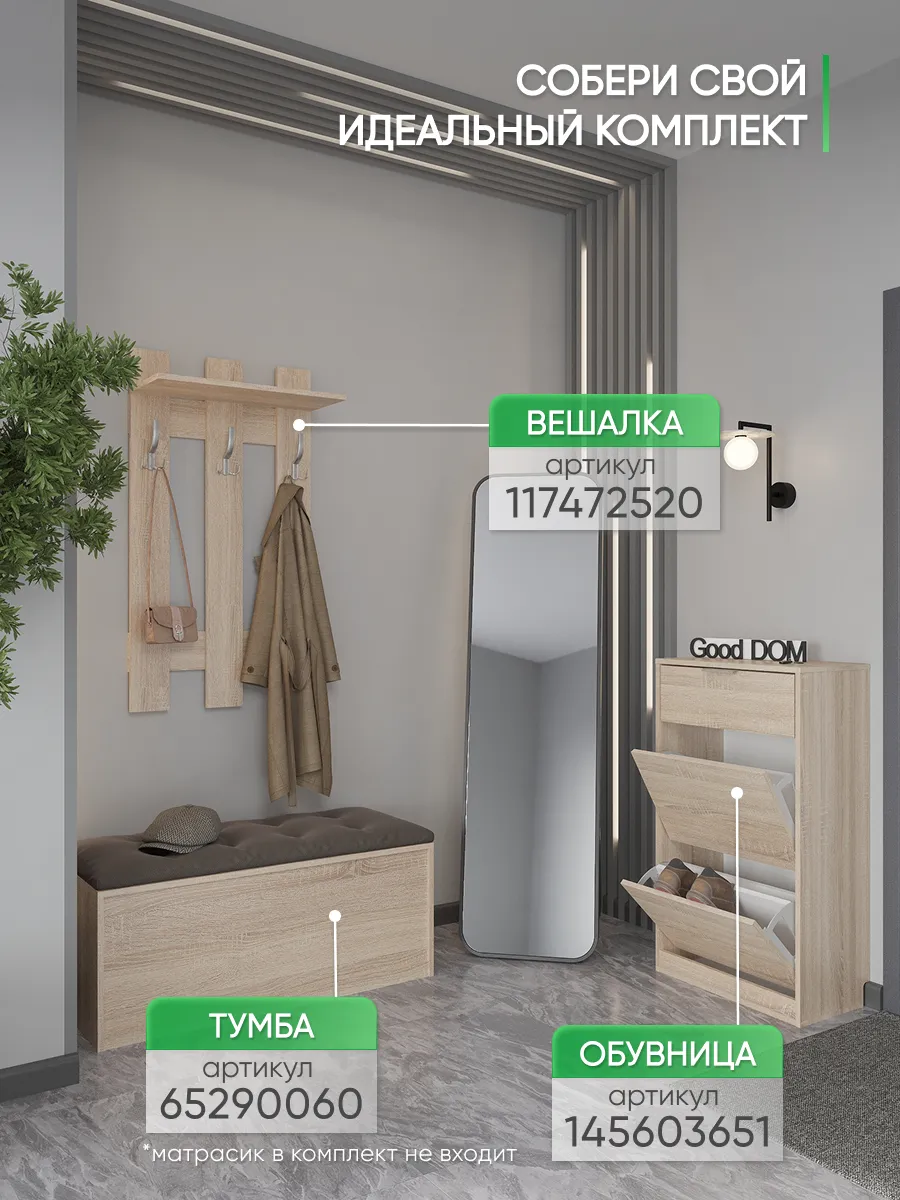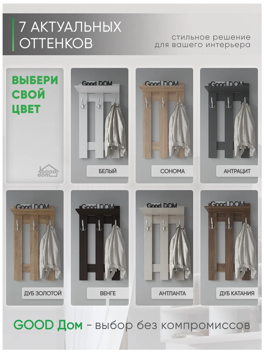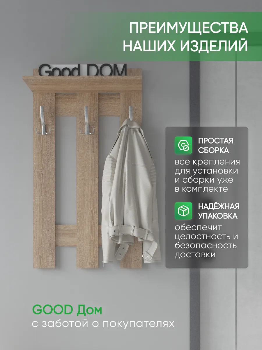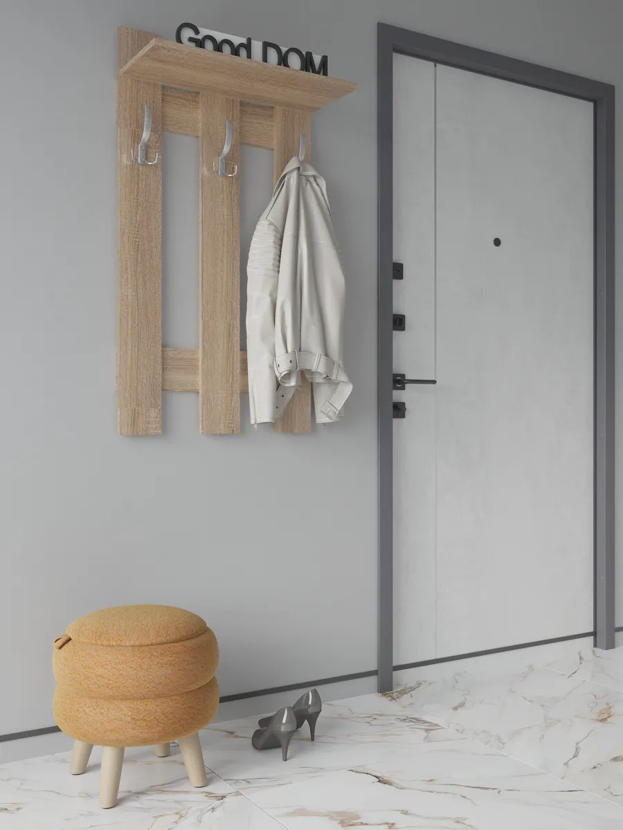 Эргономичная и практичная вешалка для одежды настенная в прихожую помогает решать сразу несколько задач. Прихожая мебель вешалка прекрасно вписывается в интерьер, не загромождает пространство и позволяет комфортно расположить верхнюю одежду и головные уборы. Компактный размер мебели в прихожую позволяет разместить вешалку даже в самой маленькой прихожей, при необходимости рядом можно повесить зеркало на стену. Вешалка в прихожую настенная идет в комплекте с необходимым комплектом фурнитуры. Крючки для одежды являются стильным дополнением вешалки на стену. На верхней навесной полке можно разместить головные уборы, шарфы, перчатки. Вешалка деревянная в коридор в летнее время становится вешалкой для сумок, рюкзаков, пляжных сумок. Вешалка с крючками на стену выполнена ЛДСП, цвета: белая, дуб сонома, орех, атланта, венге, дуб золотой, антрацит, дуб катания. Используемые материалы легки в уходе. Так же в нашем магазине Good дом, все в Дом вы можете подобрать другую мебель для прихожей этого же цвета и сохранить единый стиль.