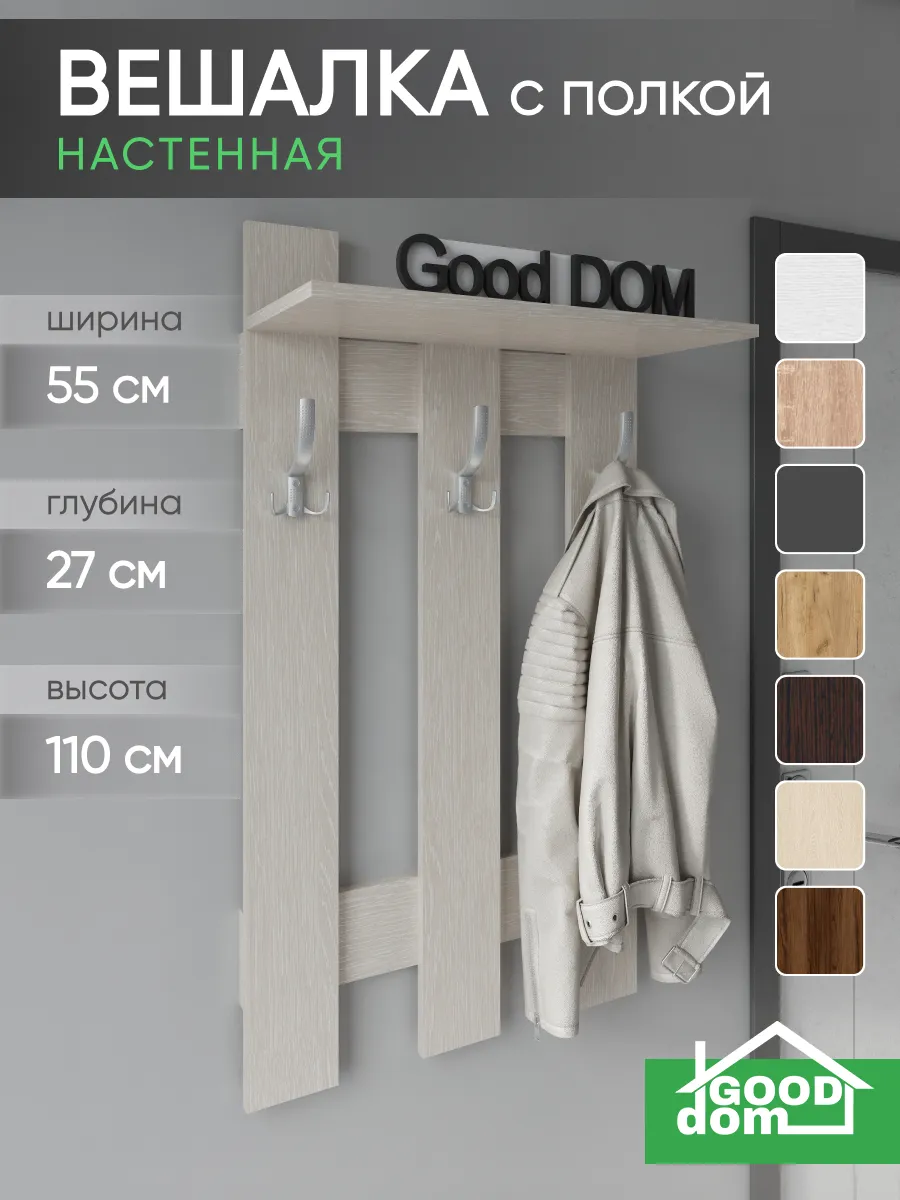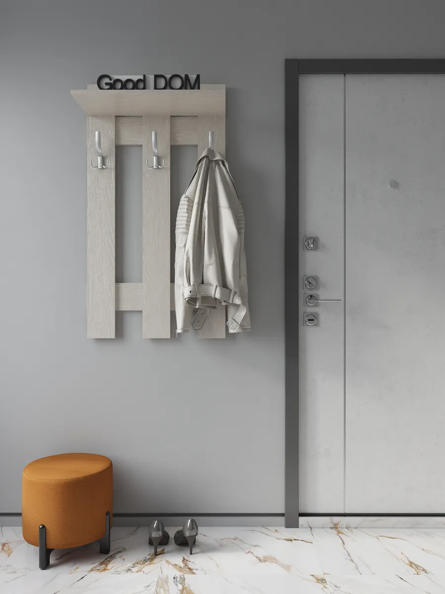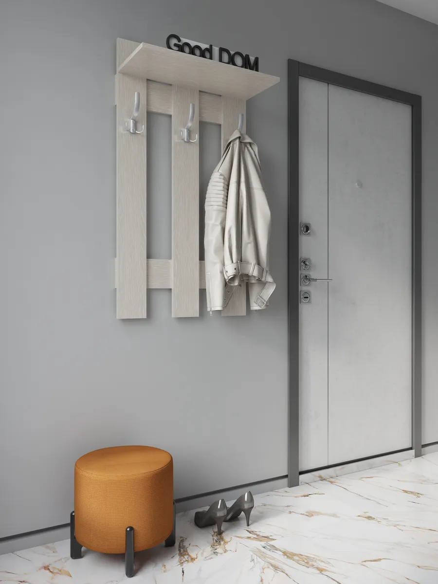 Эргономичная и практичная вешалка для одежды настенная в прихожую помогает решать сразу несколько задач. Прихожая мебель вешалка прекрасно вписывается в интерьер, не загромождает пространство и позволяет комфортно расположить верхнюю одежду и головные уборы. Компактный размер мебели в прихожую позволяет разместить вешалку даже в самой маленькой прихожей, при необходимости рядом можно повесить зеркало на стену. Вешалка в прихожую настенная идет в комплекте с необходимым комплектом фурнитуры. Крючки для одежды являются стильным дополнением вешалки на стену. На верхней навесной полке можно разместить головные уборы, шарфы, перчатки. Вешалка деревянная в коридор в летнее время становится вешалкой для сумок, рюкзаков, пляжных сумок. Вешалка с крючками на стену выполнена ЛДСП, цвета: белая, дуб сонома, орех, атланта, венге, дуб золотой, антрацит, дуб катания. Используемые материалы легки в уходе. Так же в нашем магазине Good дом, все в Дом вы можете подобрать другую мебель для прихожей этого же цвета и сохранить единый стиль.