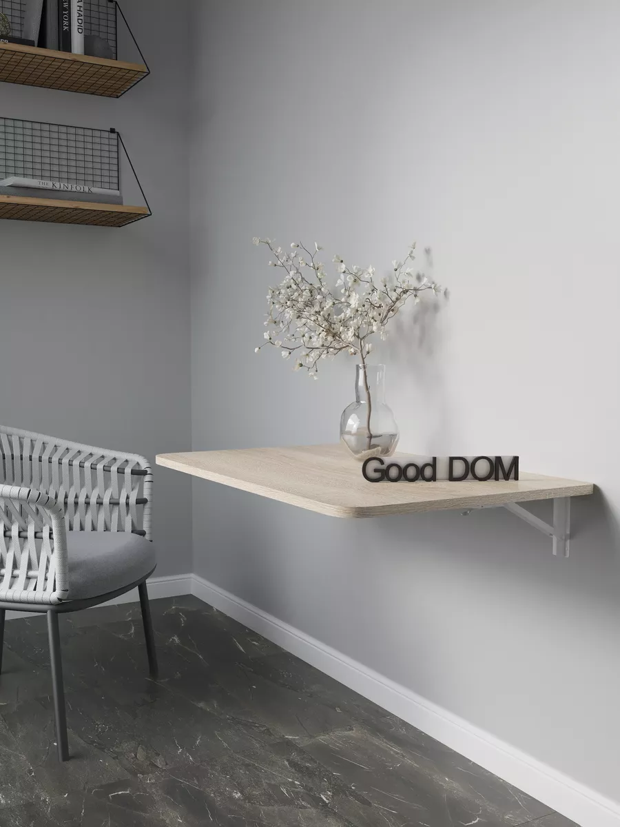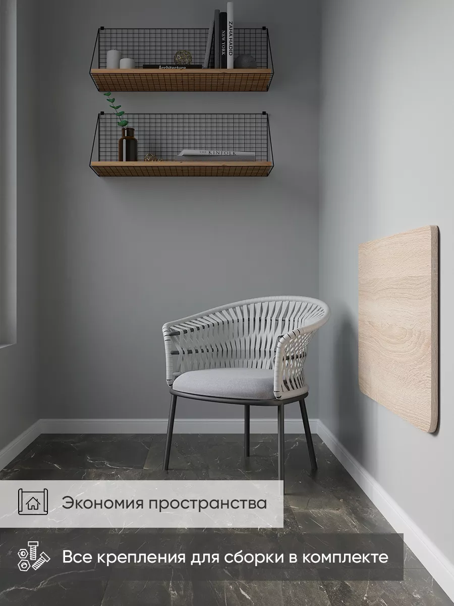 Откидной настенный стол “Сатурн” со своей конструкцией и креплениями к стене отлично подойдет в качестве мебели на кухню, балкон, в загородный дом (для дачи), в любую комнату. Отменное качество мебели может служить Вам долгое время в качестве обеденного, письменного, журнального, компьютерного стола. Стол откидной можно установить абсолютно в любое помещение, где Вам необходимо. Требуется лишь вертикальная поверхность, к которой он крепится надежными креплениями из стали. Конструкция стола позволяет выдерживать распределенную нагрузку до 50 кг. Поэтому складной стол настенный предполагает очень широкое применение. На кухне и даче на нем можно выполнять любые хозяйственные работы: резать продукты, месить тесто, ставить на него тяжелые кастрюли. В комнате за столом удобно писать, механизм для откидного стола обеспечивает легкий поворот и надежную фиксацию. Качественная, удобная и совсем недорогая конструкция решит ваши проблемы: не будет ни тесноты, ни обид. В небольших помещениях, таких как балкон и лоджия, можно организовать уютное место для отдыха, за столиком приятно попить чай или кофе, полистать журналы и почитать книги, газеты. В сложенном виде стол выглядит как просто дощечка, прижатая к стене, а в разложенном - удобная, прочная и многофункциональная поверхность. Стол на стену изготовлен из ЛДСП - материала крепкого, надежного и долговечного. Товар сертифицирован, соответствует ГОСТам, действует гарантия от производителя. В сложенном виде от стены до столешницы 3 см. + столешница 1,6 см.