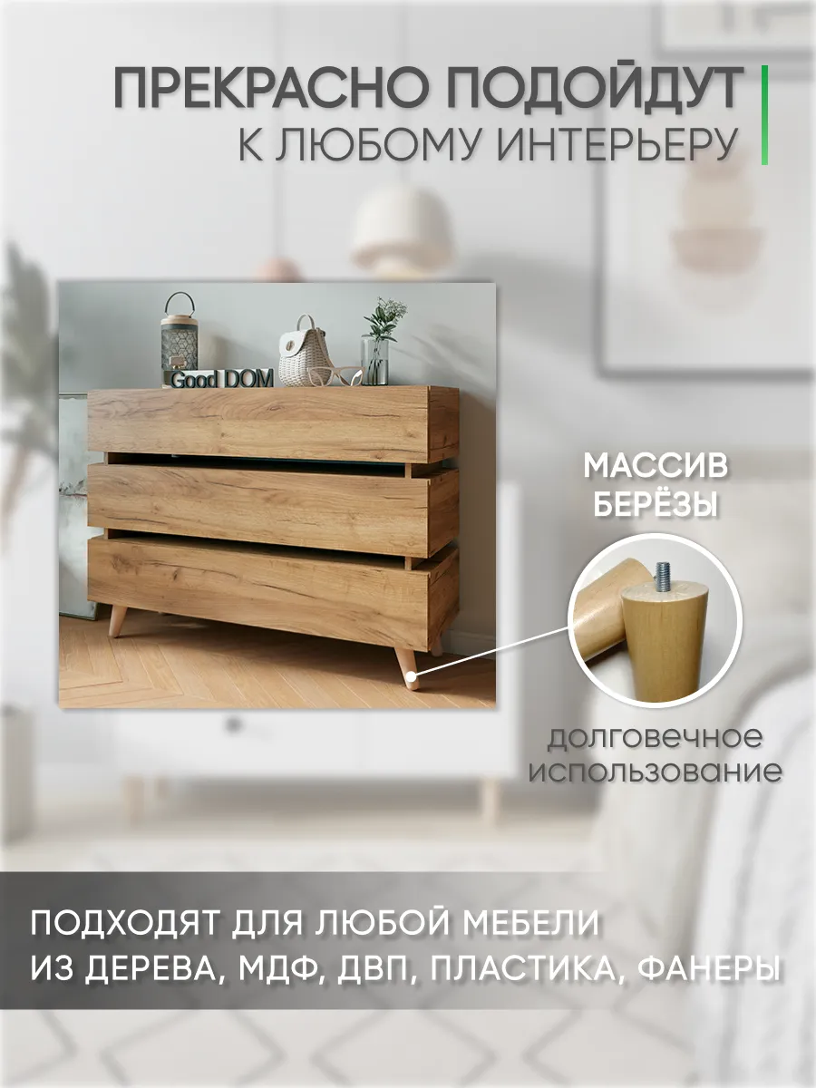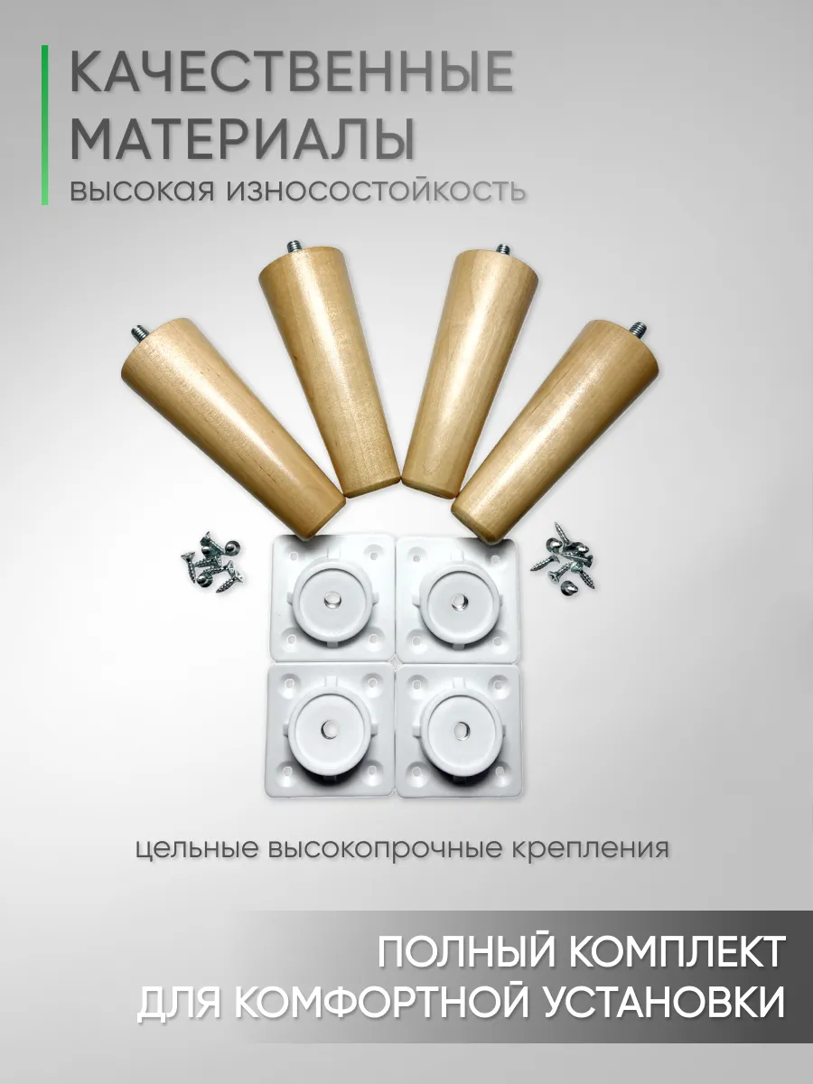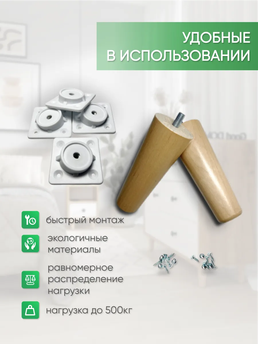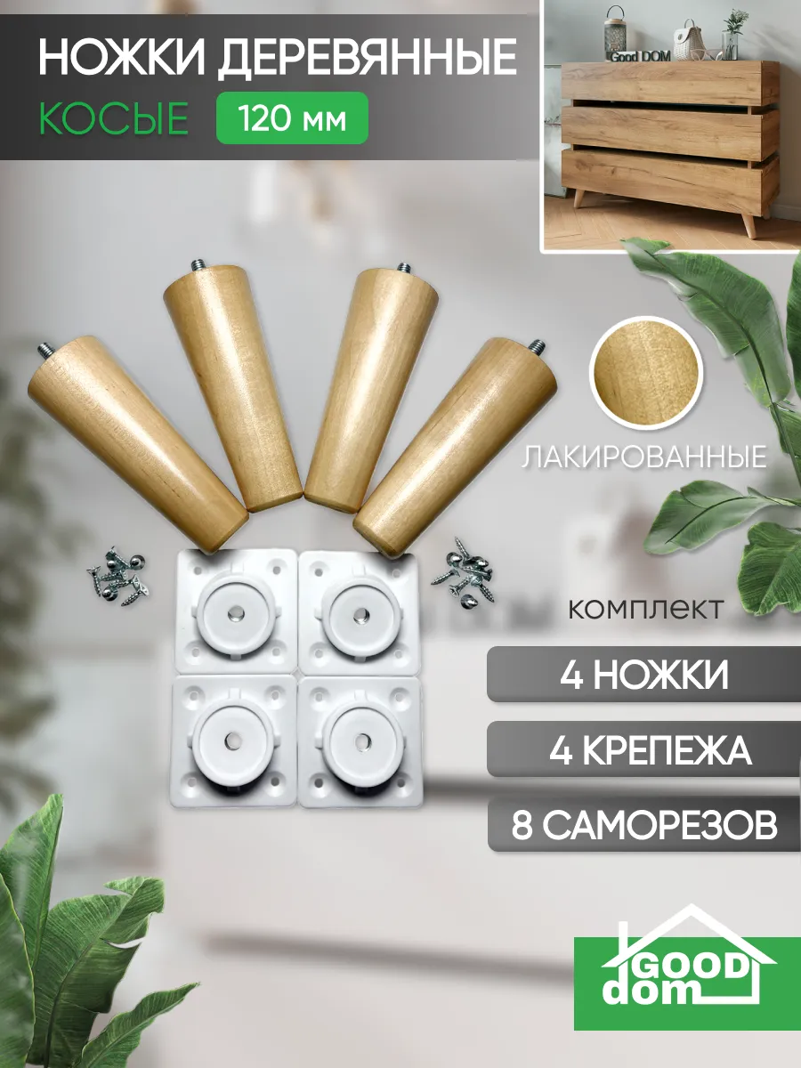 Ножки деревянные придадут мебели стильный и аккуратный вид. Комплект ножек состоит из набора из 4 косых деревянных ножек высотой 120 мм, 4 литых крепления из высокопрочного пластика и саморезов. Ножки мебельные изготовлены из прочного массива березы, покрыты износостойкой краской, устойчивой к истиранию и влаге. Гладкая поверхность деревянных ножек не требует дополнительной обработки. Комплект мебельных ножек идеально подходят для комодов, тумбочек, шкафов и другой мебели. Легкая и быстрая установка – в комплекте ножек идет надежный крепеж. Обновите интерьер быстро и просто! В производстве деревянных ножек мы используем натуральные и экологичные материалы. Косой дизайн деревянных ножек – универсален для любой мебели. Создавайте уют в современном стиле, добавив своей мебели качественные деревянные ножки с опорами. В нашем производстве мебели мы так же используем деревянные ножки и уверены в качестве продукции. Так же в нашем магазине Good дом, все в Дом вы можете подобрать качественную и стильную мебель для вашего интерьер