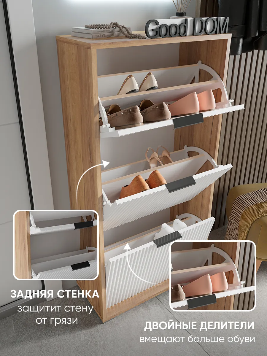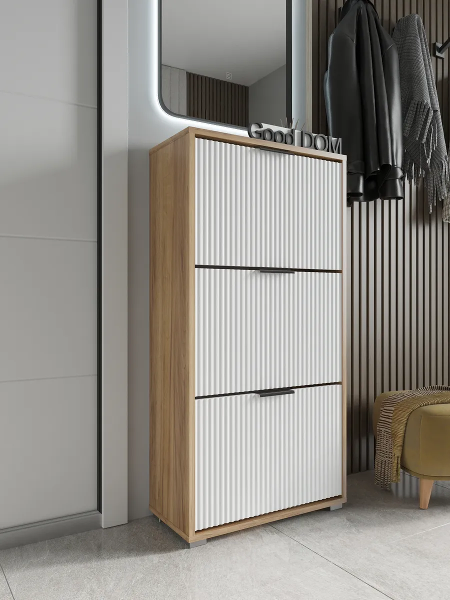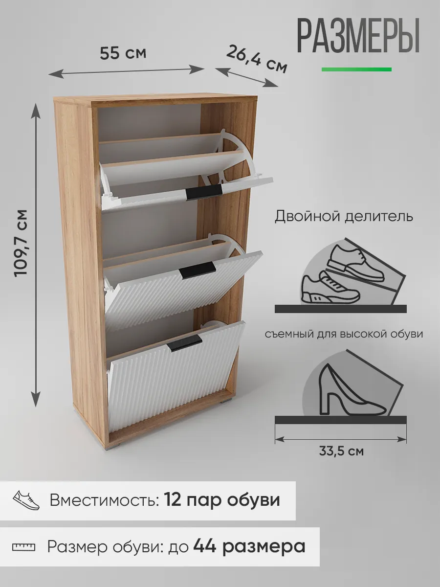 Шкаф для хранения обуви представляет собой стильный деревянный стеллаж с дверцами, идеально подходящий для коридора или гардеробной зоны дома. Этот компактный и вместительный шкафчик выполнен из дуба с тонкой панелью и качественной фурнитурой, что обеспечивает надежность и долговечность. Высокий шкаф оснащен разделителем, который позволяет аккуратно разместить пару туфель, сапог или другую обувь, сохраняя порядок и удобство в использовании.