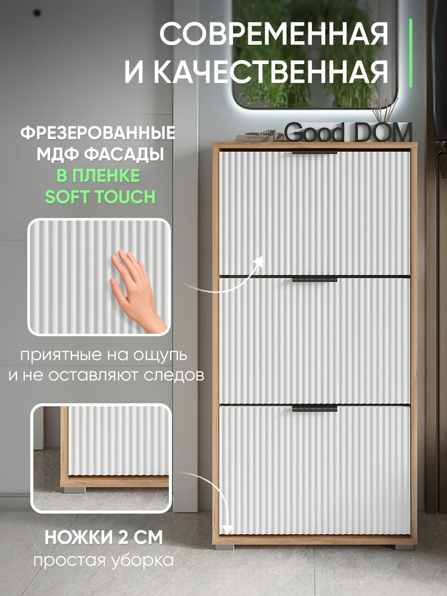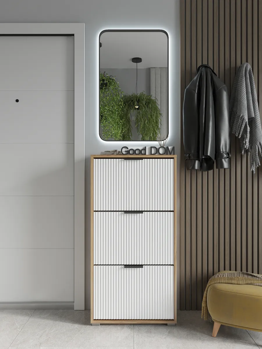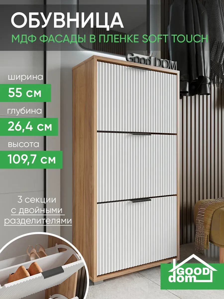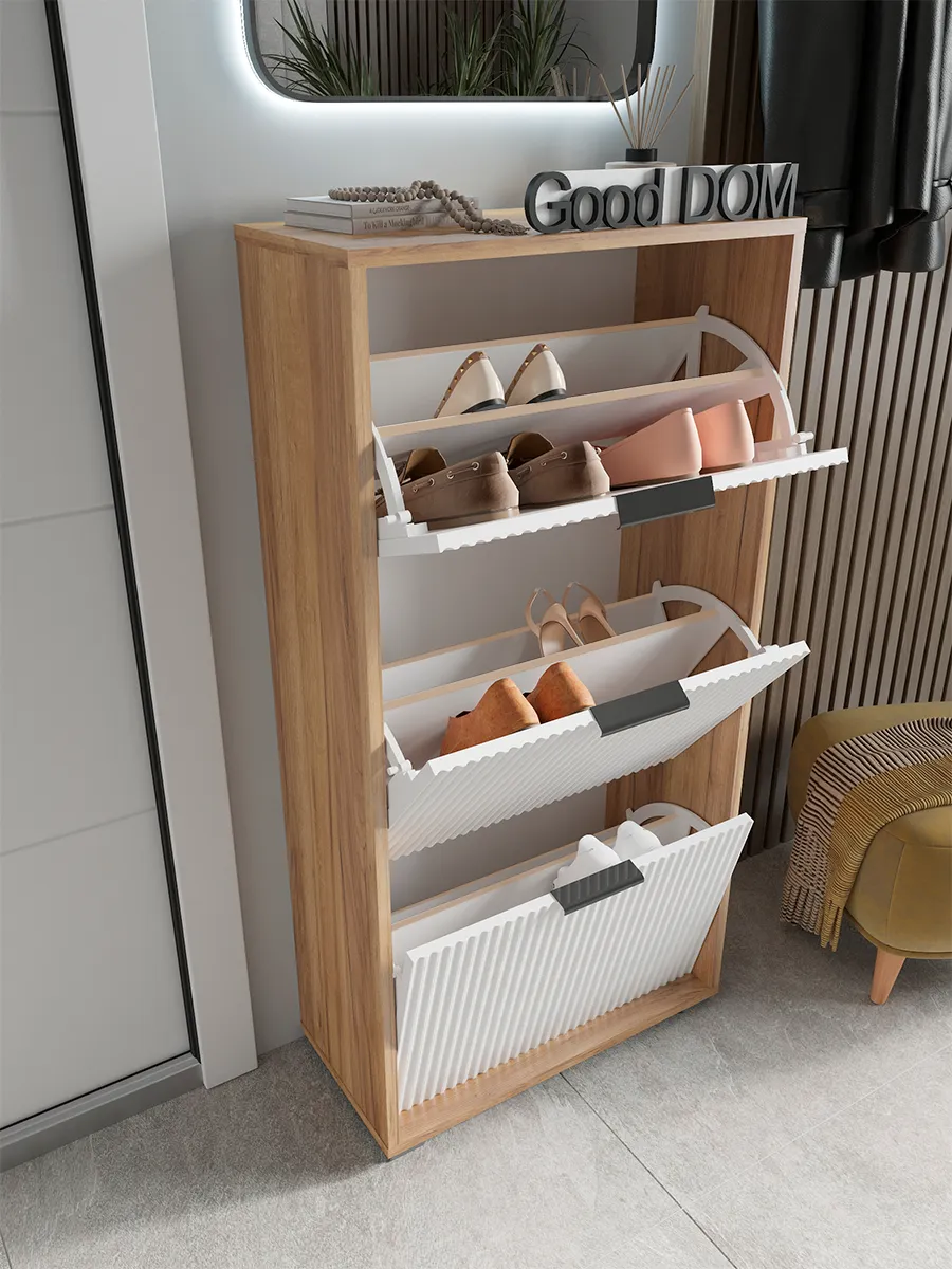 Шкаф для хранения обуви представляет собой стильный деревянный стеллаж с дверцами, идеально подходящий для коридора или гардеробной зоны дома. Этот компактный и вместительный шкафчик выполнен из дуба с тонкой панелью и качественной фурнитурой, что обеспечивает надежность и долговечность. Высокий шкаф оснащен разделителем, который позволяет аккуратно разместить пару туфель, сапог или другую обувь, сохраняя порядок и удобство в использовании.