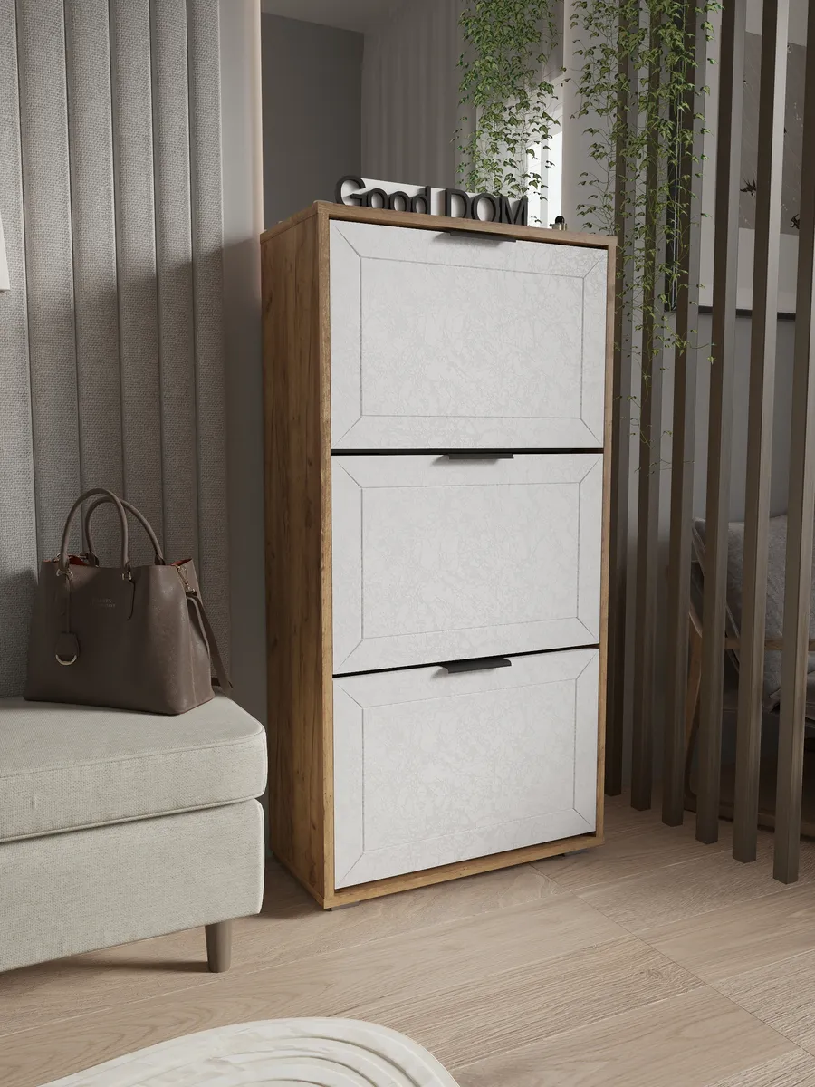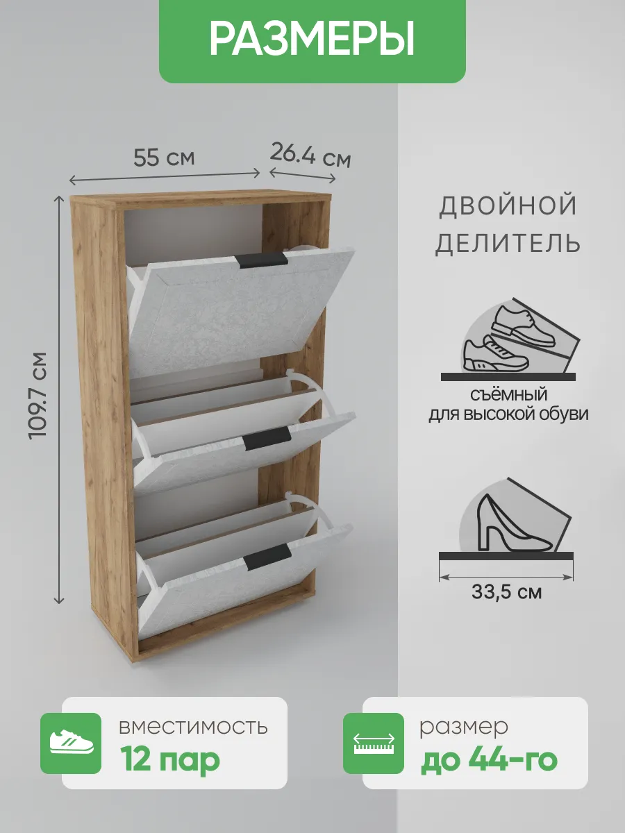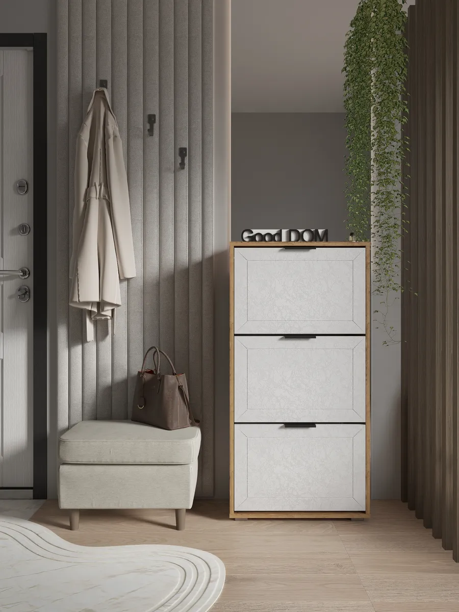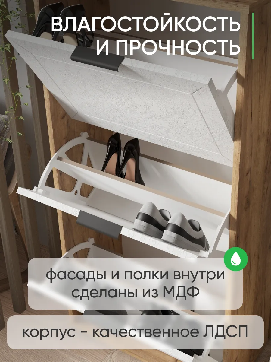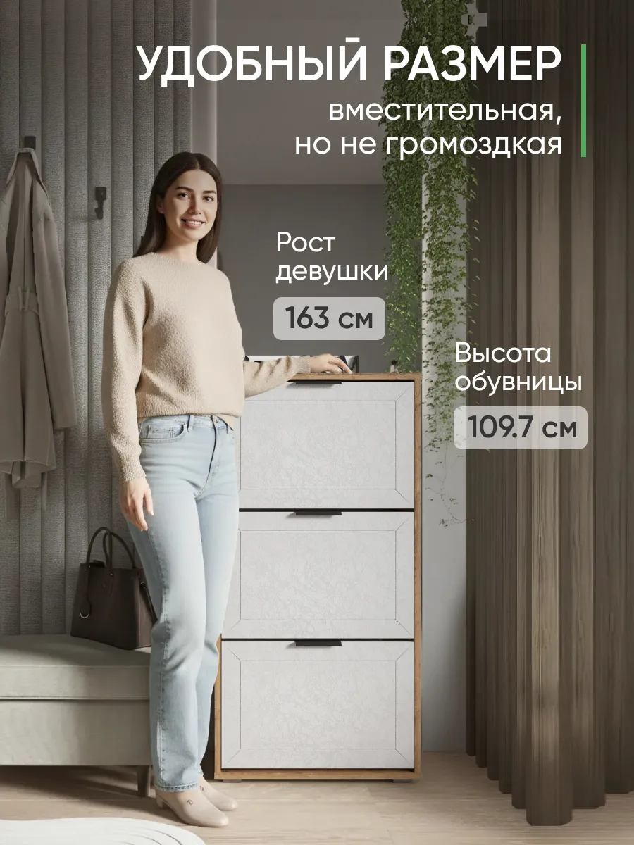 Обувница идеально подходит для бережного хранения обуви в различных помещениях — прихожая, коридор, гардероб, кладовая, балкон, кладовка или гардеробный. Это компактный и узкий элемент мебели, благодаря чему ее легко разместить даже в небольшом пространстве. Стильный дизайн хорошо впишется в интерьер дома в современном или лофт стиле. Дверца открывается плавно, что обеспечивает удобный доступ к обуви. Для хранения предусмотрены полки разной высоты — под низкий, высокий, невысокий сапог или для мелочи. Обувной предмет выполнен с приятным, лаконичным фасадом, его можно использовать как этажерка, подставка или стеллаж. Конструкция slim позволяет ставить обувницу вдоль стены, около плинтуса, за задний фрагмент стенки или под зеркало, а также использовать дизайнерский вырез в интерьере прихожей или коридора. Оттенок золотого дуба в сочетании с белыми фасадами обувницы подчеркивает универсальный характер изделия, делая его уместным для гардеробных и кладовых.