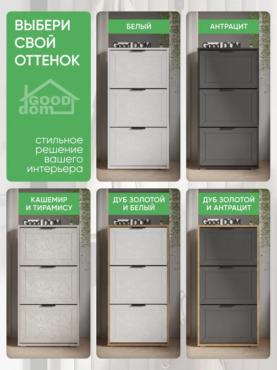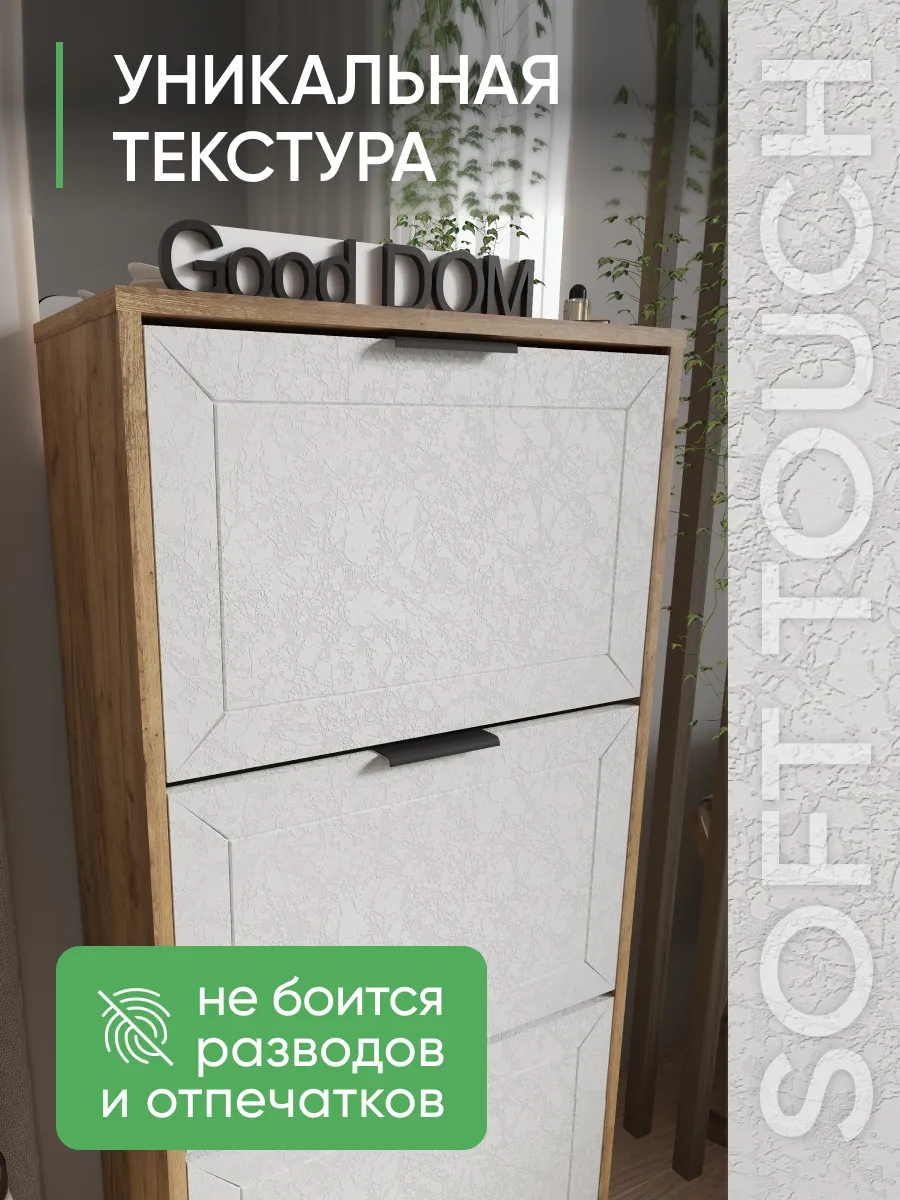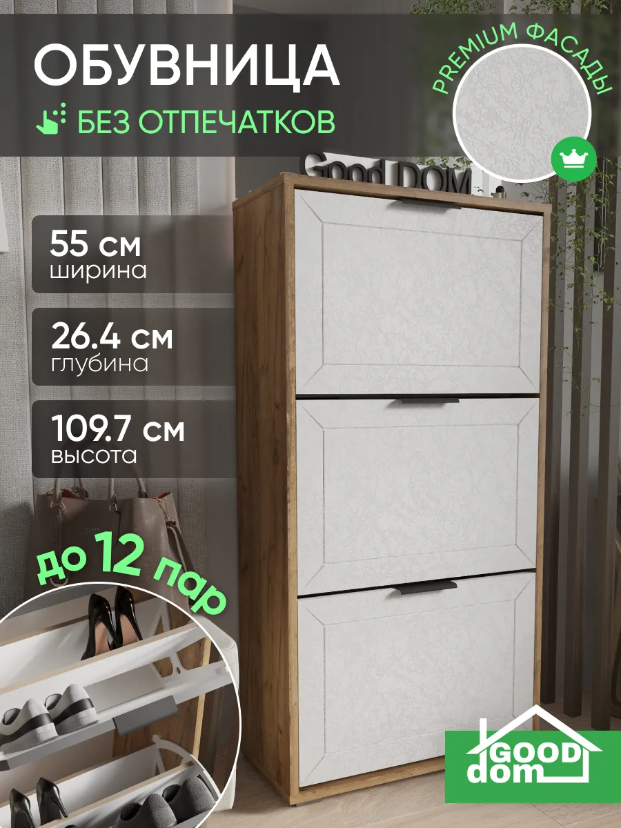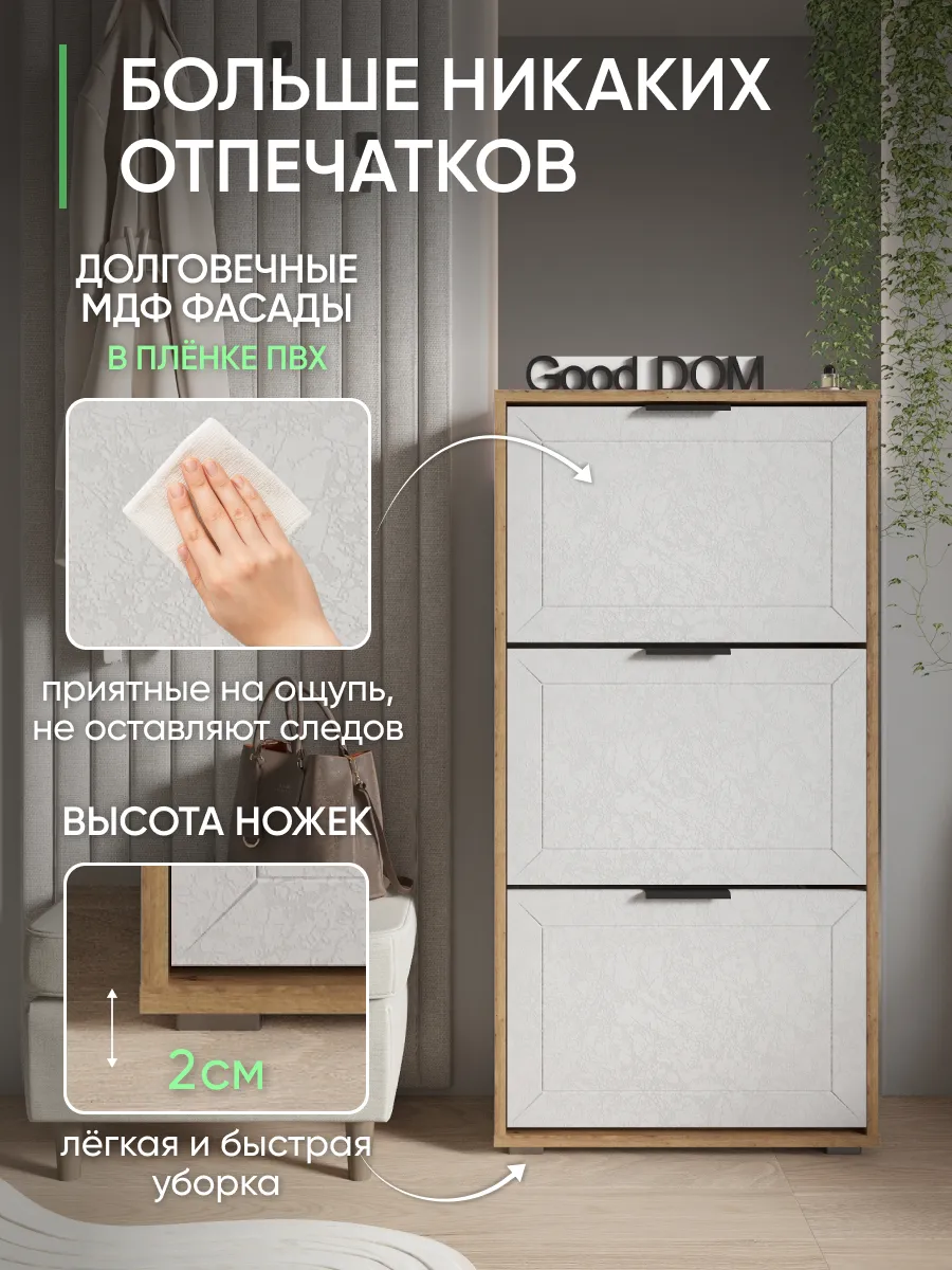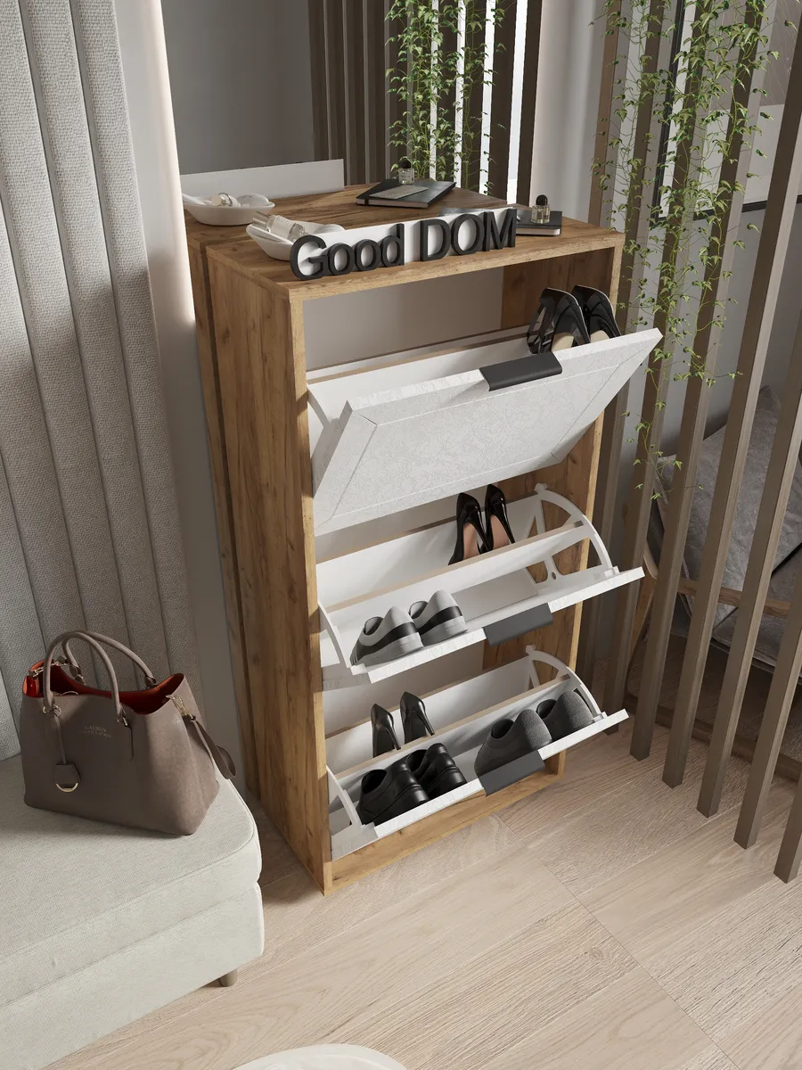Обувница идеально подходит для бережного хранения обуви в различных помещениях — прихожая, коридор, гардероб, кладовая, балкон, кладовка или гардеробный. Это компактный и узкий элемент мебели, благодаря чему ее легко разместить даже в небольшом пространстве. Стильный дизайн хорошо впишется в интерьер дома в современном или лофт стиле. Дверца открывается плавно, что обеспечивает удобный доступ к обуви. Для хранения предусмотрены полки разной высоты — под низкий, высокий, невысокий сапог или для мелочи. Обувной предмет выполнен с приятным, лаконичным фасадом, его можно использовать как этажерка, подставка или стеллаж. Конструкция slim позволяет ставить обувницу вдоль стены, около плинтуса, за задний фрагмент стенки или под зеркало, а также использовать дизайнерский вырез в интерьере прихожей или коридора. Оттенок золотого дуба в сочетании с белыми фасадами обувницы подчеркивает универсальный характер изделия, делая его уместным для гардеробных и кладовых.