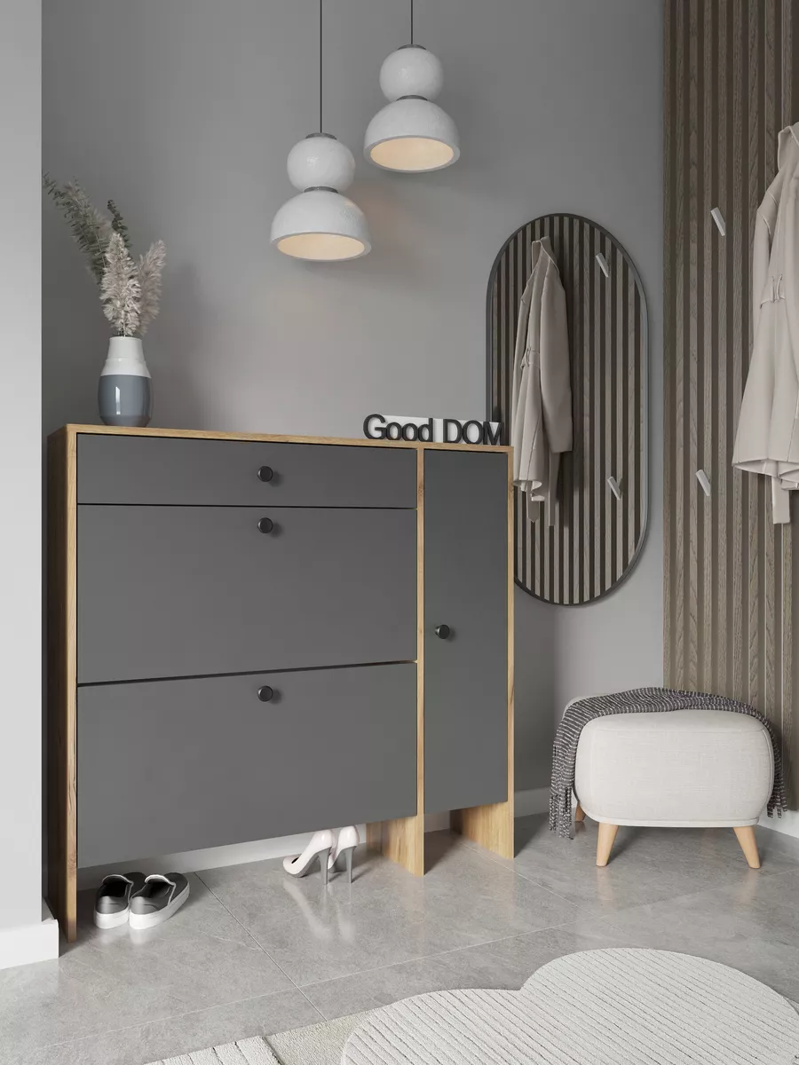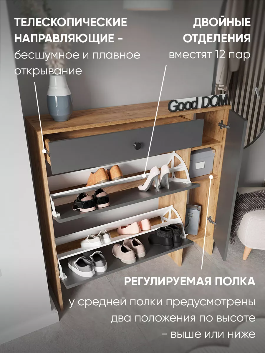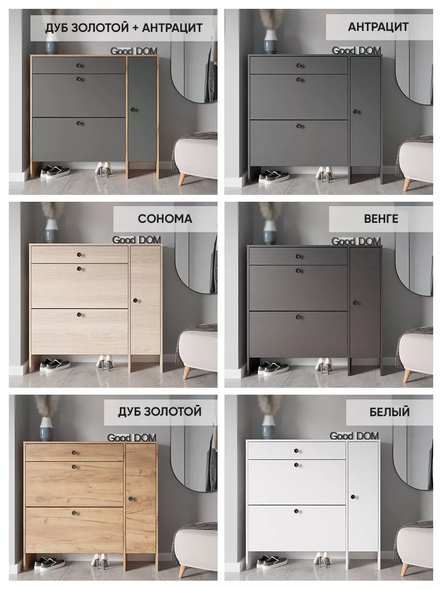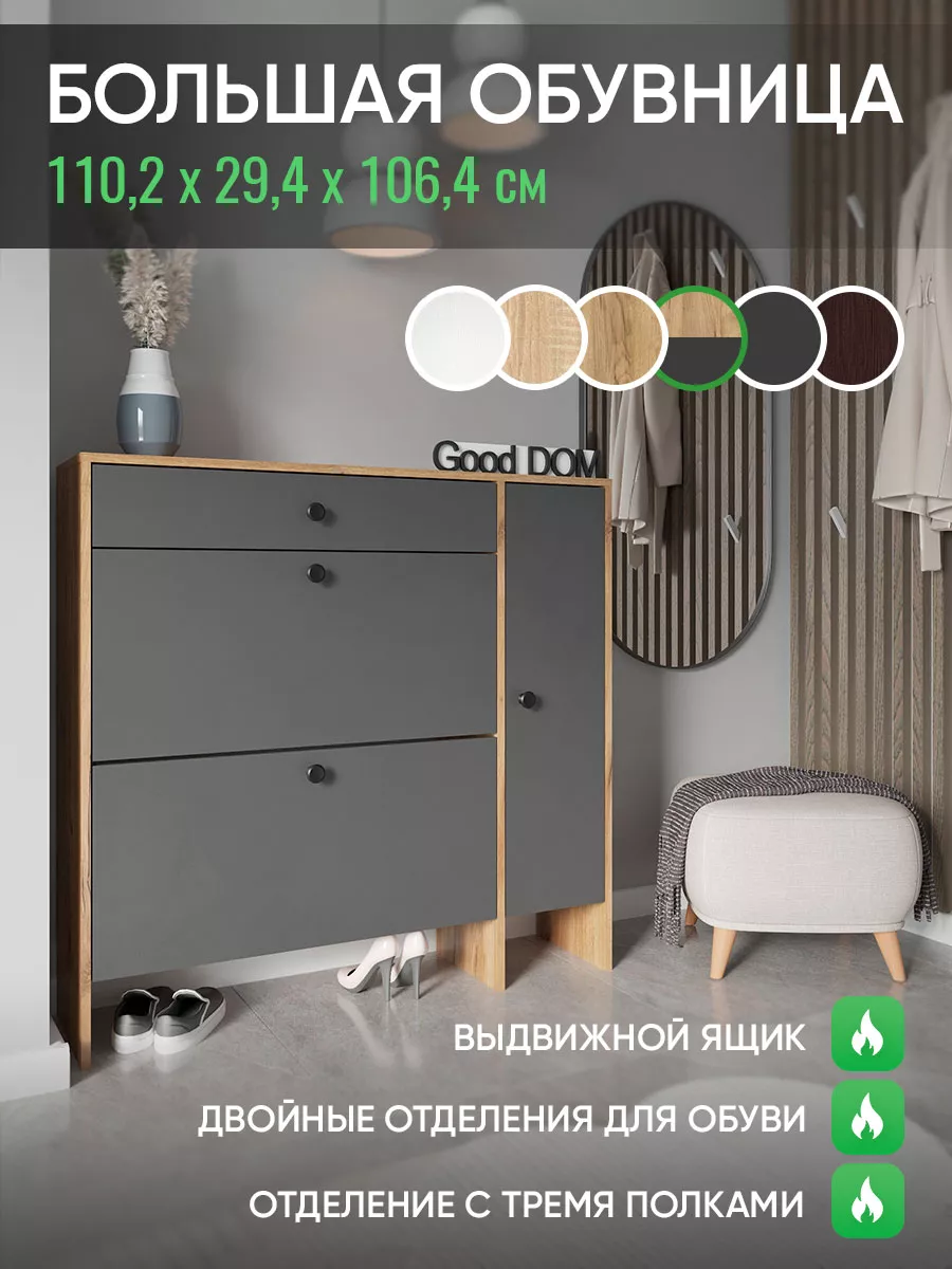 Наша обувница изготовлена на новом оборудовании из высококачественных материалов ЛДСП. Мы дорожим качеством и внешним видом нашей продукции, поэтому вся продукция проверяется перед отправкой отделом контроля и упаковывается в коробки с дополнительной твердой защитой. В нашем ассортименте есть много интересных моделей мебели, что позволяет собрать комплект мебели от бренда Good дом, все в Дом, которая сочетается между собой. Чтобы посмотреть всё - просто нажмите на иконку логотипа.