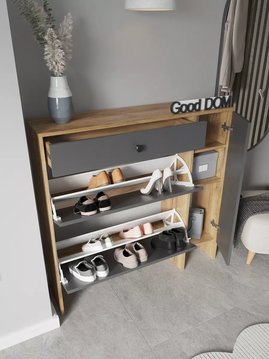 Специально разработанная модель - увеличенная обувница закрытая в прихожую для обуви. Вместительная обувница с выдвижным ящиком, двумя двойными отделениями для обуви и отделением с полками! Положение средней полки в правом отделении регулируемое - можно установить её выше или ниже по вашему желанию. Комод с ящиками отличный способ организовать хранение обуви в вашем доме. Эта обувница также может использоваться не только в прихожей, но и в гостиной или гардеробной.