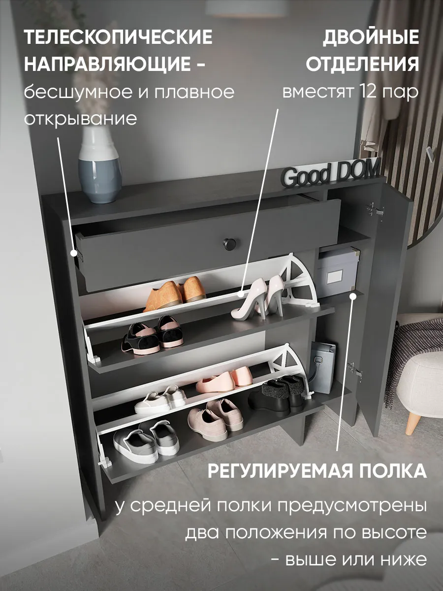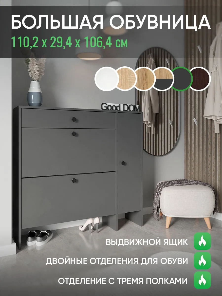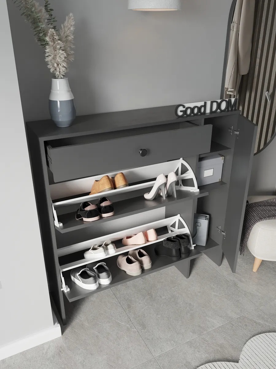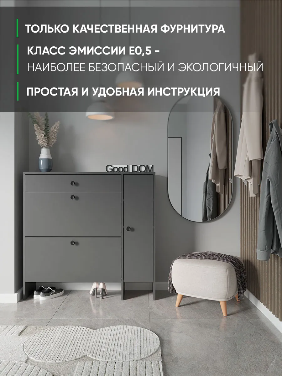 Наша обувница изготовлена на новом оборудовании из высококачественных материалов ЛДСП. Мы дорожим качеством и внешним видом нашей продукции, поэтому вся продукция проверяется перед отправкой отделом контроля и упаковывается в коробки с дополнительной твердой защитой. В нашем ассортименте есть много интересных моделей мебели, что позволяет собрать комплект мебели от бренда Good дом, все в Дом, которая сочетается между собой. Чтобы посмотреть всё - просто нажмите на иконку логотипа.