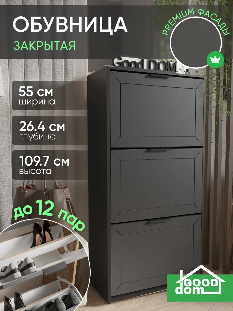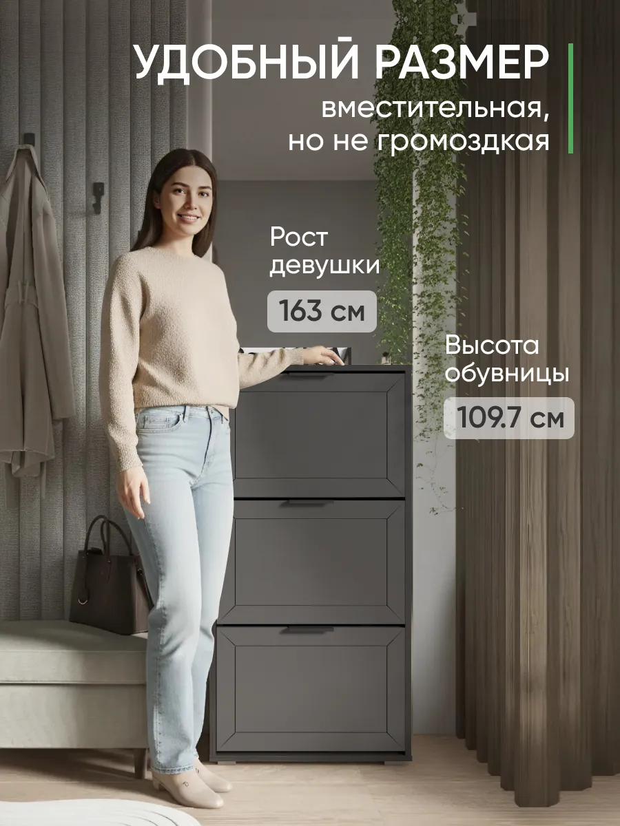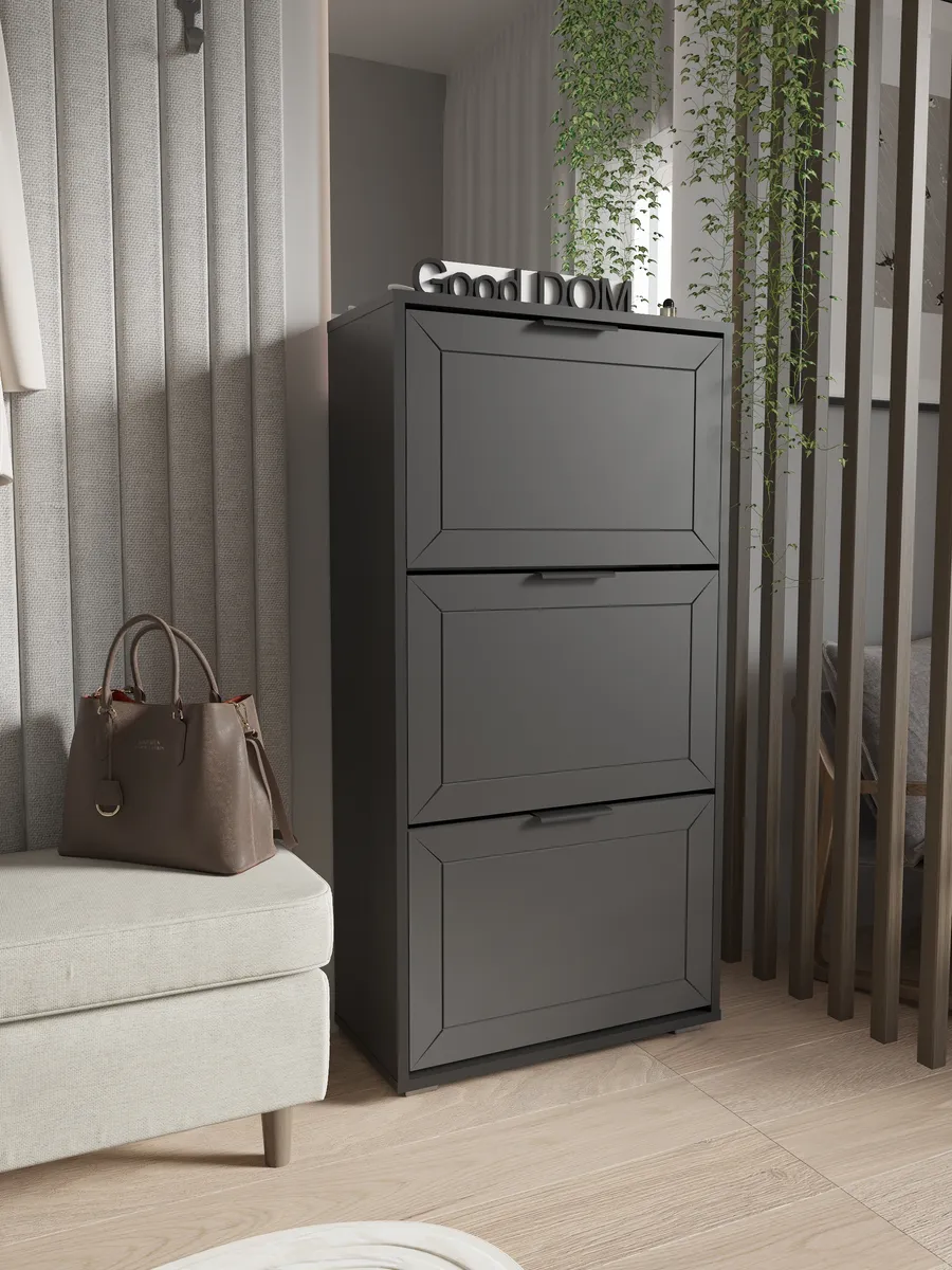 Высокий закрытый стеллаж для обуви станет отличным решением для дома, особенно если важно сохранить порядок в прихожей или на балконе. Этот узкий шкаф выполнен в стильном сером графитовом цвете, который прекрасно впишется в интерьер в стиле лофт. Благодаря продуманной конструкции с дверцей и несколькими полками, он подходит для хранения как сапог, так и другой обуви, экономя полезное пространство благодаря своей оптимальной ширине.