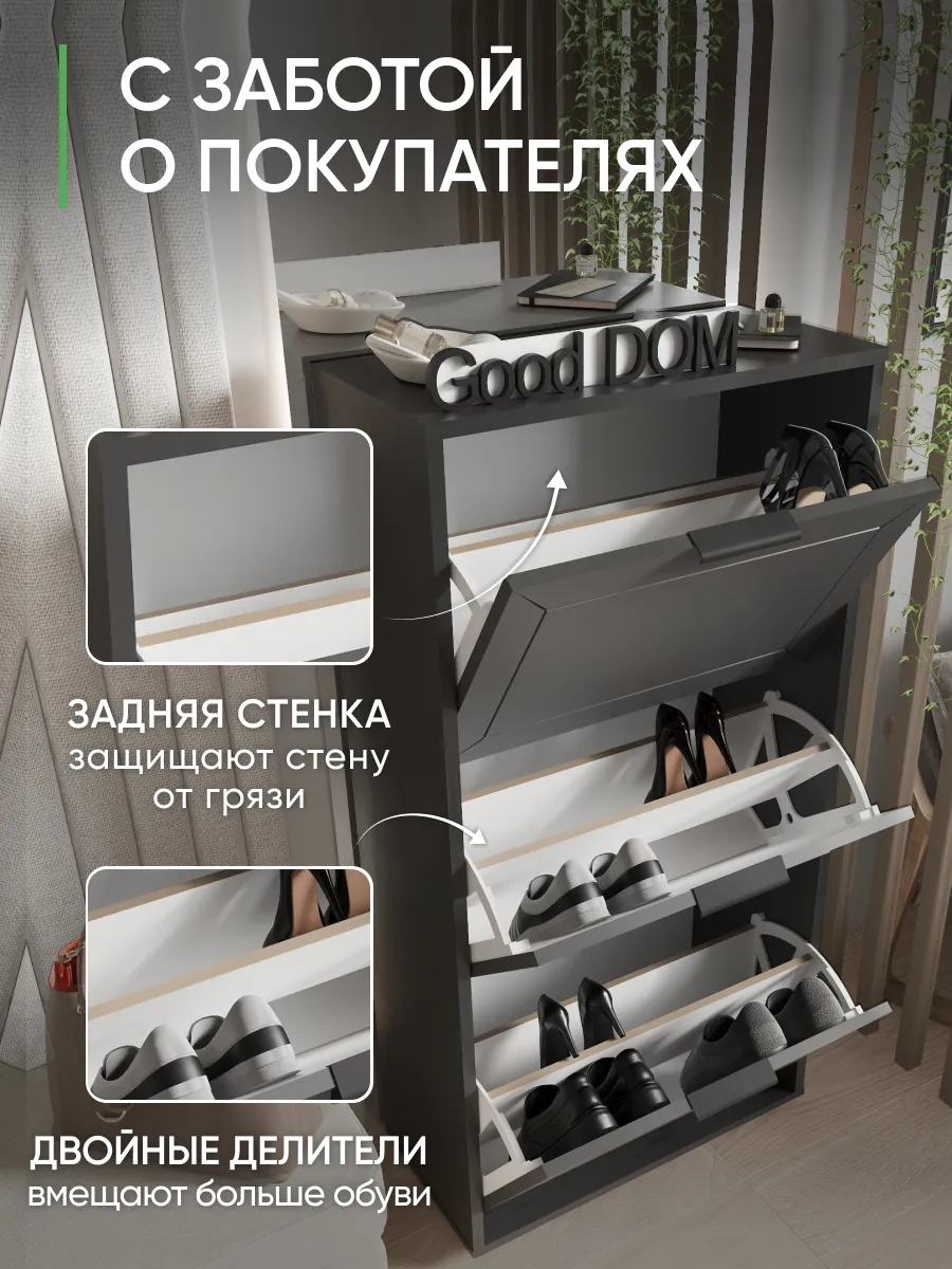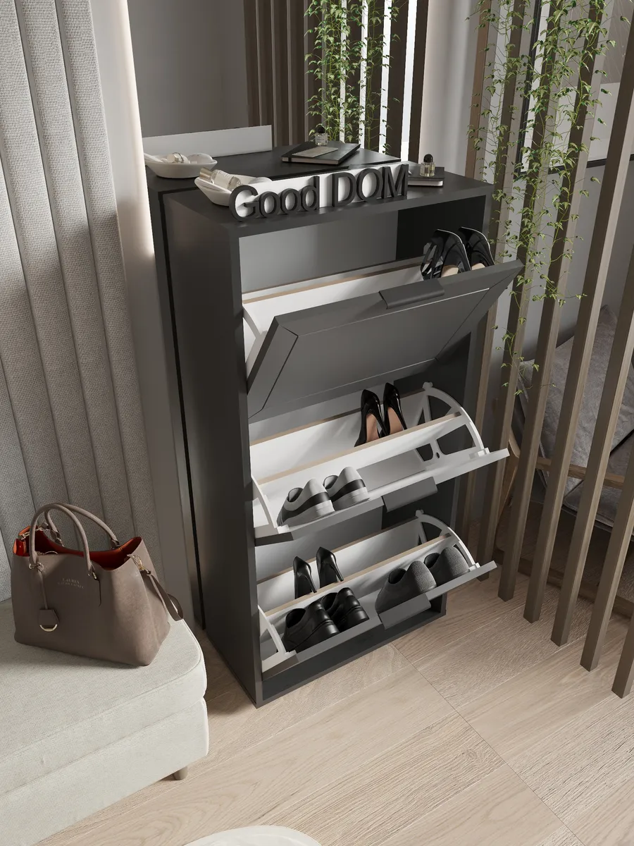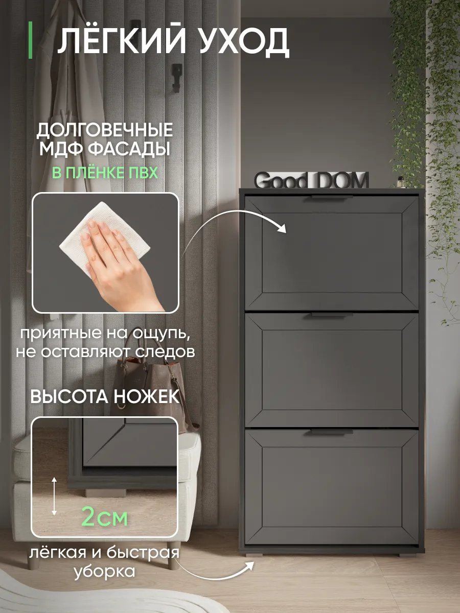 Высокий закрытый стеллаж для обуви станет отличным решением для дома, особенно если важно сохранить порядок в прихожей или на балконе. Этот узкий шкаф выполнен в стильном сером графитовом цвете, который прекрасно впишется в интерьер в стиле лофт. Благодаря продуманной конструкции с дверцей и несколькими полками, он подходит для хранения как сапог, так и другой обуви, экономя полезное пространство благодаря своей оптимальной ширине.