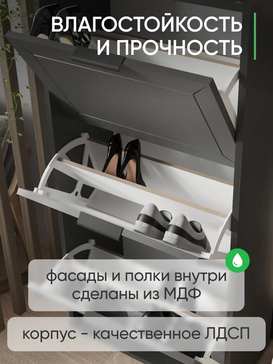 Этот узкий стеллаж обладает прочной конструкцией, рассчитанной на длительное использование. Полки внутри выдерживают обувь разного типа и размера, включая сапоги и кроссовки.