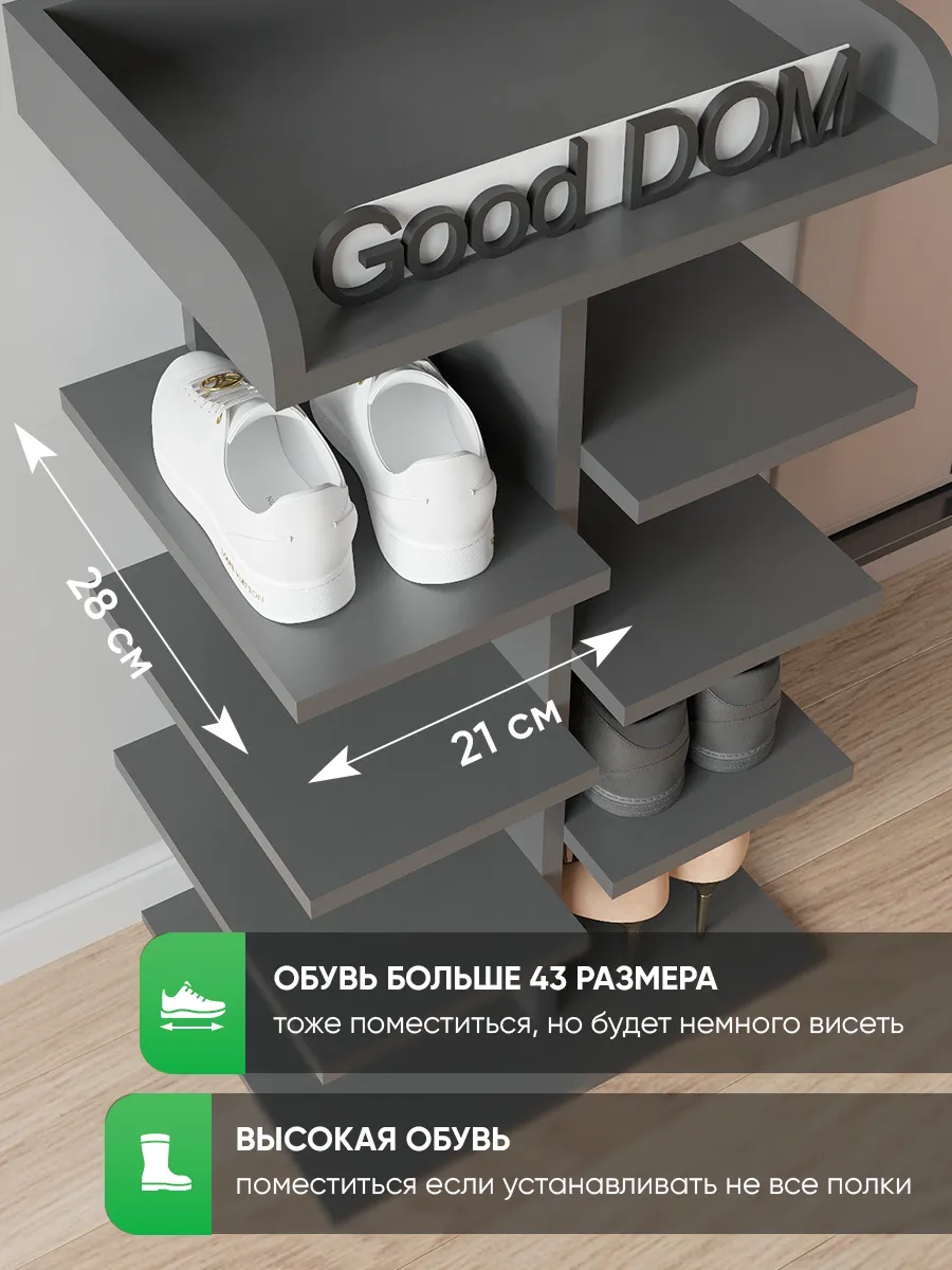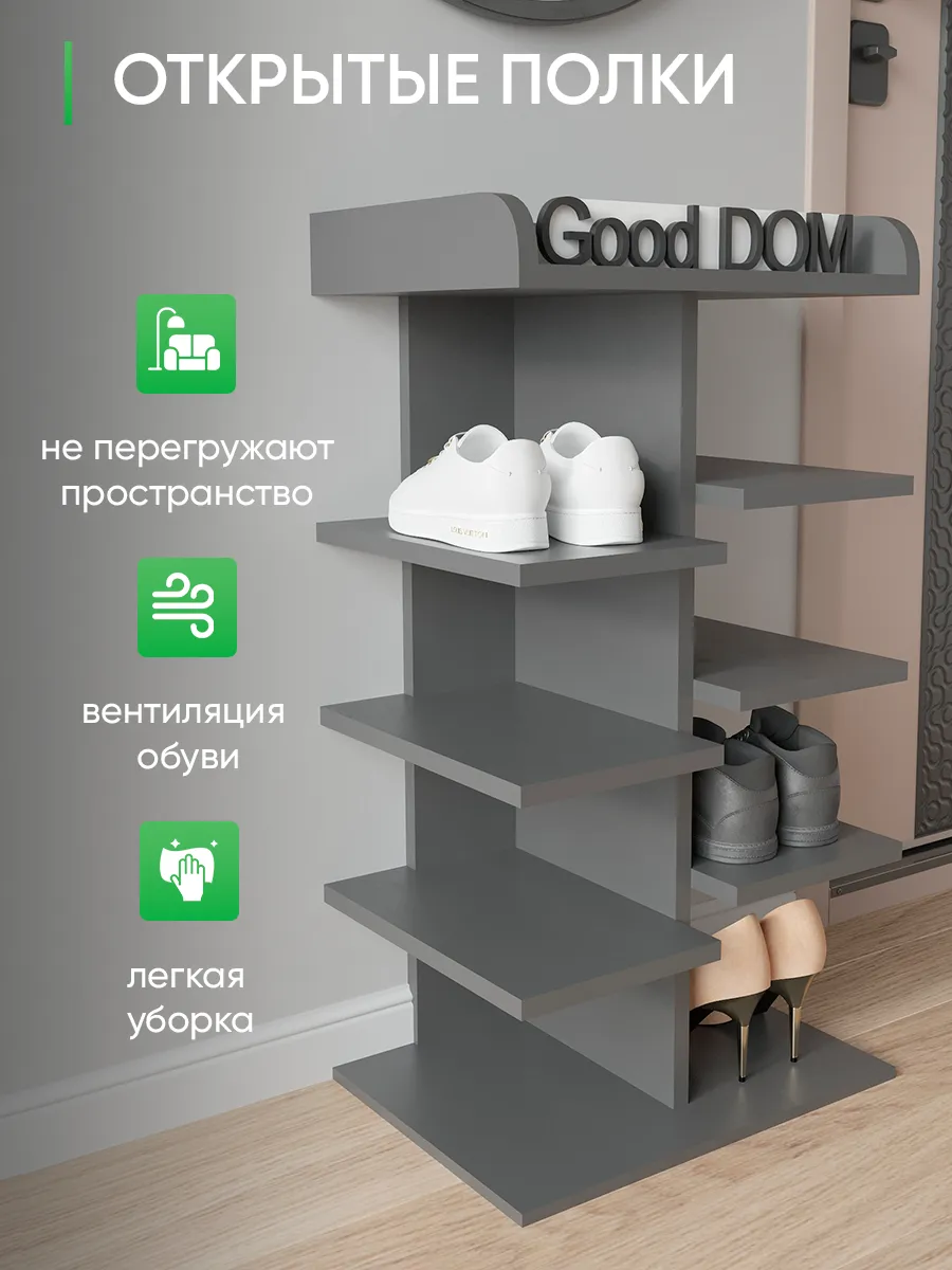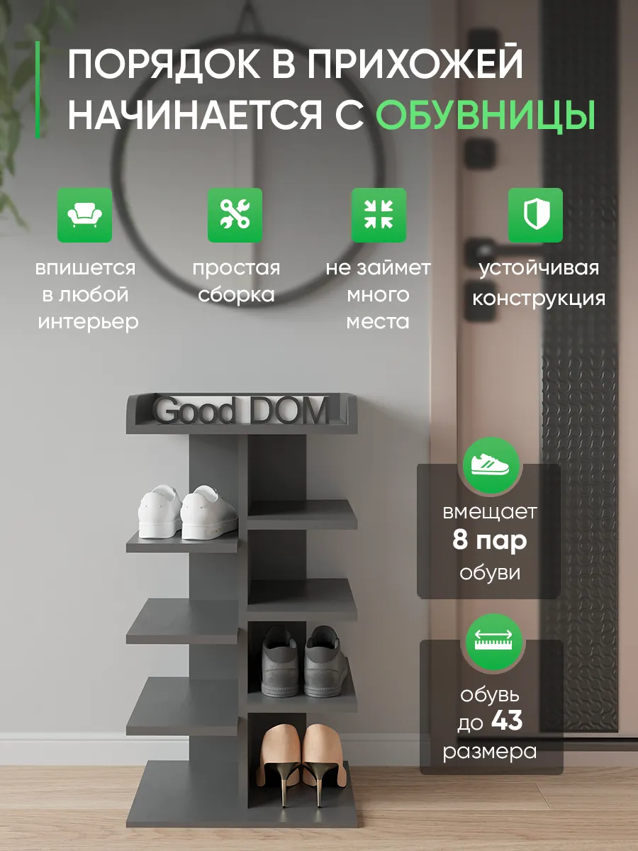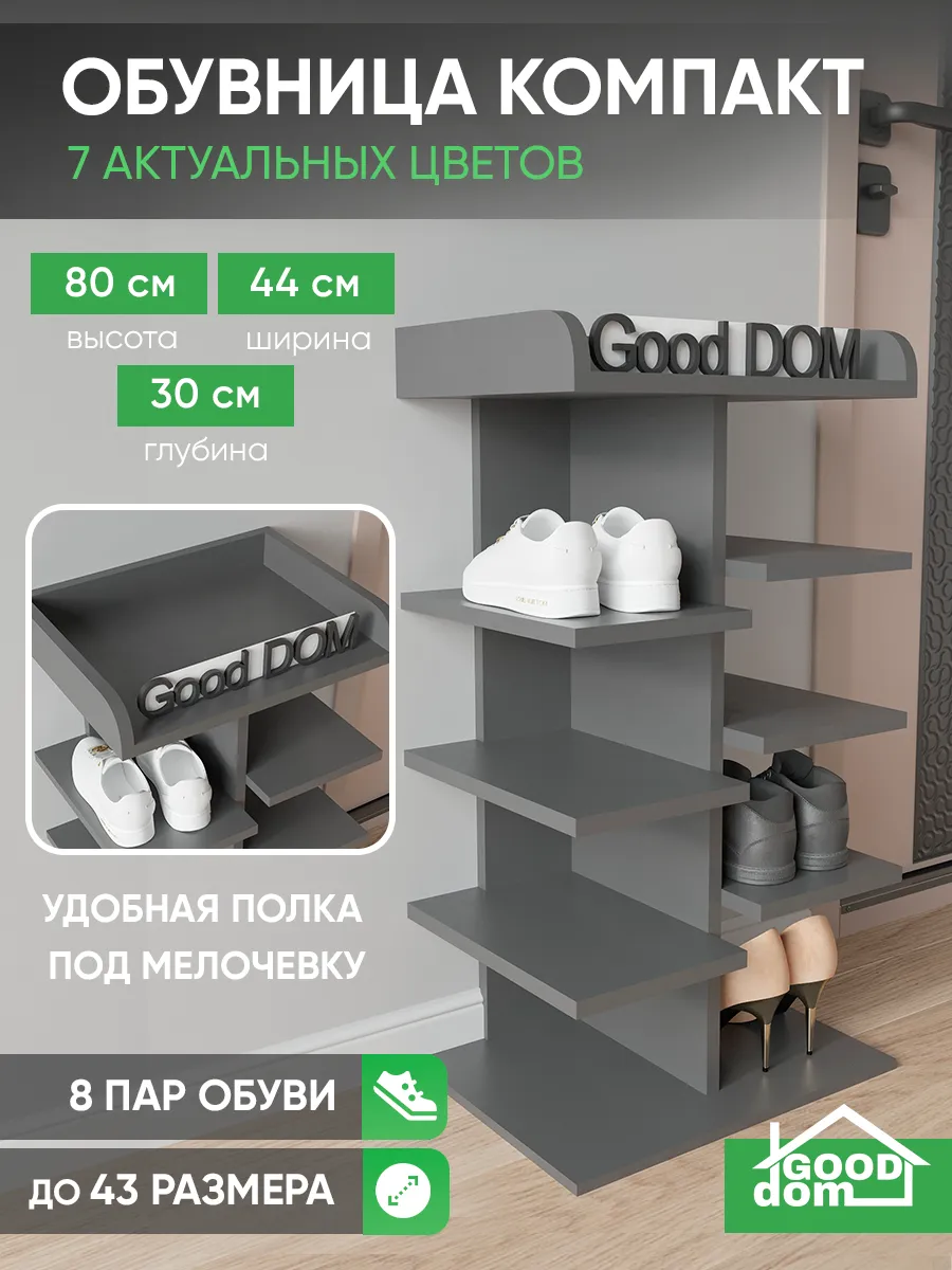 Обувница в прихожую «Компактная» – полка для обуви открытая. Прихожая мебель для функционального и удобного хранения обуви и вещей в коридоре. Тумба для обуви с полками отличный вариант для маленьких квартир – обувница узкая (подойдёт даже для небольшой прихожей), но при этом очень вместительная. Сверху у обувной полки есть открытая верхняя полка под документы, мелочевку, можно использовать её как поставку для под сумок. Наша этажерка для обуви вместимостью 8 пар обуви до 43 размера! Полка для обуви создает лучшие условия для хранения обуви – обувница открытая поможет всегда быстро взять и убрать необходимую обувь с этажерки. К тому же в галошнице обувь постоянно проветривается, а значит быстрее сохнет, что сводит к минимуму возникновение в обуви неприятного запаха. Доступные цвета подставки для обуви: белая, дуб сонома, дуб атланта, орех, дуб золотой, антрацит, дуб катания. Благодаря разнообразию цветов, вы легко подберете обувницу для обуви, подходящую к вашему интерьеру коридора, прихожей, гардеробной. Полка для обуви деревянная из ЛДСП эффектная мебель для прихожей, в отличии от дешевых пластиковых аналогов. Полки для обуви в прихожую в стиле мебель для прихожей. Также обувницу используют как стеллаж для хранения других вещей в гостиной. Полочка для обуви отлично впишется и как мебель на балкон. Размеры для обуви полки: Размеры: 80*44*30 см (глубина полки 28,4 см без задней планки), толщина полок: 1,6 см, вместимость: до 8 пар обуви. Этажерка в бОльшем размере Арт: 39429155.В нашем ассортименте представлена другая мебель для прихожей (и не только) – вы можете легко посмотреть весь ассортимент, щелкнув на значок логотипа. Мы постоянно работаем над качеством нашей продукции, поэтому улучшили упаковку - наша УСИЛЕННАЯ УПАКОВКА ЗАЩИТИТ Вашу Обувницу при доставке ОТ СЛОМАННЫХ УГЛОВ и СКОЛОВ! Выбирая продукцию отечественного производителя Good Дом, все в Дом Вы обеспечиваете себя гарантией на продукцию сроком в 1 год, Вы выбираете качество и комфорт.