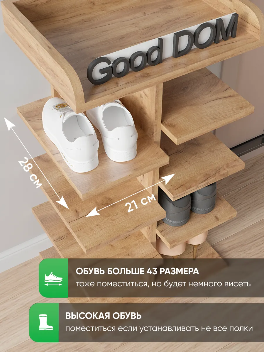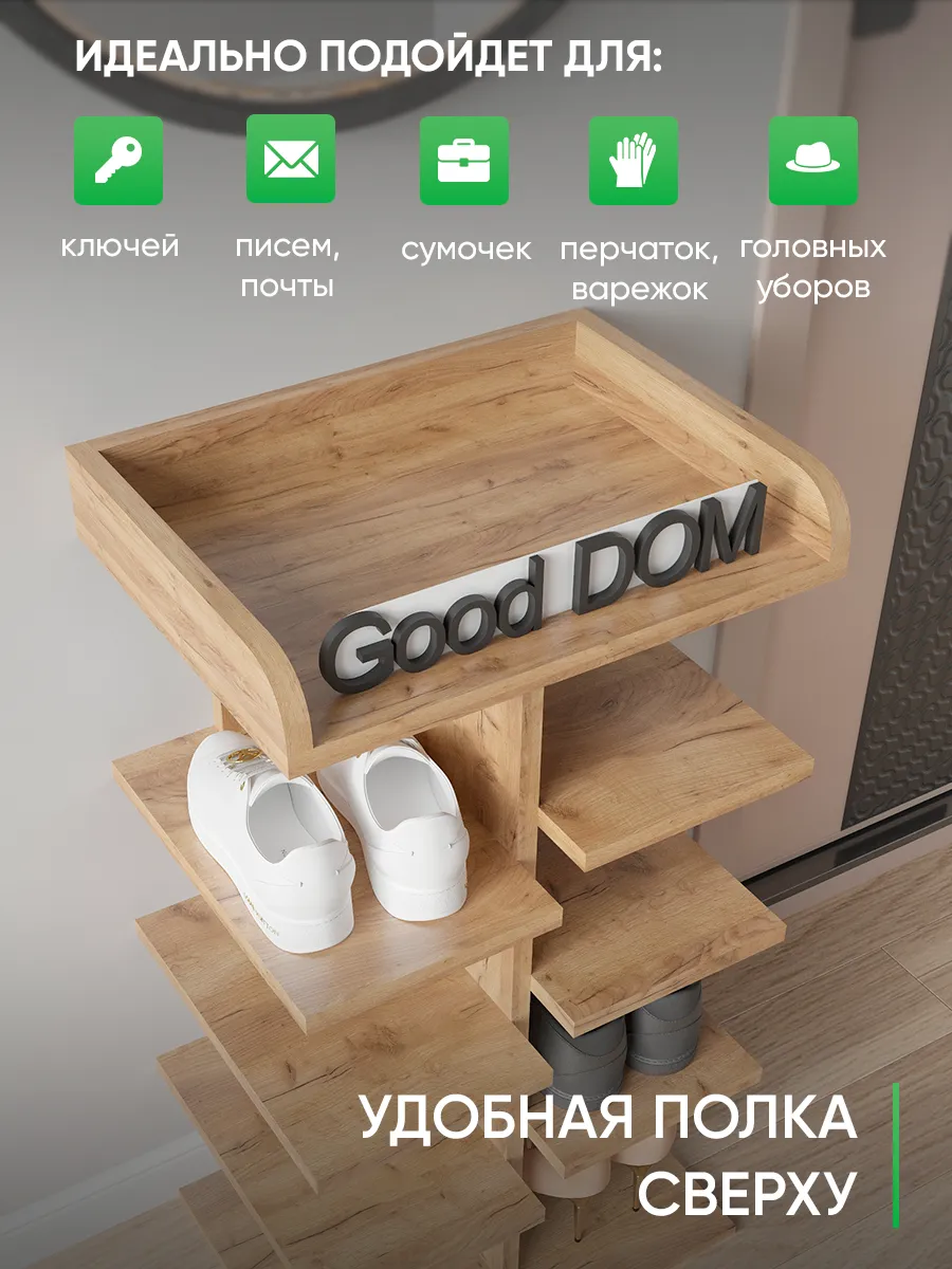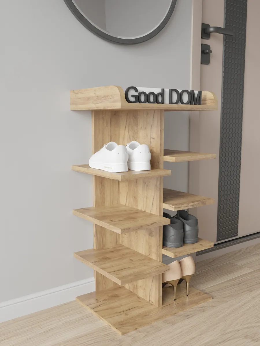 Обувница в прихожую «Компактная» – полка для обуви открытая. Прихожая мебель для функционального и удобного хранения обуви и вещей в коридоре. Тумба для обуви с полками отличный вариант для маленьких квартир – обувница узкая (подойдёт даже для небольшой прихожей), но при этом очень вместительная. Сверху у обувной полки есть открытая верхняя полка под документы, мелочевку, можно использовать её как поставку для под сумок. Наша этажерка для обуви вместимостью 8 пар обуви до 43 размера! Полка для обуви создает лучшие условия для хранения обуви – обувница открытая поможет всегда быстро взять и убрать необходимую обувь с этажерки. К тому же в галошнице обувь постоянно проветривается, а значит быстрее сохнет, что сводит к минимуму возникновение в обуви неприятного запаха. Доступные цвета подставки для обуви: белая, дуб сонома, дуб атланта, орех, дуб золотой, антрацит, дуб катания. Благодаря разнообразию цветов, вы легко подберете обувницу для обуви, подходящую к вашему интерьеру коридора, прихожей, гардеробной. Полка для обуви деревянная из ЛДСП эффектная мебель для прихожей, в отличии от дешевых пластиковых аналогов. Полки для обуви в прихожую в стиле мебель для прихожей. Также обувницу используют как стеллаж для хранения других вещей в гостиной. Полочка для обуви отлично впишется и как мебель на балкон. Размеры для обуви полки: Размеры: 80*44*30 см (глубина полки 28,4 см без задней планки), толщина полок: 1,6 см, вместимость: до 8 пар обуви. Этажерка в бОльшем размере Арт: 39429155.В нашем ассортименте представлена другая мебель для прихожей (и не только) – вы можете легко посмотреть весь ассортимент, щелкнув на значок логотипа. Мы постоянно работаем над качеством нашей продукции, поэтому улучшили упаковку - наша УСИЛЕННАЯ УПАКОВКА ЗАЩИТИТ Вашу Обувницу при доставке ОТ СЛОМАННЫХ УГЛОВ и СКОЛОВ! Выбирая продукцию отечественного производителя Good Дом, все в Дом Вы обеспечиваете себя гарантией на продукцию сроком в 1 год, Вы выбираете качество и комфорт.
