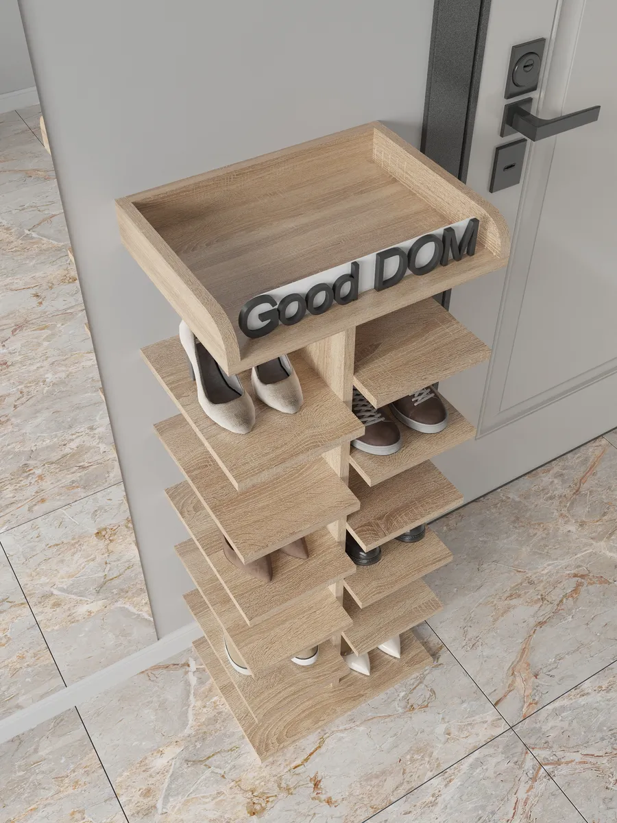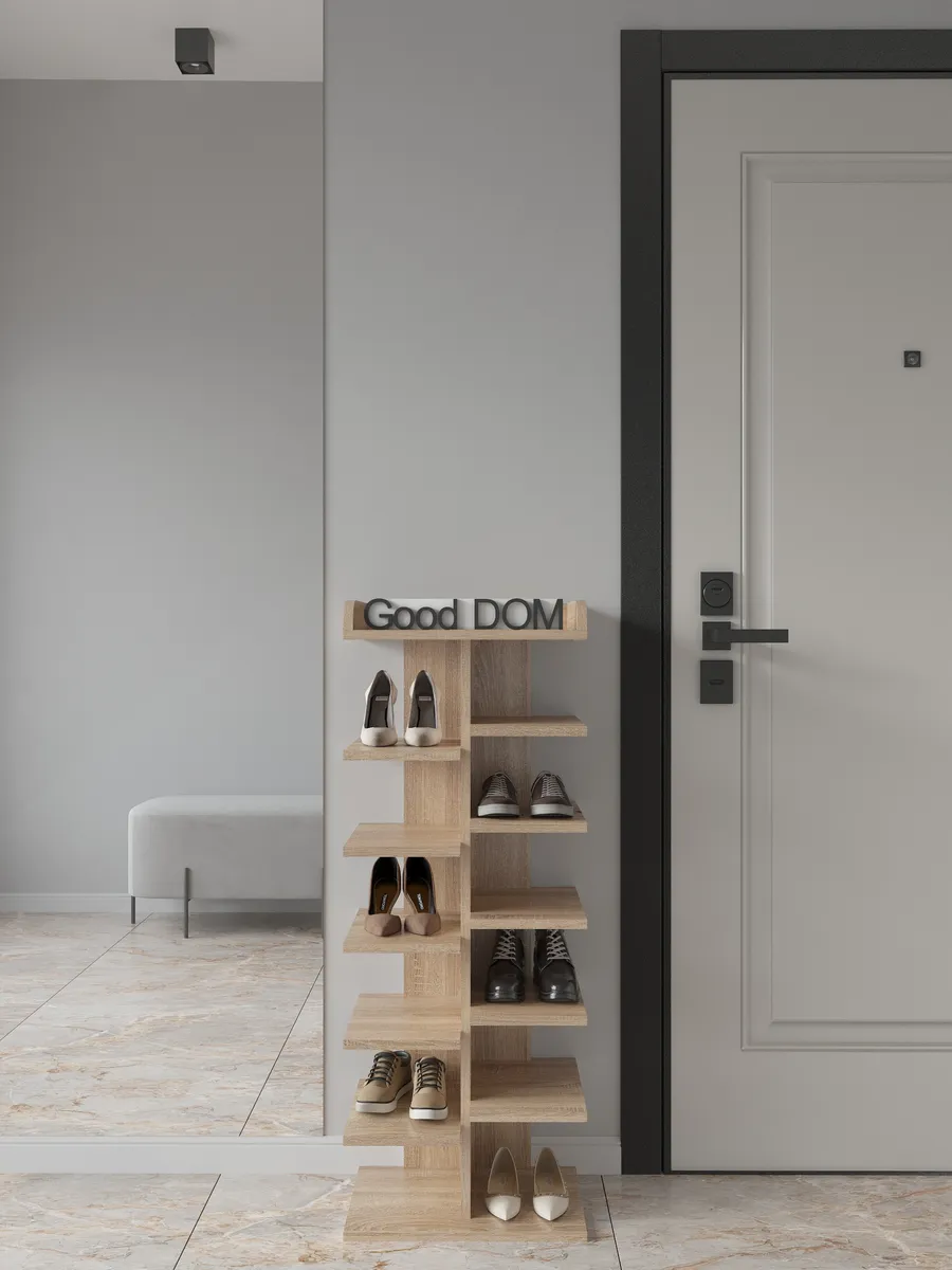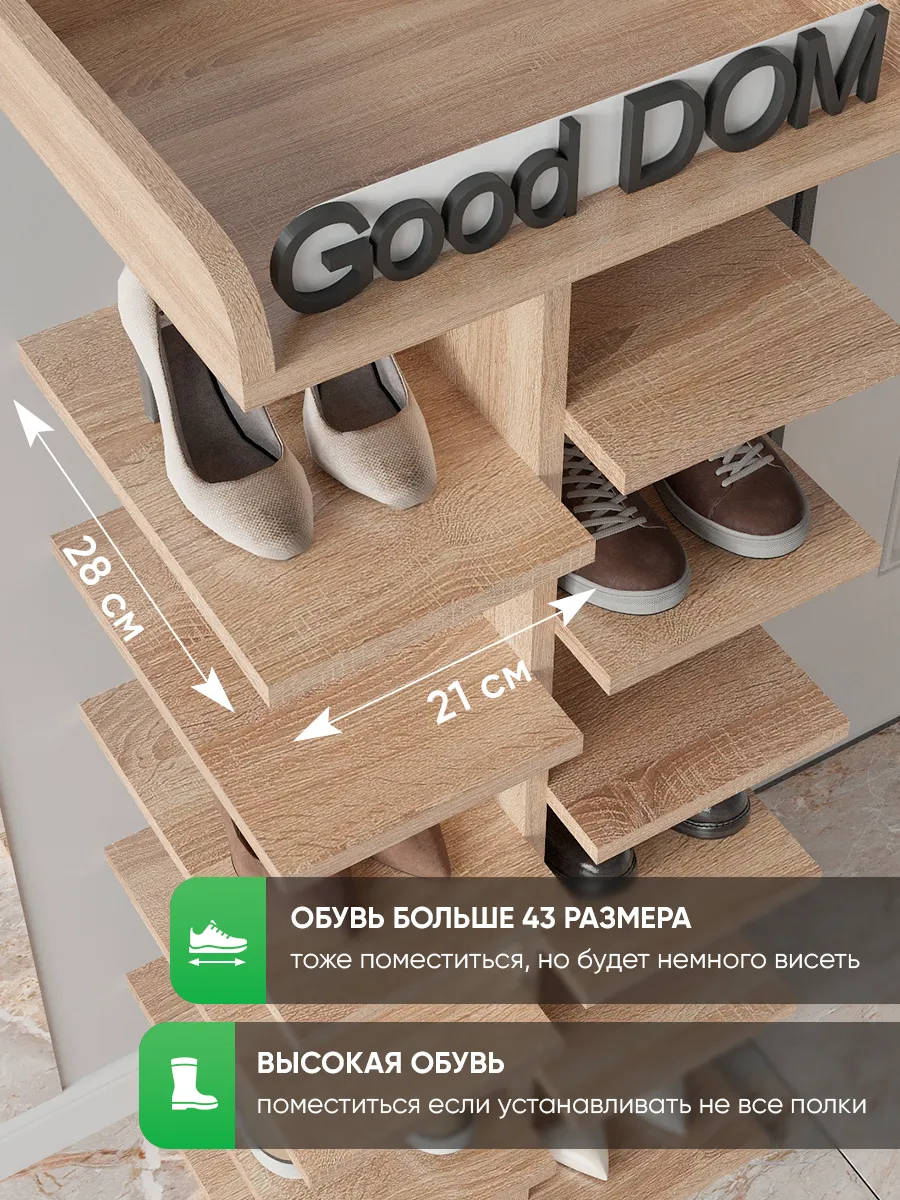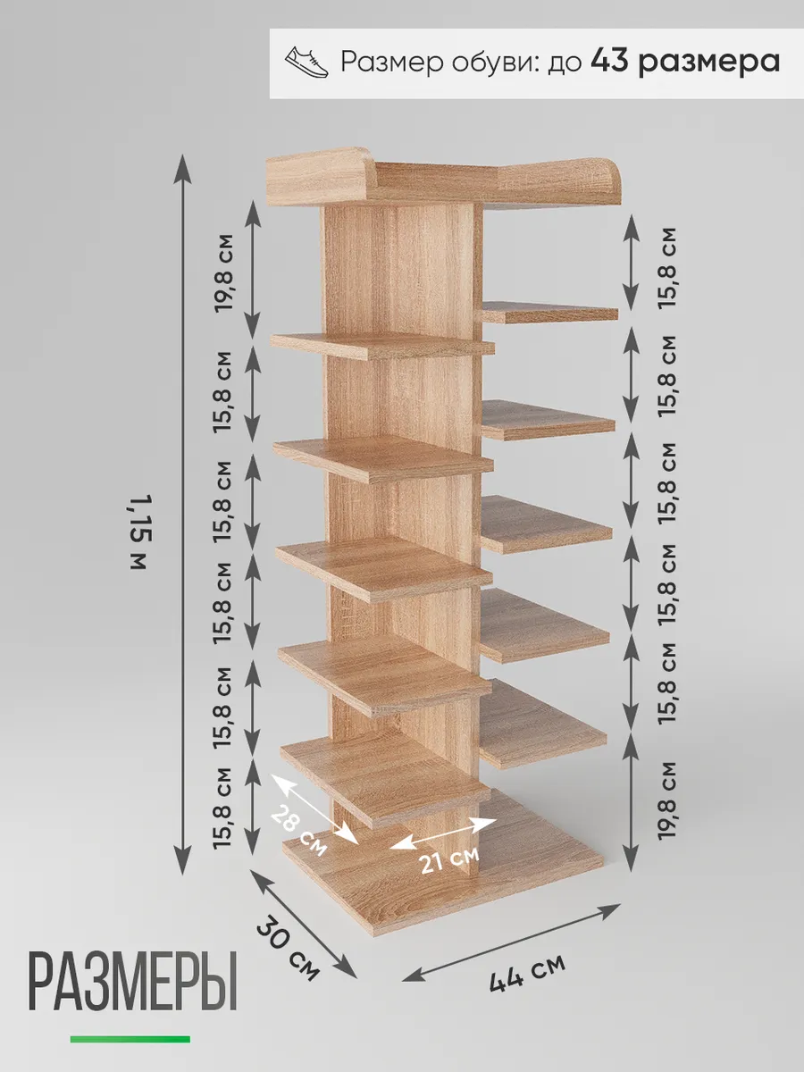 Обувница «Стойка» от бренда «Good дом, все в Дом» станет стильным решением для организации системы эстетичного хранения модных туфелек и не только! Высокая и узкая этажерка - отличный способ экономить пространство в небольшом коридоре или прихожей, держать обувь организованно и не на полу. Открытое хранилище позволит быстро находить нужную пару. Эстетичная стойка компактного размера (высота 115 см, ширина 44 см, глубина 30 см (глубина полки 28,4 см без задней планки) вмещает обувь до 43-го размера, состоит из 12 квадратных полок + 1 верхняя длинная в прямоугольной форме. Верх изделия представляет собой открытую полочку, на которой можно разместить средства по уходу за обувью, головные уборы, зонтики, документы и разные мелочи, а можно заполнить свободное пространство горшками с живыми или искусственными растениями, украсить статуэтками или фотографиями в рамочках. Также верх домашней этажерки можно использовать в качестве удобной поверхности, куда, возвращаясь домой, можно ставить сумки и класть ключи. Красивое многоярусное изделие выполнено из прочного материала - ЛДСП высокого качества (класс эмиссии Е 0.5), представлено в восьми расцветках: венге, дуб золотой, антрацит, дуб катания, дуб атланта, орех, дуб сонома и матовом белом цвете. Популярная палитра позволит подобрать компактную вертикальную стойку для любого дизайна интерьера дома или квартиры. Открытая мебельная подставка для обуви и инвентаря заменит хранение в закрытом шкафу, комоде или тумбочке, дополнит комнатную банкетку с сидением. Многофункциональная модульная мебель будет оптимально сочетаться с другими изделиями бренда. Многоуровневую обувницу можно использовать в прихожей или коридоре, а можно разместить в спальне или детской комнате для хранения одежды, детских игрушек, маленьких органайзеров с вещами, в гардеробной, в дачном или офисном помещении, на балконе или лоджии около стенки, в раздевалке. Вместительный каркасный стеллаж - галошница с 13 отделениями (секциями) станет стильным интерьерным элементом и хорошим подарком для взрослых друзей, для семьи с детьми, для лучшего друга или подруги, мамы и папы, бабушки и дедушки на новоселье! Универсальное изделие требует сборки, все детали пронумерованы, чтобы вы могли быстро собрать модель по инструкции (качественная фурнитура и схема сборки в комплекте). Мебель изготавливается на высокотехнологичном производстве (ЧПУ - станки), служба поддержки отвечает быстро, сломанные в процессе транспортировки и поставки детали заменяются, недостающие элементы досылаются, вопросы по сборке быстро решаются. Обувница доставляется в усиленной упаковке, обвязанной пластиковой лентой и оклеенной предупреждающими стикерами. Коробка из трехслойного картона усилена пенопластом по всему периметру, чтобы все детали приехали к потребителю целыми и невредимыми. У нас есть акции и распродажи, вы можете купить наши товары в подарок со скидкой!