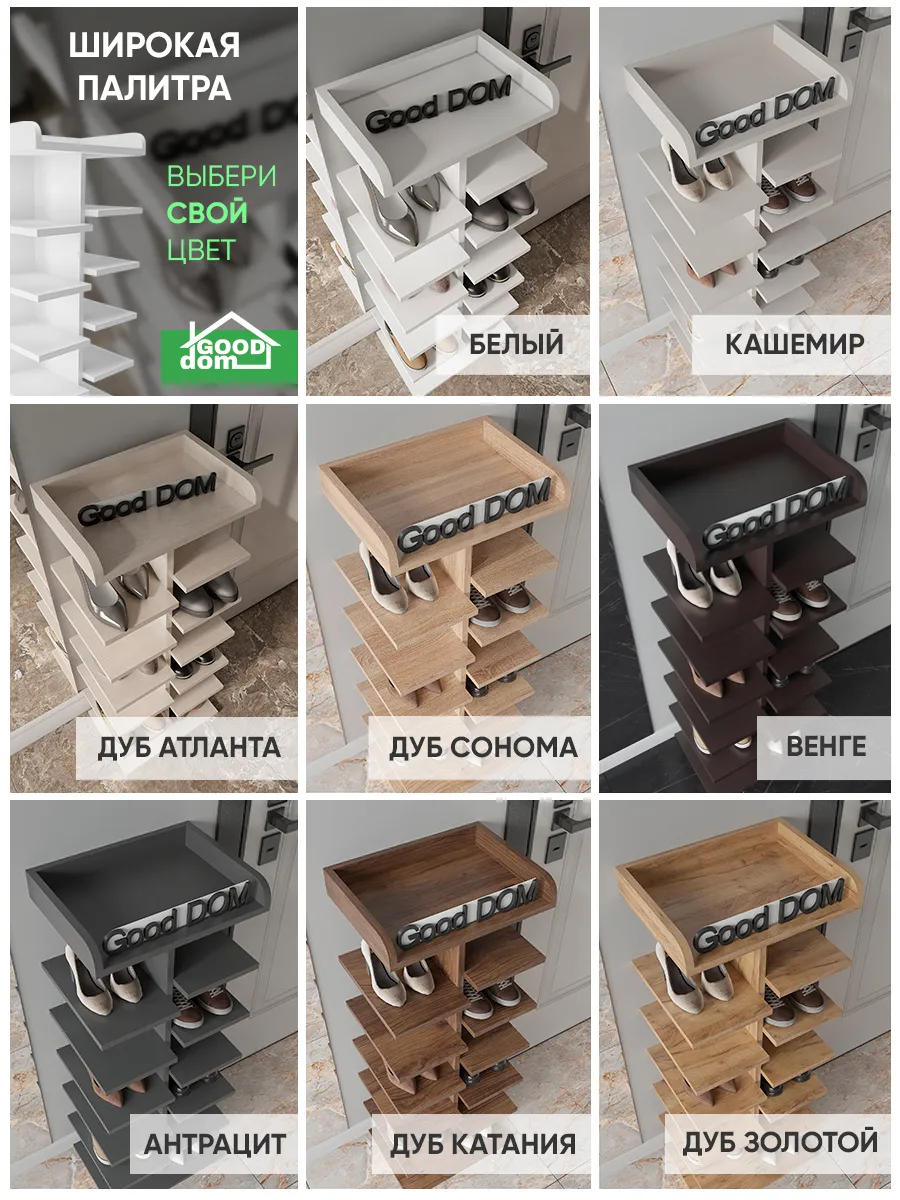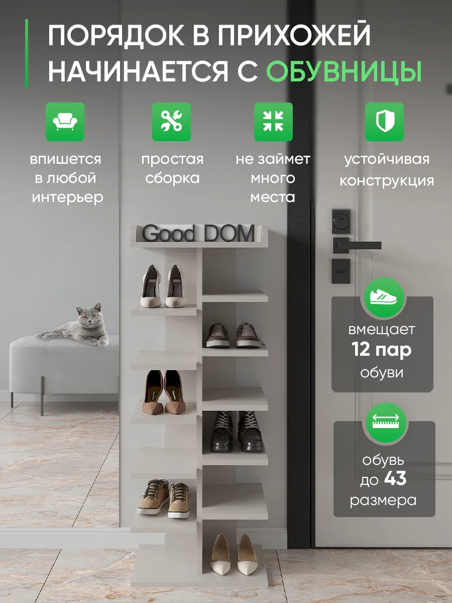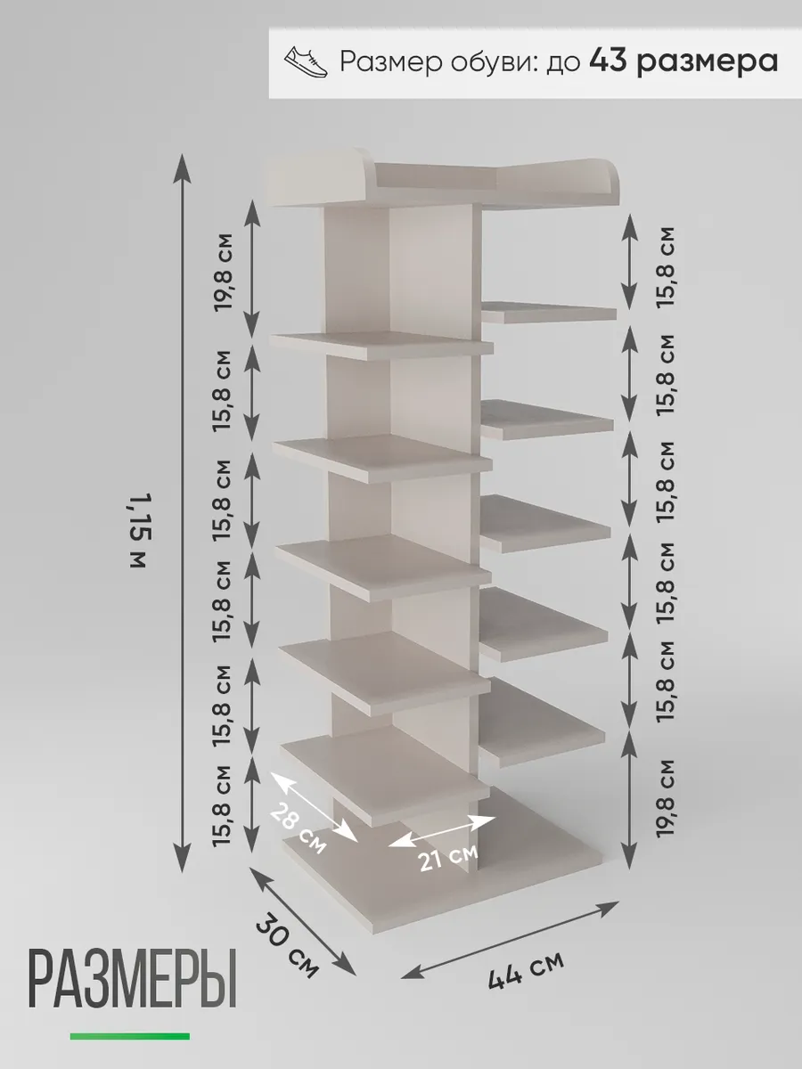 Обувница «Стойка» от бренда «Good дом, все в Дом» станет стильным решением для организации системы эстетичного хранения модных туфелек и не только! Высокая и узкая этажерка - отличный способ экономить пространство в небольшом коридоре или прихожей, держать обувь организованно и не на полу. Открытое хранилище позволит быстро находить нужную пару. Эстетичная стойка компактного размера (высота 115 см, ширина 44 см, глубина 30 см (глубина полки 28,4 см без задней планки) вмещает обувь до 43-го размера, состоит из 12 квадратных полок + 1 верхняя длинная в прямоугольной форме. Верх изделия представляет собой открытую полочку, на которой можно разместить средства по уходу за обувью, головные уборы, зонтики, документы и разные мелочи, а можно заполнить свободное пространство горшками с живыми или искусственными растениями, украсить статуэтками или фотографиями в рамочках. Также верх домашней этажерки можно использовать в качестве удобной поверхности, куда, возвращаясь домой, можно ставить сумки и класть ключи. Красивое многоярусное изделие выполнено из прочного материала - ЛДСП высокого качества (класс эмиссии Е 0.5), представлено в восьми расцветках: венге, дуб золотой, антрацит, дуб катания, дуб атланта, орех, дуб сонома и матовом белом цвете. Популярная палитра позволит подобрать компактную вертикальную стойку для любого дизайна интерьера дома или квартиры. Открытая мебельная подставка для обуви и инвентаря заменит хранение в закрытом шкафу, комоде или тумбочке, дополнит комнатную банкетку с сидением. Многофункциональная модульная мебель будет оптимально сочетаться с другими изделиями бренда. Многоуровневую обувницу можно использовать в прихожей или коридоре, а можно разместить в спальне или детской комнате для хранения одежды, детских игрушек, маленьких органайзеров с вещами, в гардеробной, в дачном или офисном помещении, на балконе или лоджии около стенки, в раздевалке. Вместительный каркасный стеллаж - галошница с 13 отделениями (секциями) станет стильным интерьерным элементом и хорошим подарком для взрослых друзей, для семьи с детьми, для лучшего друга или подруги, мамы и папы, бабушки и дедушки на новоселье! Универсальное изделие требует сборки, все детали пронумерованы, чтобы вы могли быстро собрать модель по инструкции (качественная фурнитура и схема сборки в комплекте). Мебель изготавливается на высокотехнологичном производстве (ЧПУ - станки), служба поддержки отвечает быстро, сломанные в процессе транспортировки и поставки детали заменяются, недостающие элементы досылаются, вопросы по сборке быстро решаются. Обувница доставляется в усиленной упаковке, обвязанной пластиковой лентой и оклеенной предупреждающими стикерами. Коробка из трехслойного картона усилена пенопластом по всему периметру, чтобы все детали приехали к потребителю целыми и невредимыми. У нас есть акции и распродажи, вы можете купить наши товары в подарок со скидкой!