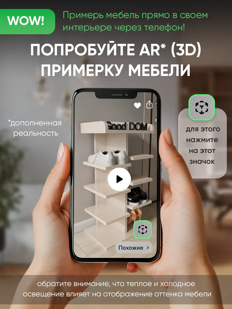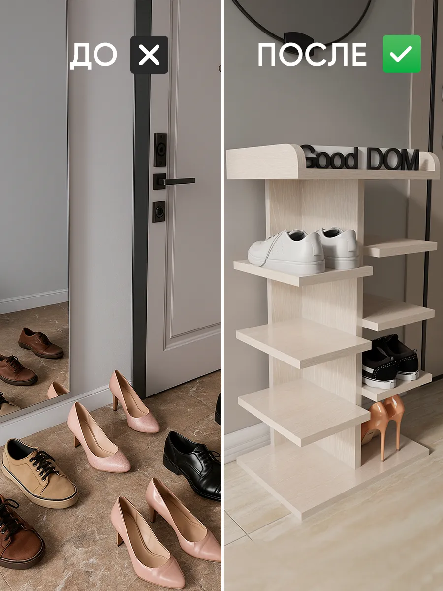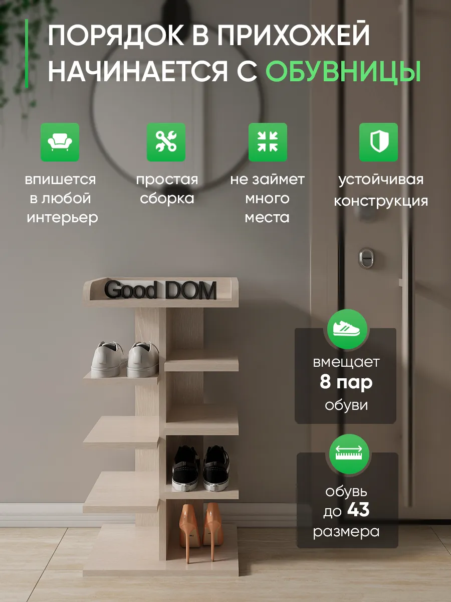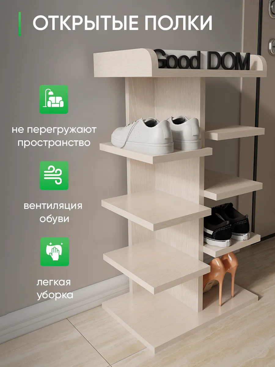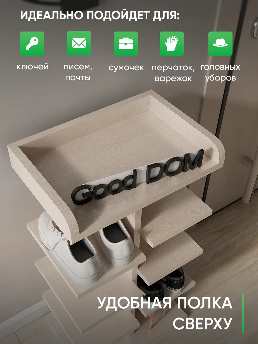 Обувница в прихожую «Компактная» – полка для обуви открытая. Прихожая мебель для функционального и удобного хранения обуви и вещей в коридоре. Тумба для обуви с полками отличный вариант для маленьких квартир – обувница узкая (подойдёт даже для небольшой прихожей), но при этом очень вместительная. Сверху у обувной полки есть открытая верхняя полка под документы, мелочевку, можно использовать её как поставку для сумок. Наша этажерка для обуви вместимостью 8 пар обуви до 43 размера! Полка для обуви создает лучшие условия для хранения обуви – обувница открытая поможет всегда быстро взять и убрать необходимую обувь с этажерки. К тому же в галошнице обувь постоянно проветривается, а значит быстрее сохнет, что сводит к минимуму возникновение в обуви неприятного запаха. Благодаря разнообразию цветов, вы легко подберете обувницу для обуви, подходящую к вашему интерьеру коридора, прихожей, гардеробной. Полка для обуви деревянная из ЛДСП эффектная мебель для прихожей, в отличии от дешевых пластиковых аналогов. Полки для обуви в прихожую в стиле мебель для прихожей. Также обувницу используют как стеллаж для хранения других вещей в гостиной. Полочка для обуви отлично впишется и как мебель на балкон. Размеры для обуви полки: Размеры: 80*44*30 см (глубина полки 28,4 см без задней планки), толщина полок: 1,6 см, вместимость: до 8 пар обуви. Этажерка в бОльшем размере Арт: 39429155.В нашем ассортименте представлена другая мебель для прихожей (и не только) – вы можете легко посмотреть весь ассортимент, щелкнув на значок логотипа. Мы постоянно работаем над качеством нашей продукции, поэтому улучшили упаковку - наша УСИЛЕННАЯ УПАКОВКА ЗАЩИТИТ Вашу Обувницу при доставке ОТ СЛОМАННЫХ УГЛОВ и СКОЛОВ! Выбирая продукцию отечественного производителя Good Дом, все в Дом Вы обеспечиваете себя гарантией на продукцию сроком в 1 год, Вы выбираете качество и комфорт.